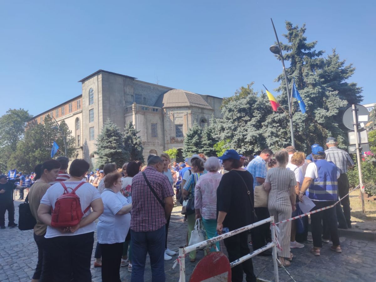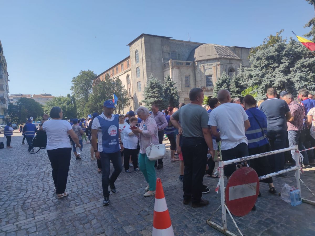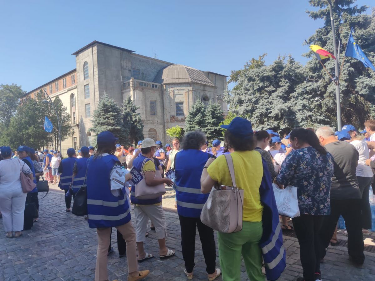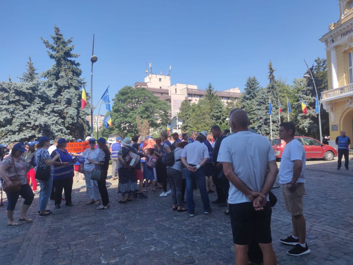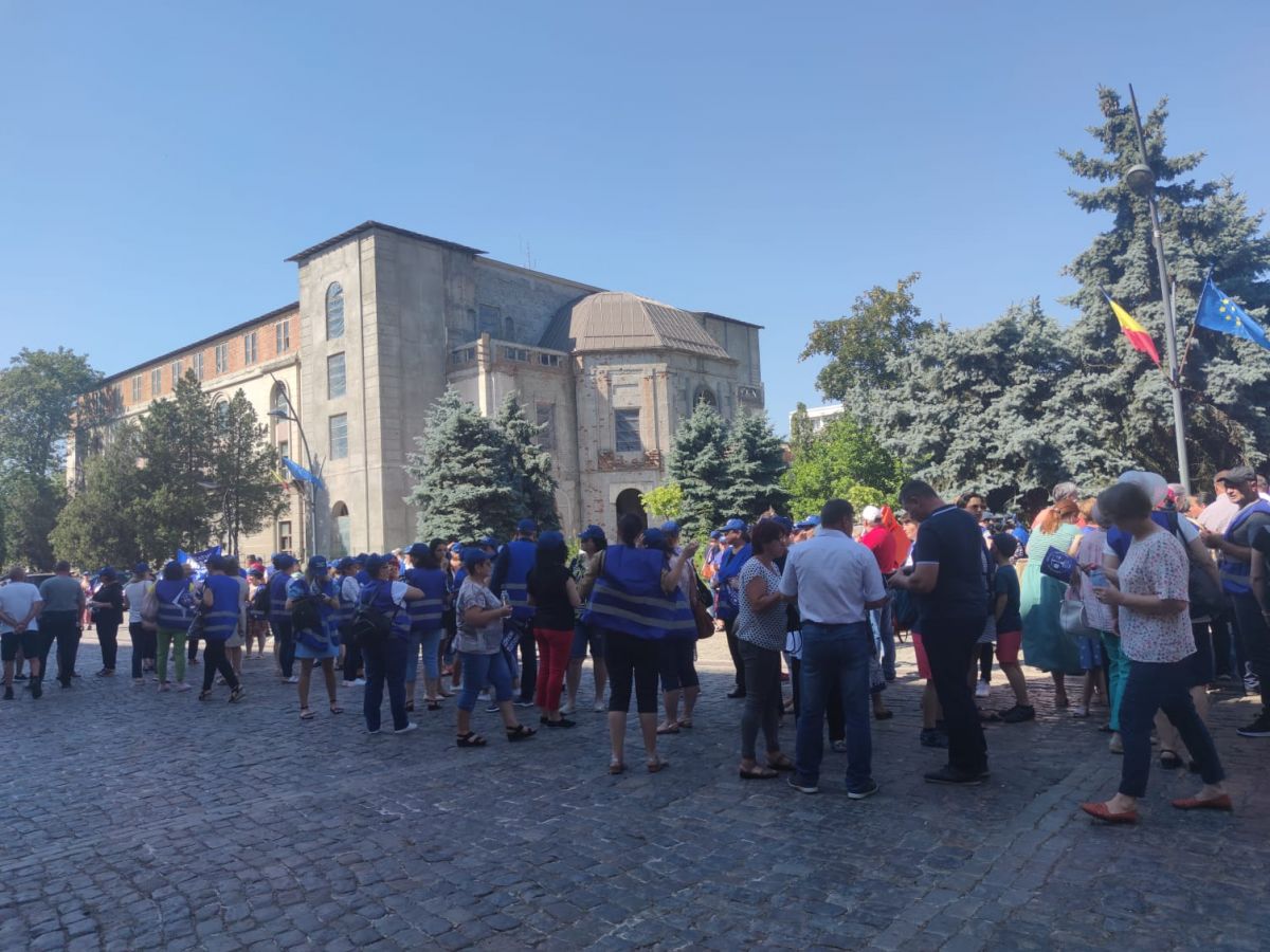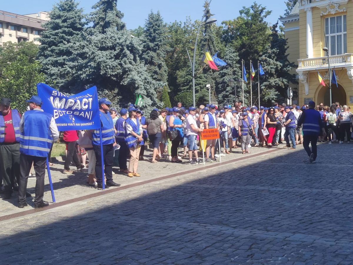 Protestează aproximativ 100 de angajați cu pancarte, stegulețe. Având în vedere vremea caniculară, s-au adus baxuri de apă pentru participanți