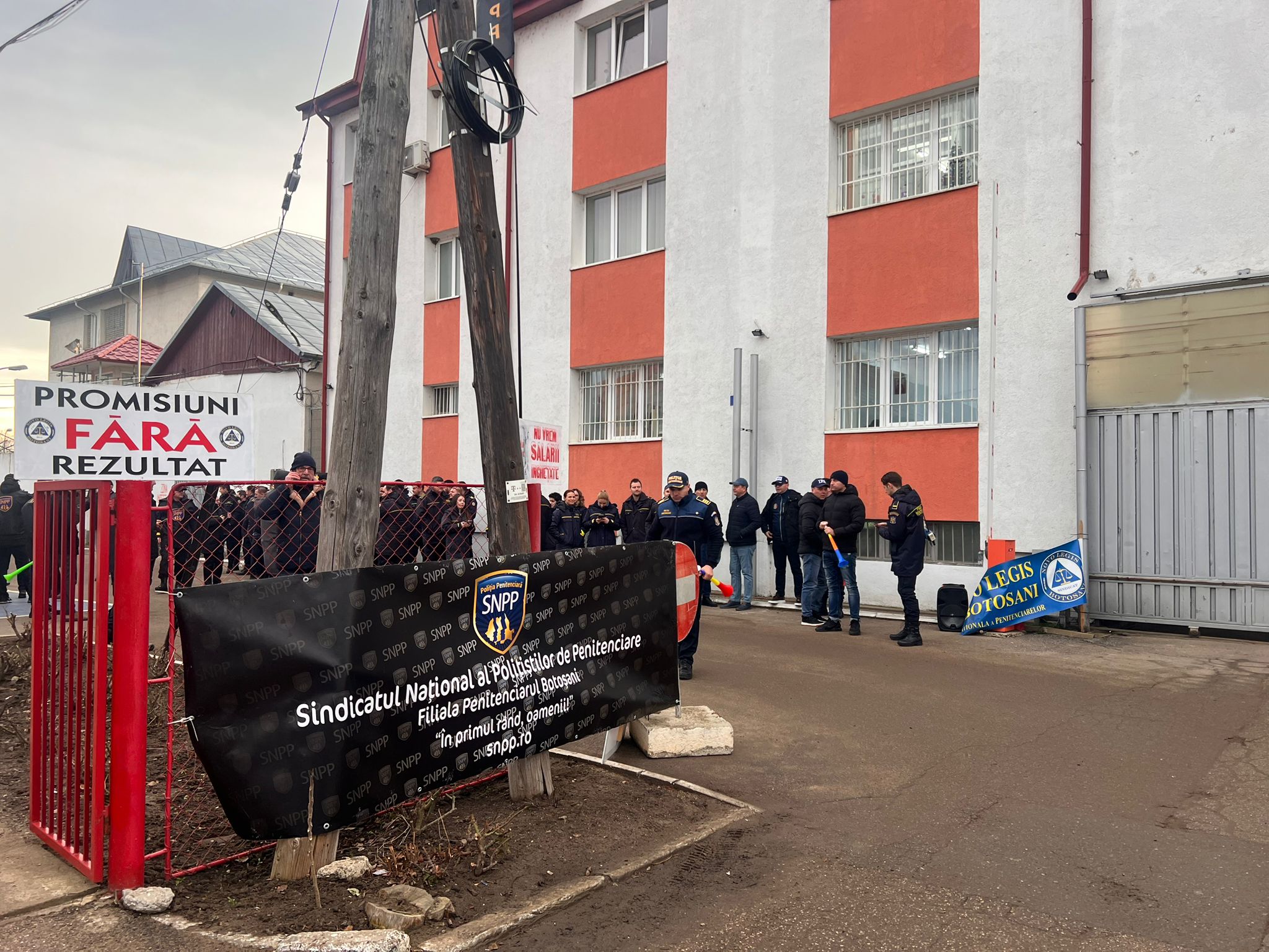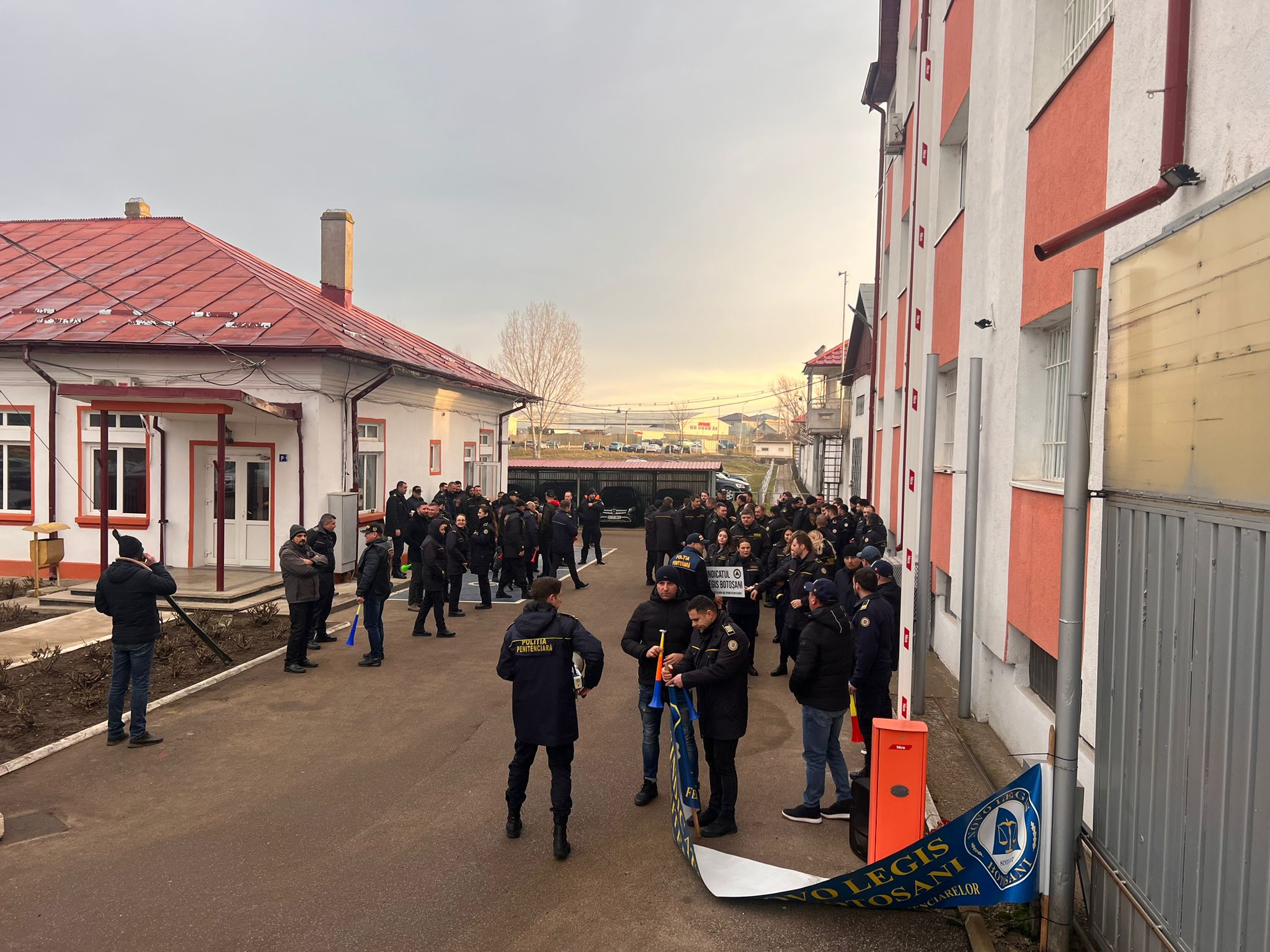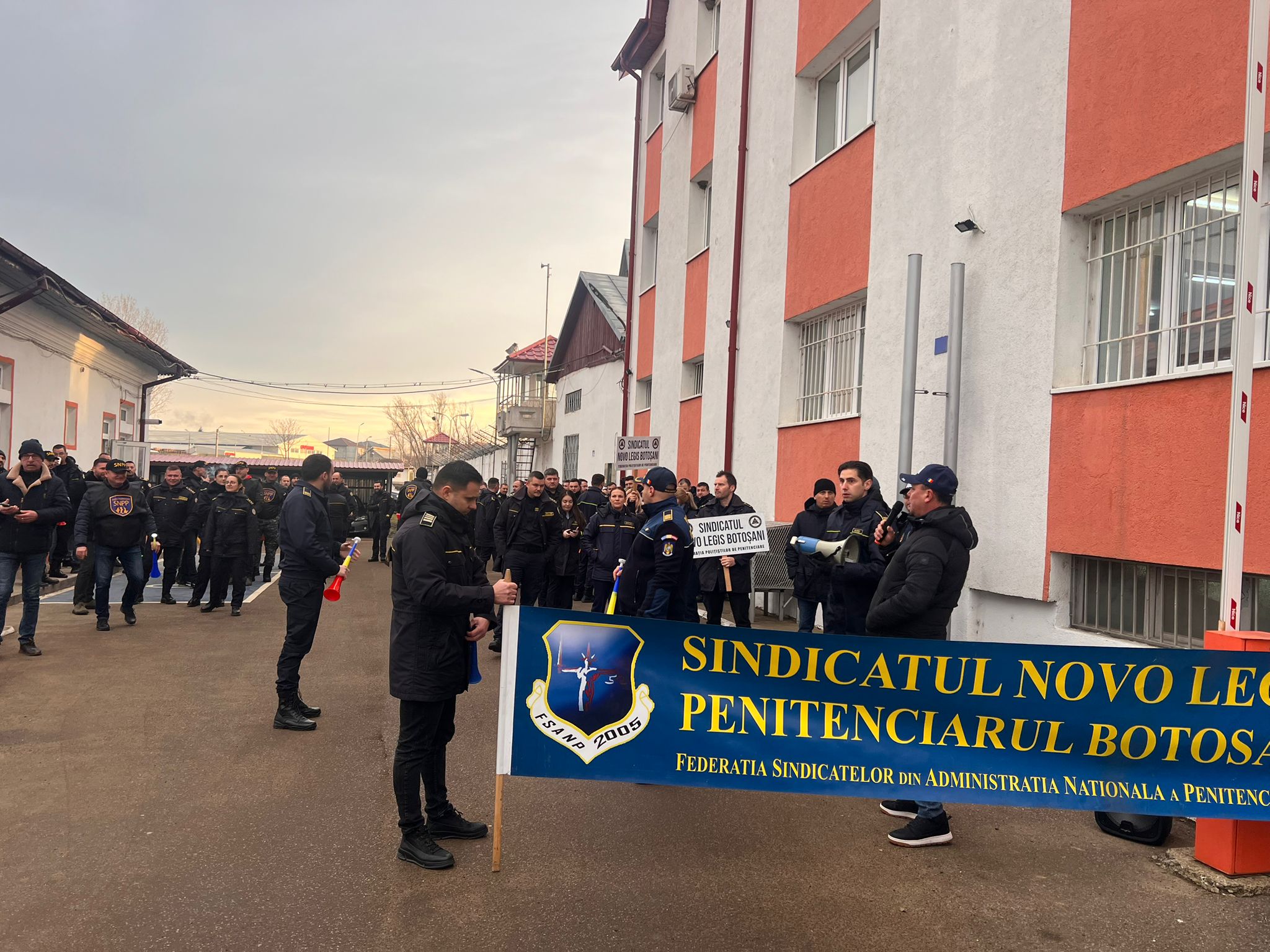 Angajații sunt adunați în fața unității de detenție și suflă în vuvuzele.