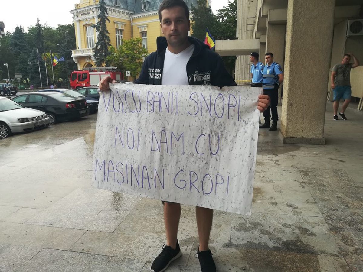 Protestatarii au venit cu vuvuzele şi pancarte. Ploaia le-a cam stricat planurile, astfel încât şi-au lăsat maşinile în parcare iar ei s-au adăpostit pe espalada Palatului Administrativ.