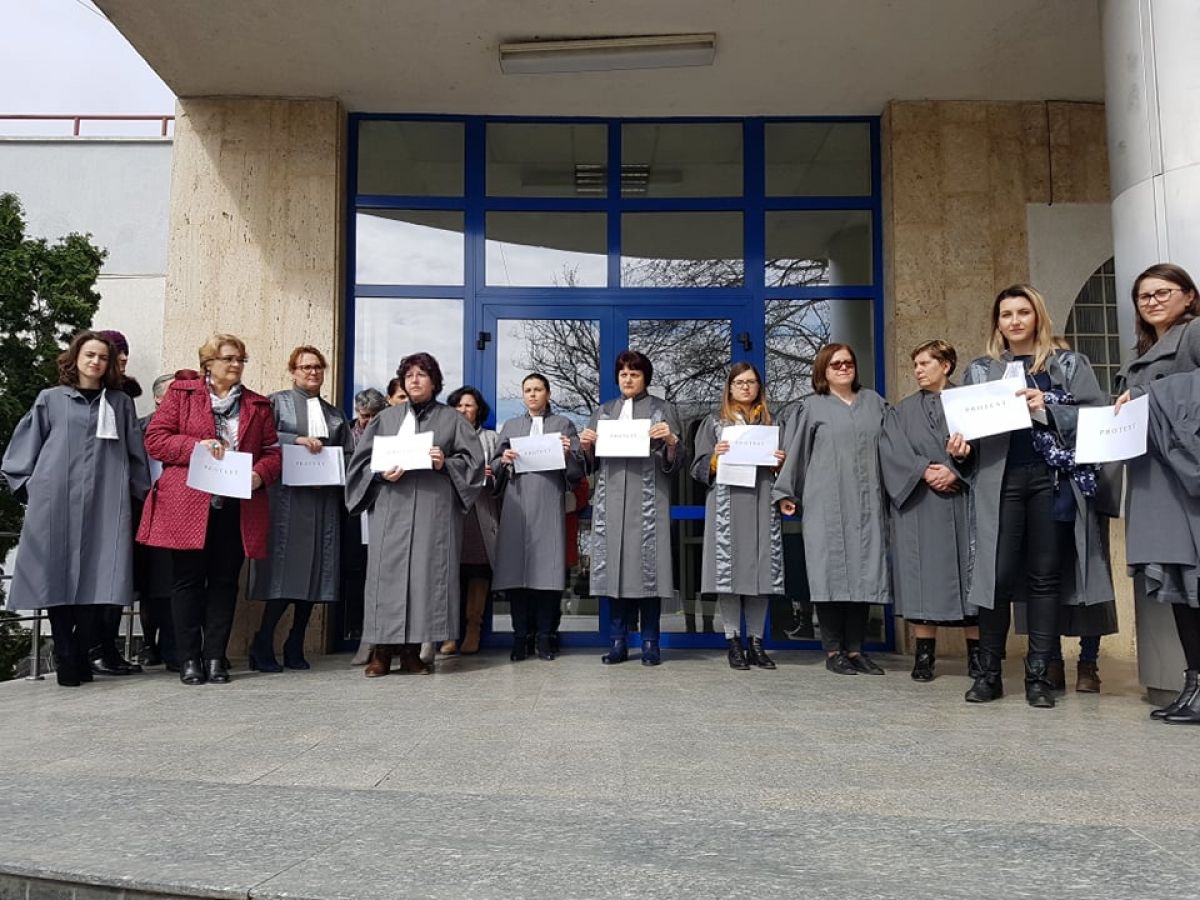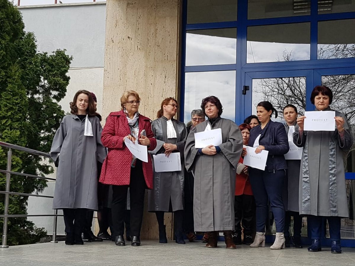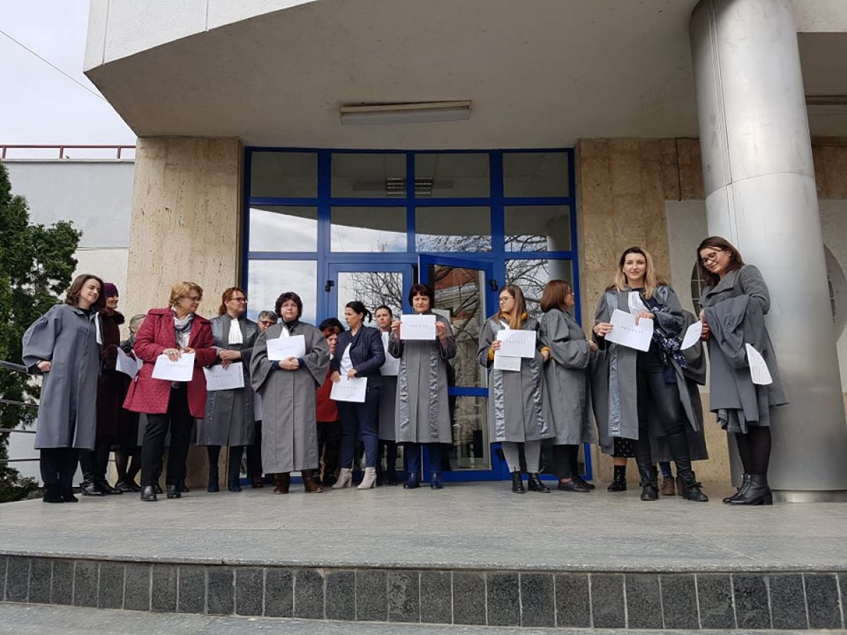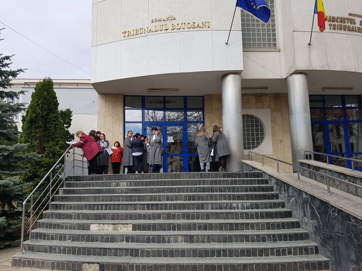 Grefierele de la Botoşani, în jur de 20 de număr, se află pe treptele Tribunalului şi ţin în mâini mici pancarte cu mesajul: Protest. Sunt nemulţumite de faptul că, de 14 ani, nu a fost adoptat nici un normativ care să le reglementeze statutul profesional.