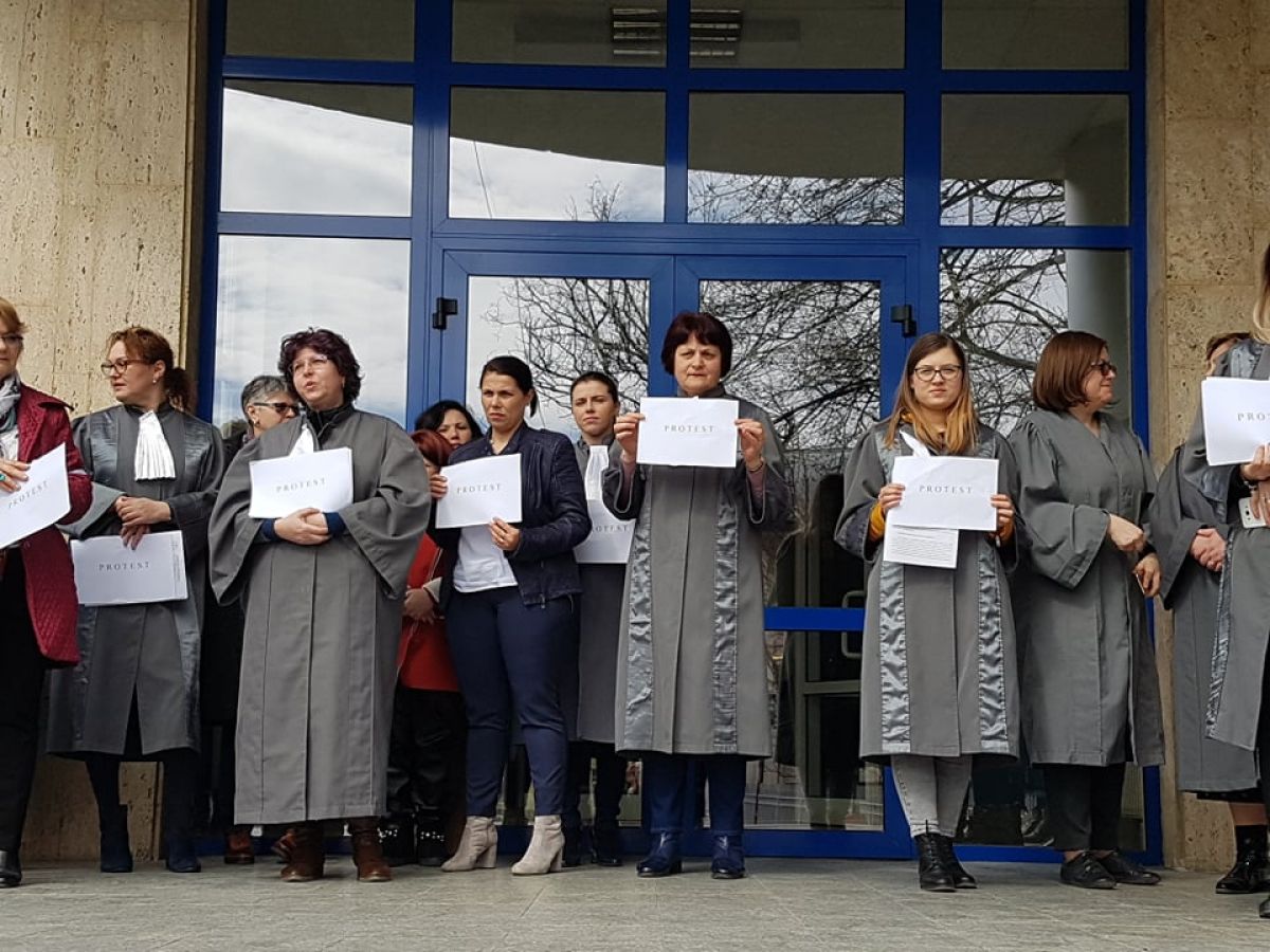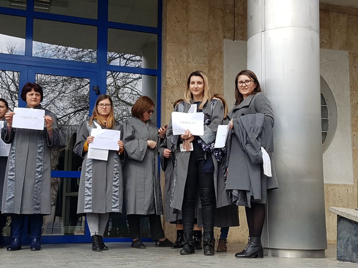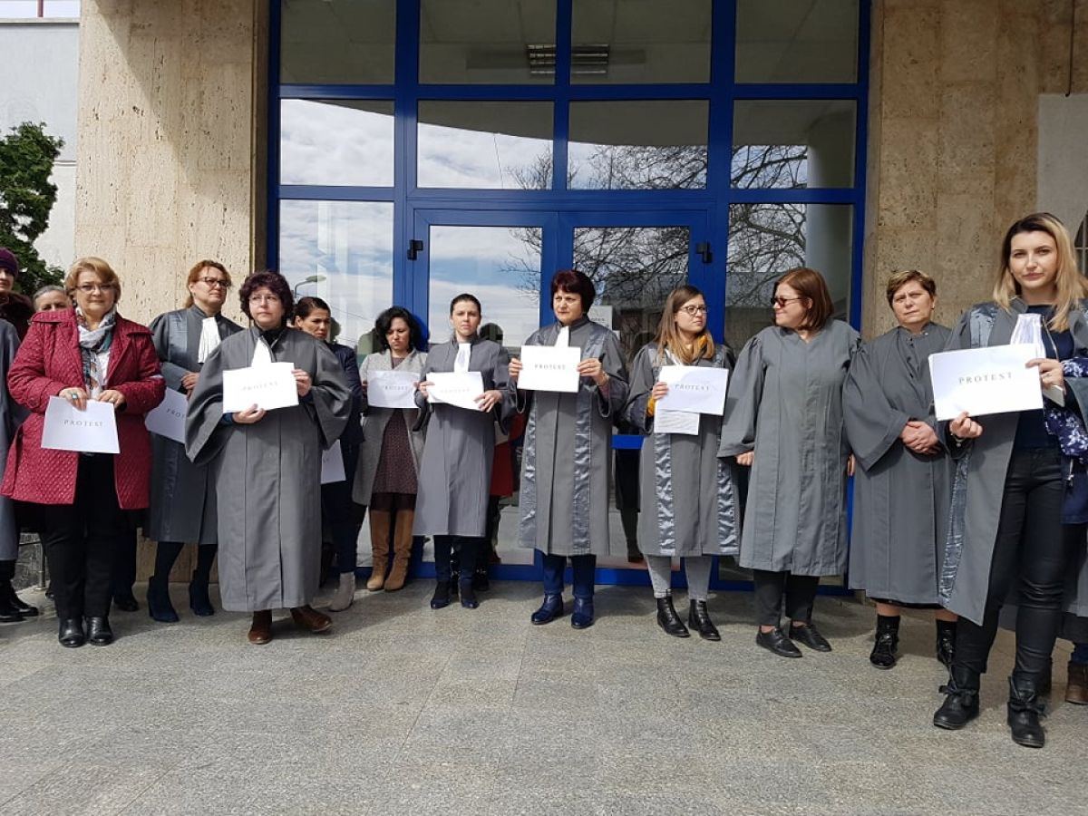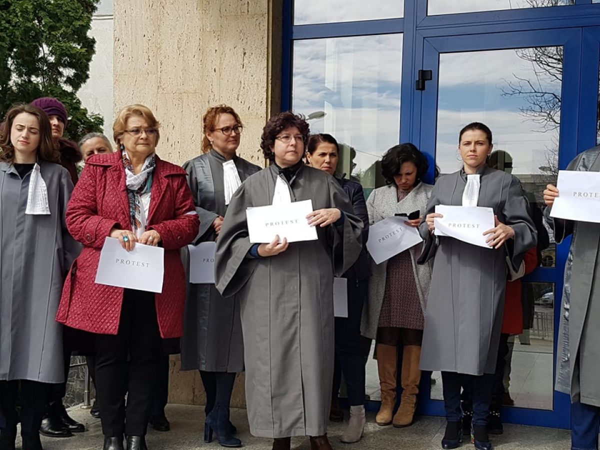 Grefierele de la Botoşani, în jur de 20 de număr, se află pe treptele Tribunalului şi ţin în mâini mici pancarte cu mesajul: Protest. Sunt nemulţumite de faptul că, de 14 ani, nu a fost adoptat nici un normativ care să le reglementeze statutul profesional.