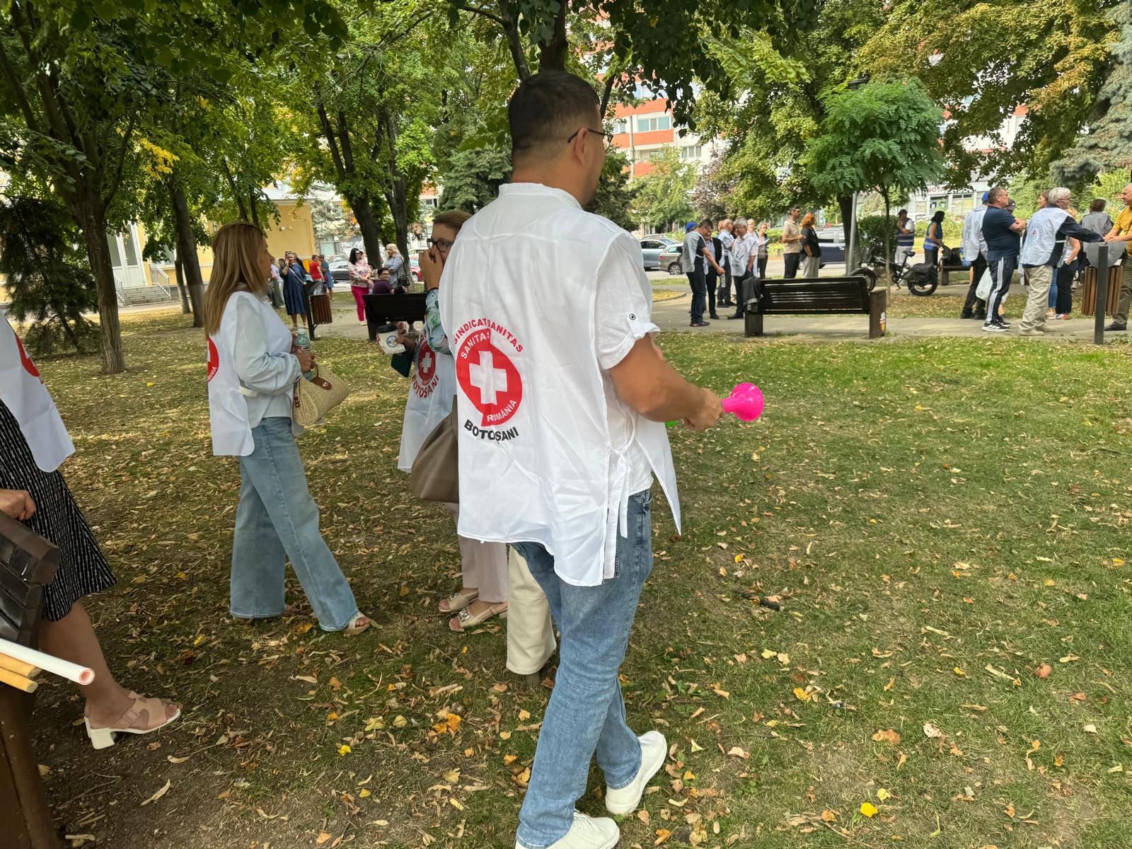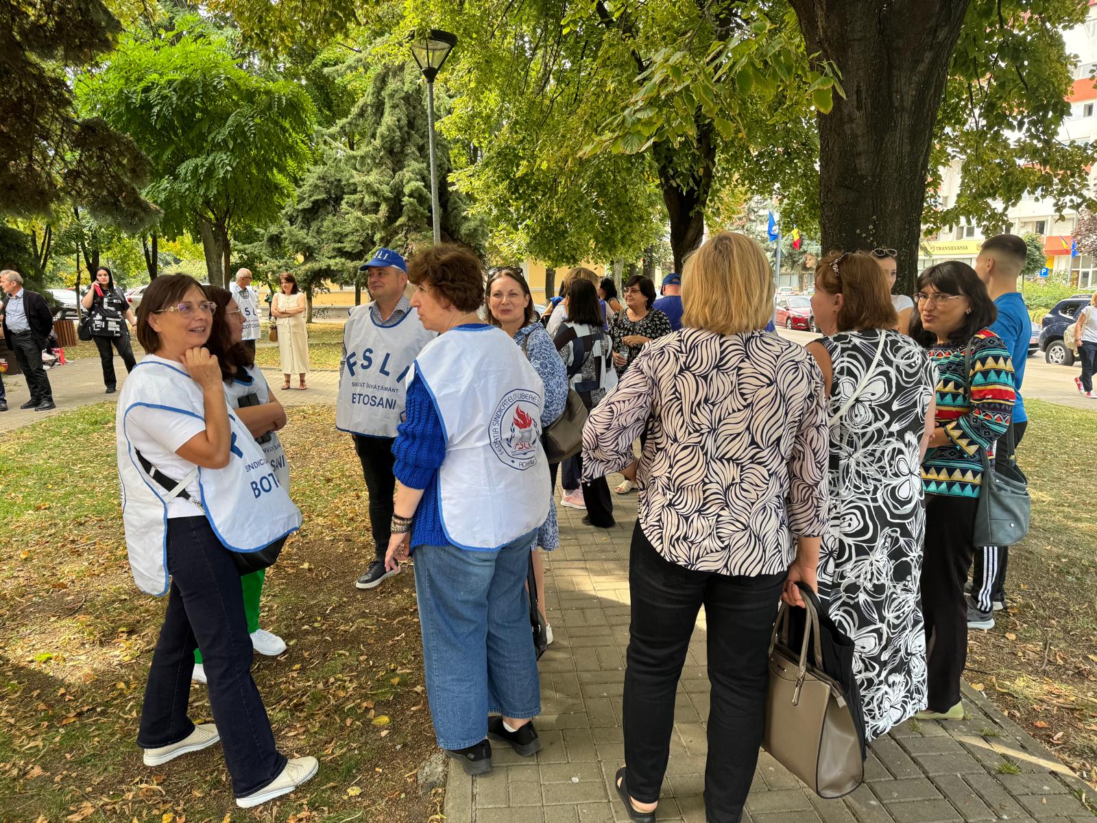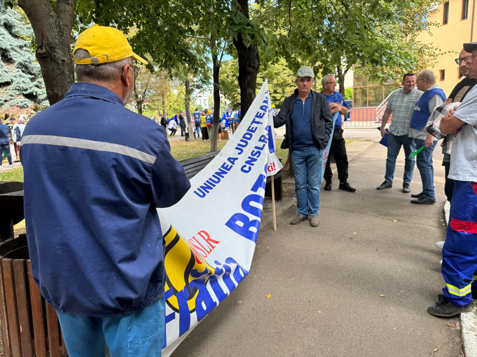 Cei aproximativ 150 de protestatari au vuvuzele, veste, pancarte și șepci. Cei mai mulți dintre participanți stau răsfirați în parcul din spatele sediului PSD Botoșani.