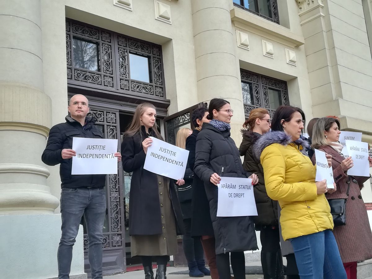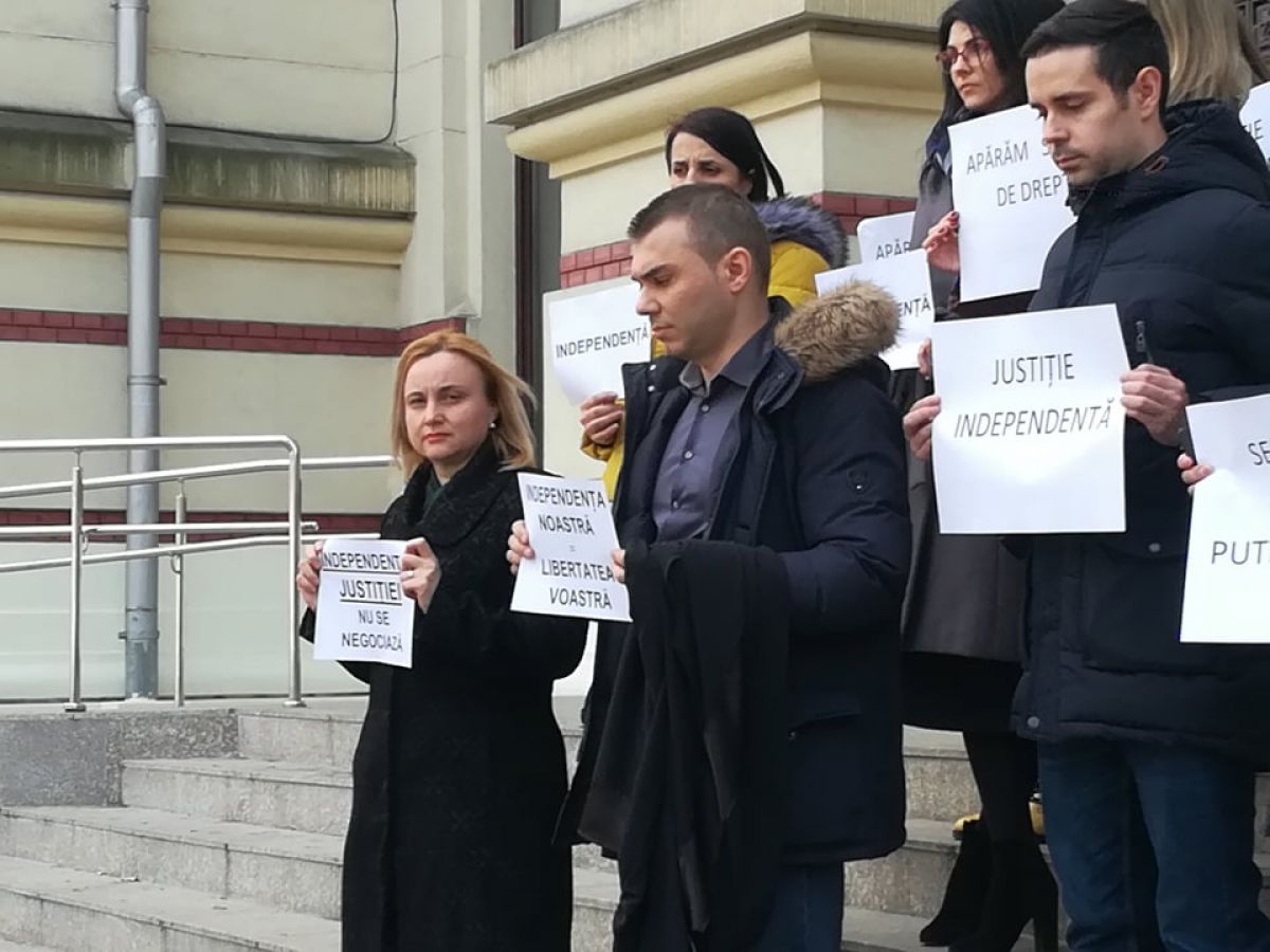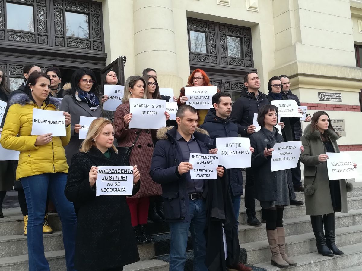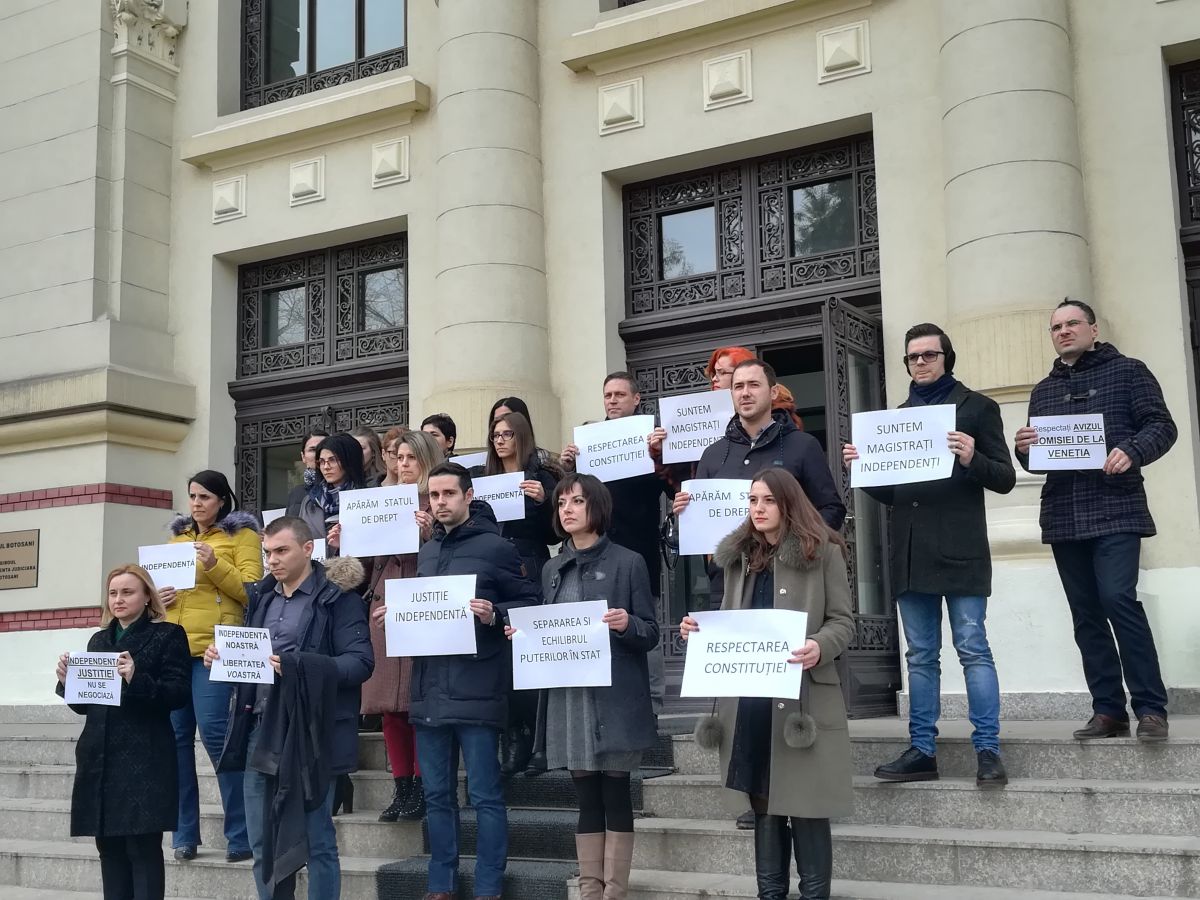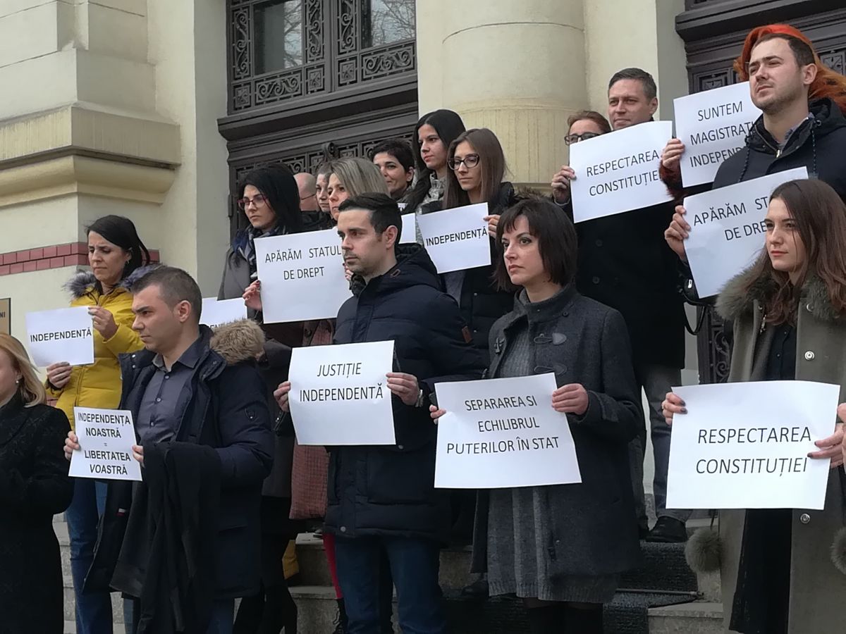 Participă la protest judecători și procurori de la Botoșani care au în mâini pancarte cu diverse lozinci: „Apărăm statul de drept”, ”Justiție Independentă”, ”Suntem magistrați independenți”, „Respectarea Constituției”.