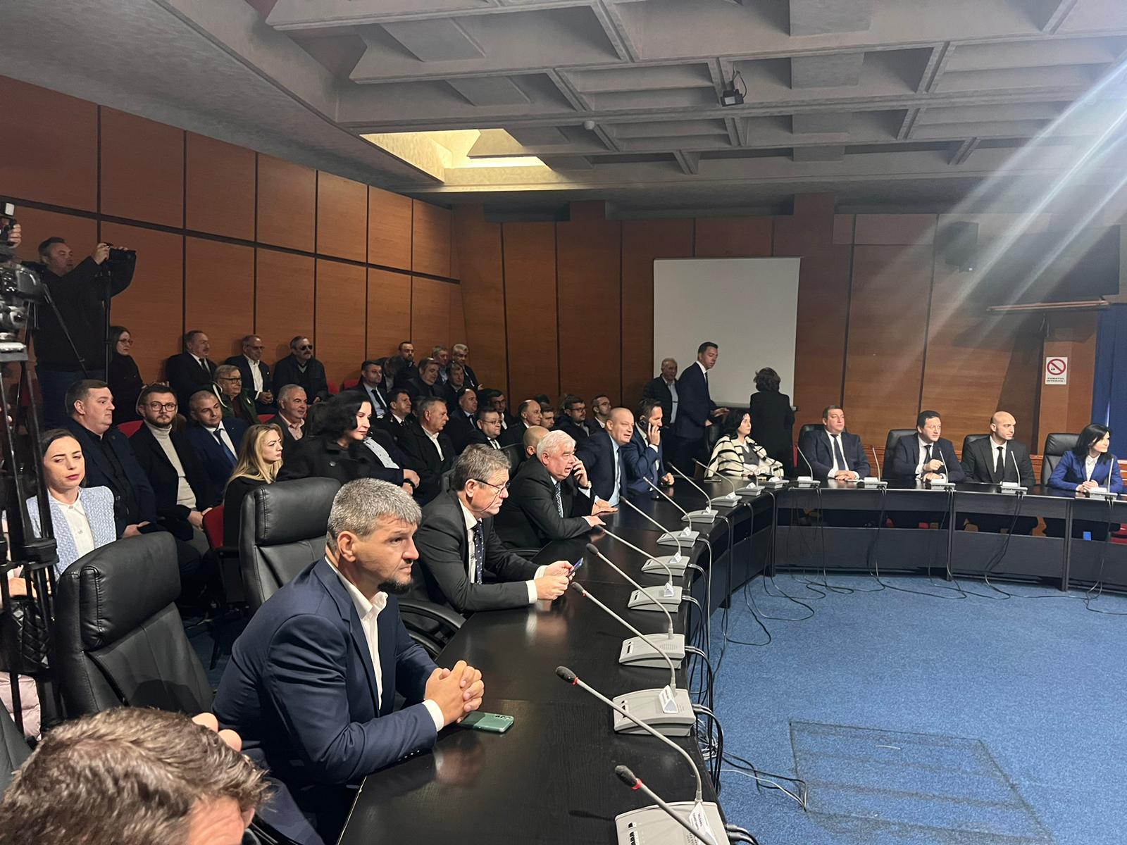 Se află în sală directori de instituții publice, primari, funcționari din aparatul de specialitate a Consiliului Județean, parlamentari, dar și lideri ai celor două partide.