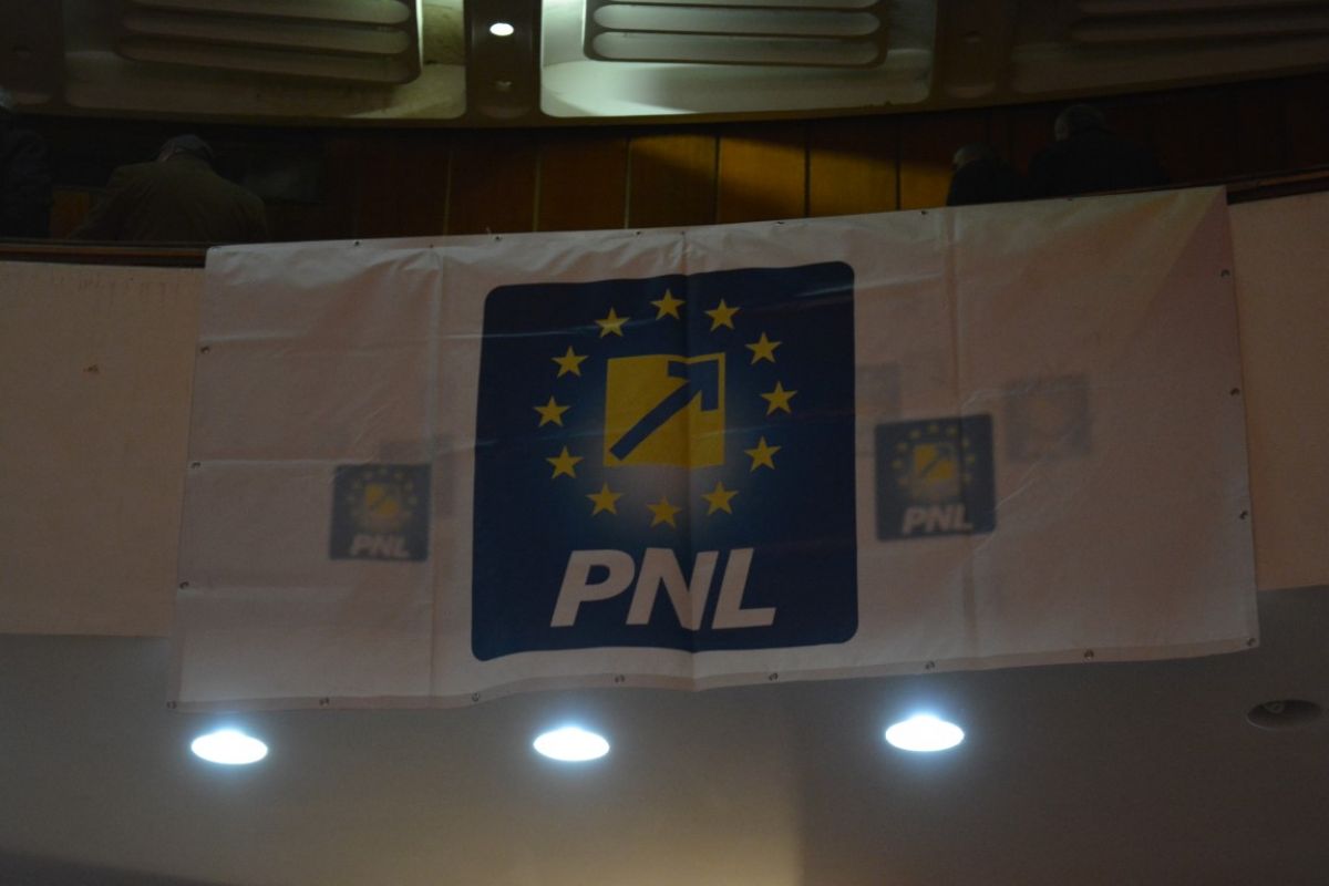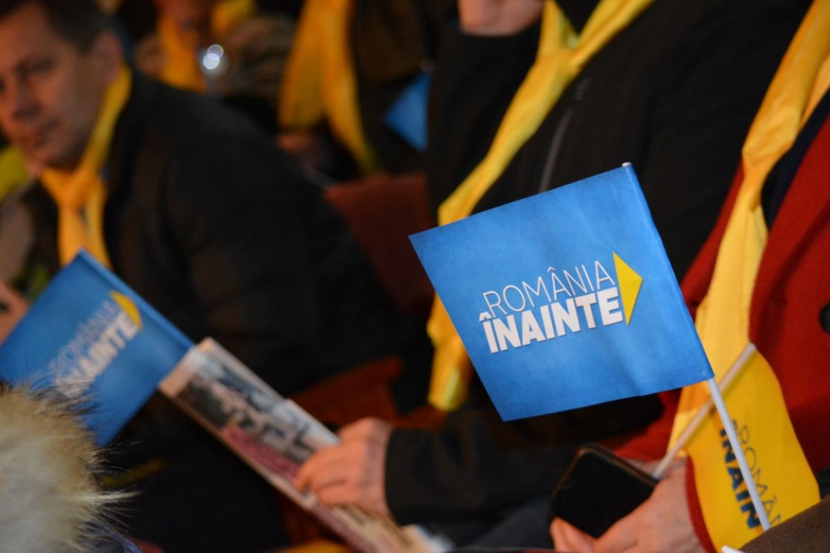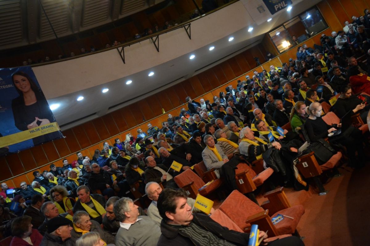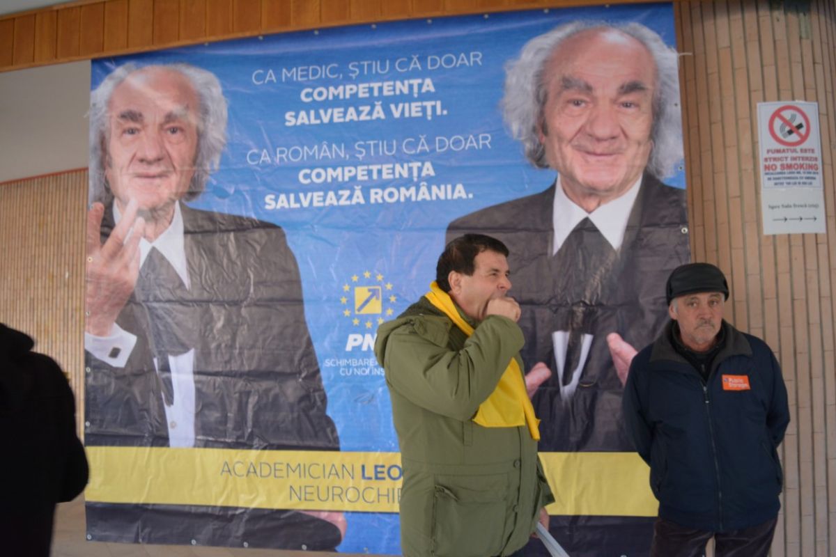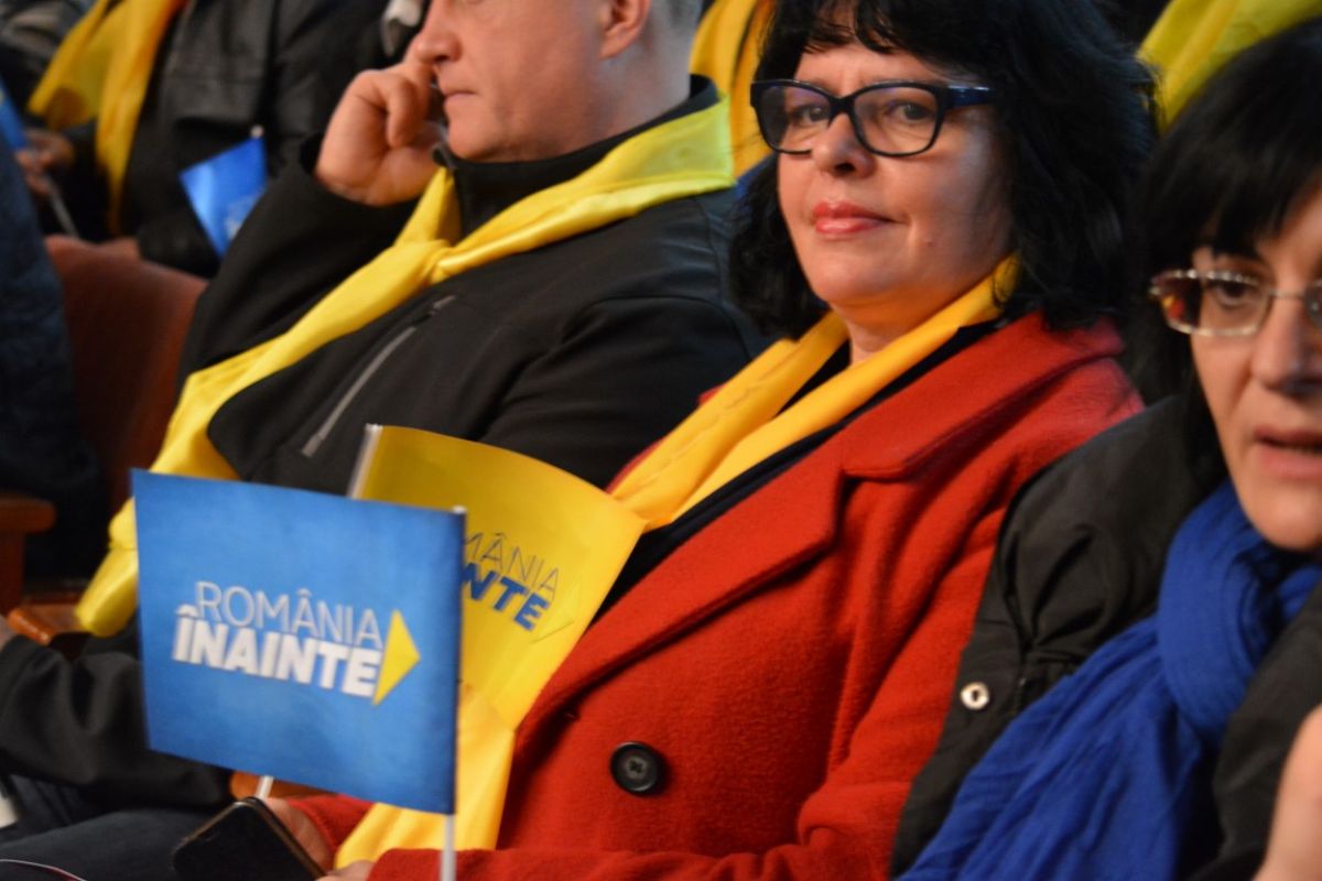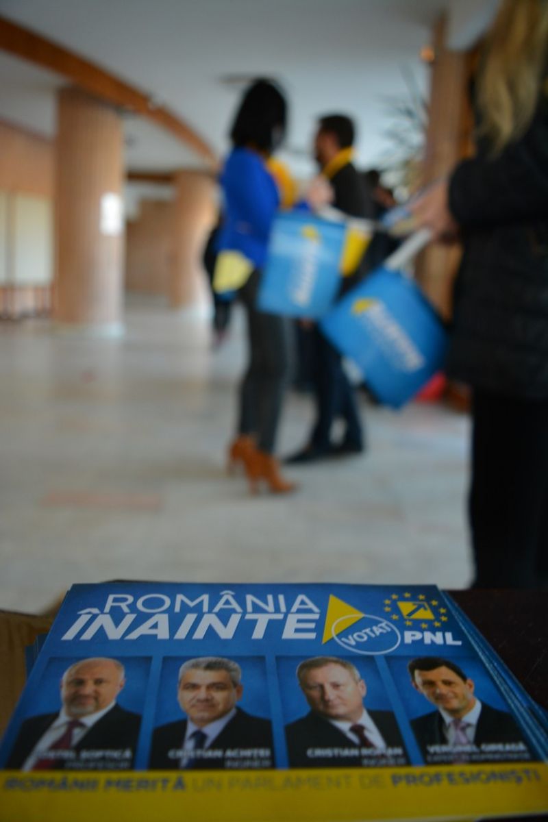 Toți cei care au intrat în instituția de cultură au primit stegulețe și mici pliante cu candidații de la lista PNL pentru Parlamentul României. Pe scenă stau așezate mai multe scaune și un banner mare cu mesajul ”România înainte”.