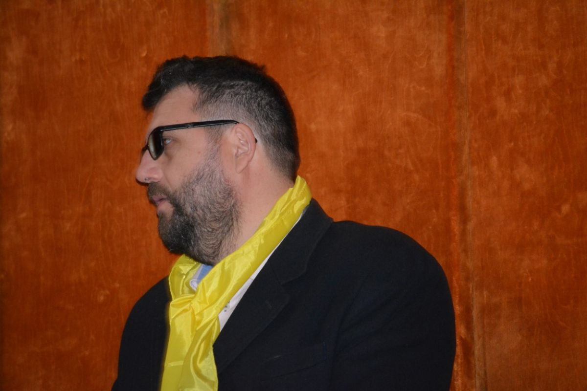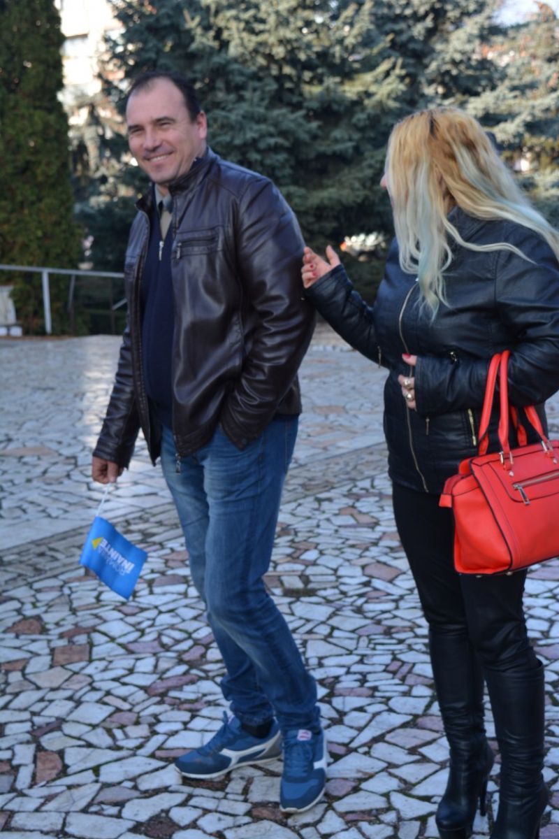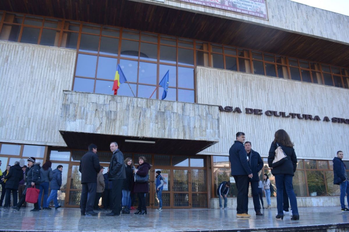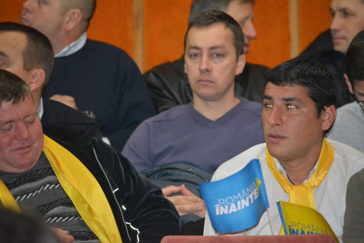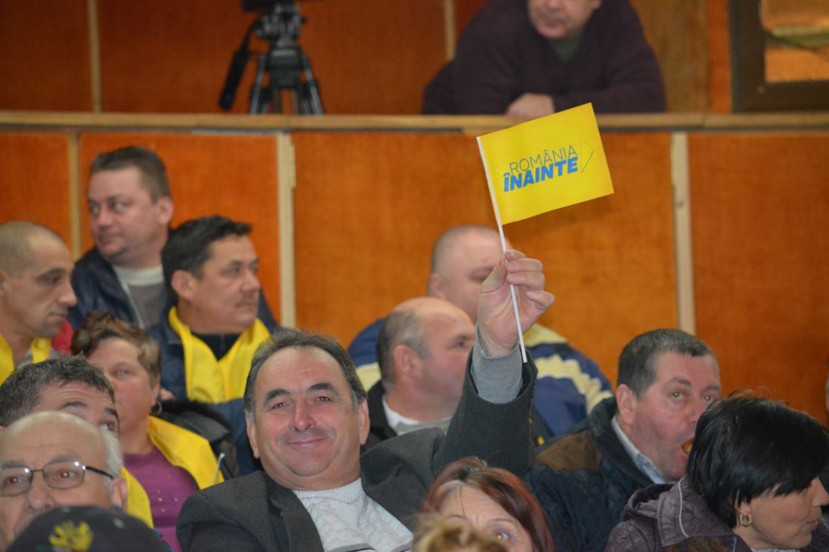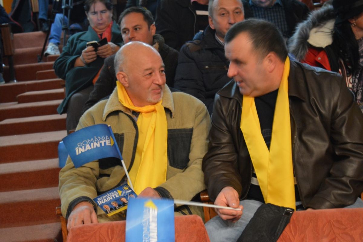 Toți cei care au intrat în instituția de cultură au primit stegulețe și mici pliante cu candidații de la lista PNL pentru Parlamentul României. Pe scenă stau așezate mai multe scaune și un banner mare cu mesajul ”România înainte”.