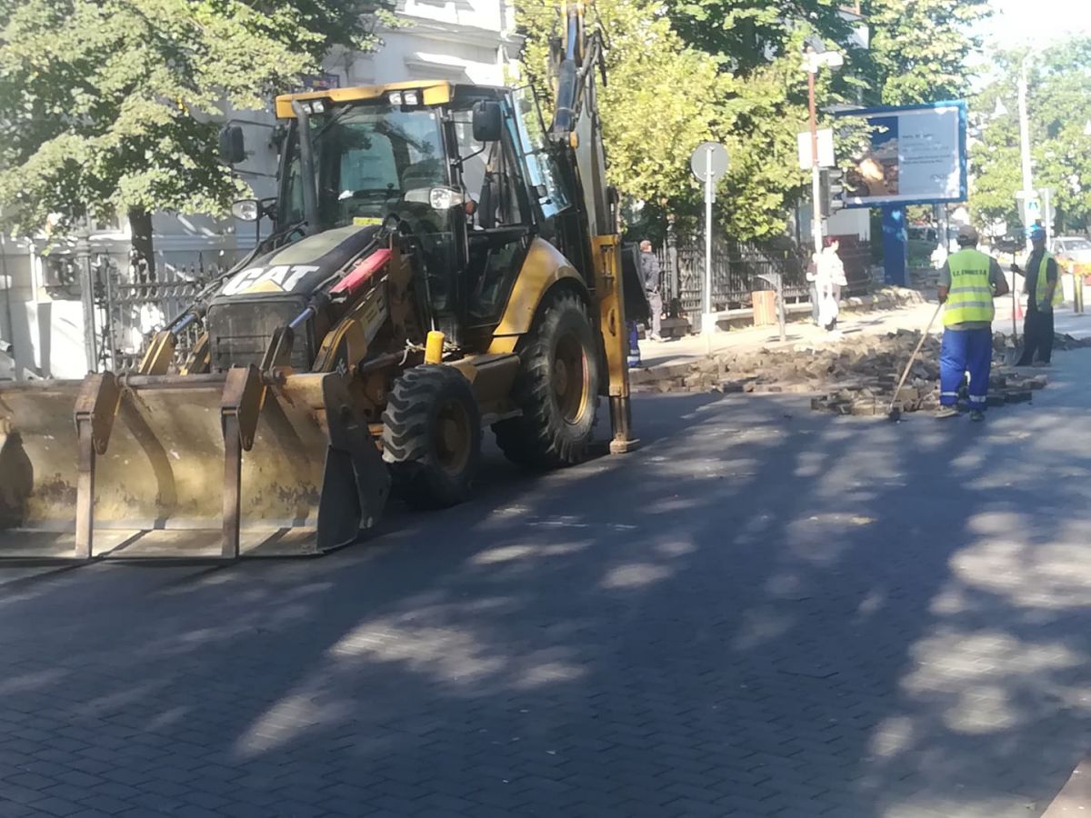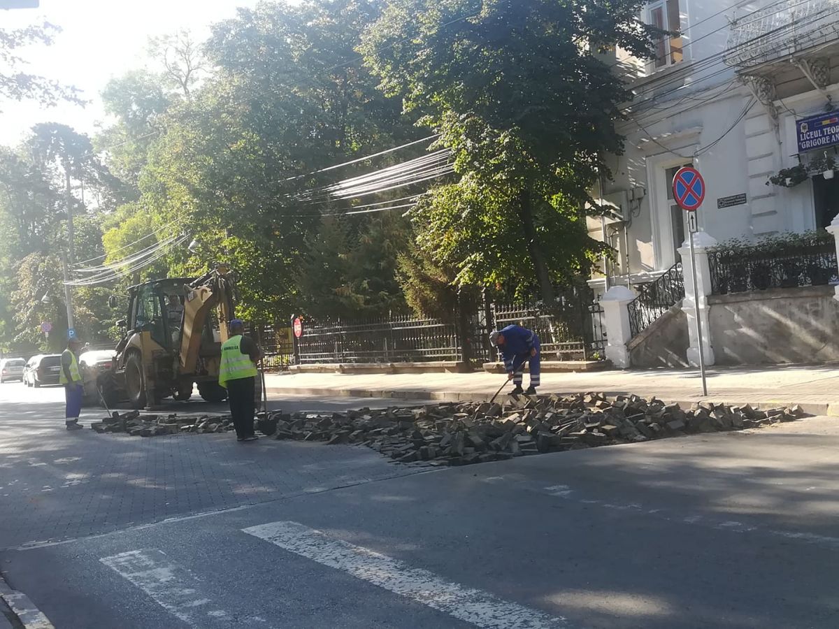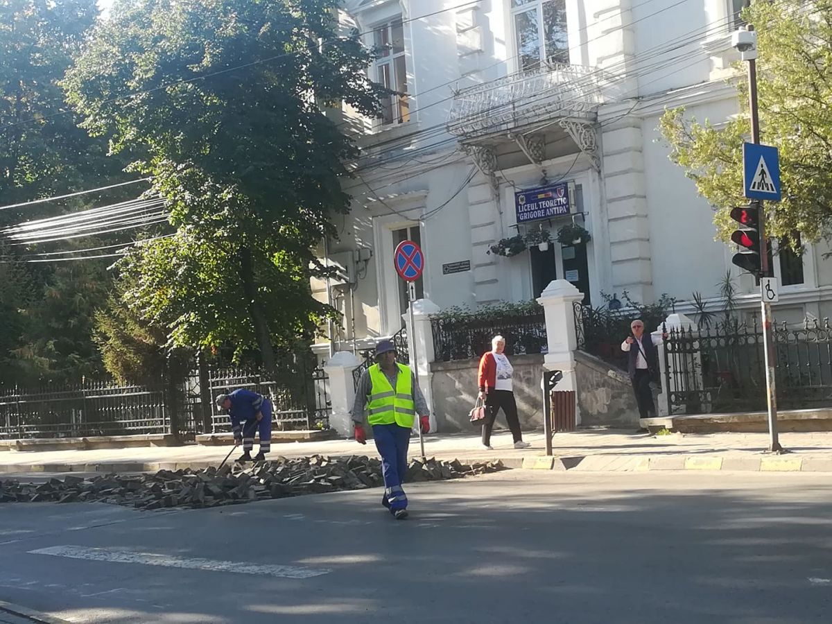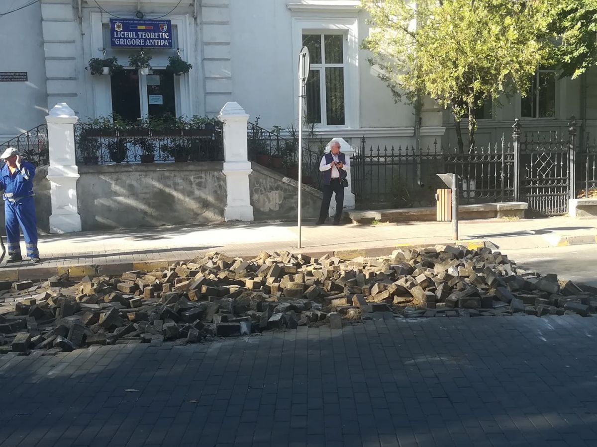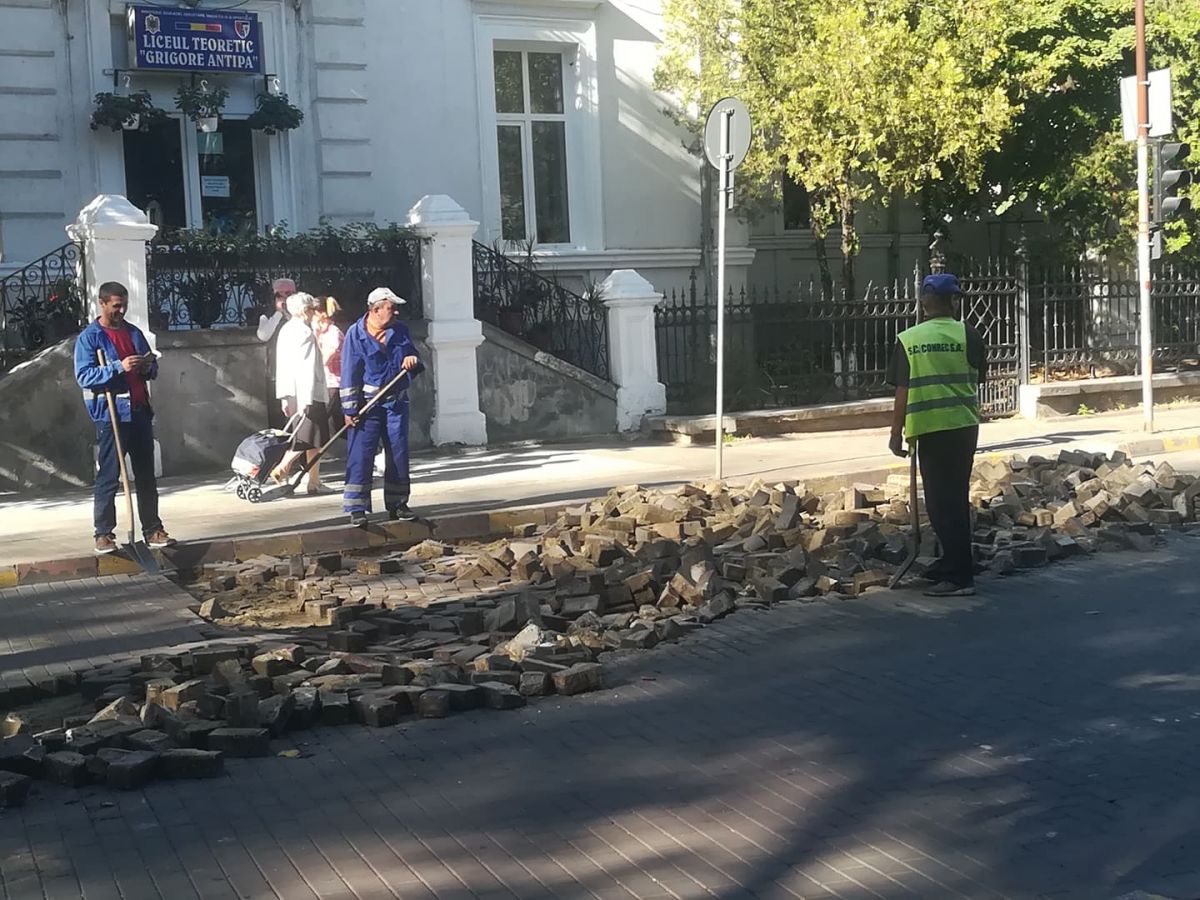 Muncitorii de la Conrec scot pavelele de pe Bulevardul Mihai Eminescu, din fața Liceului Teoretic ”Grigore Antipa”. În locul pavelelor, municipalitatea a decis că se va turna asfalt.