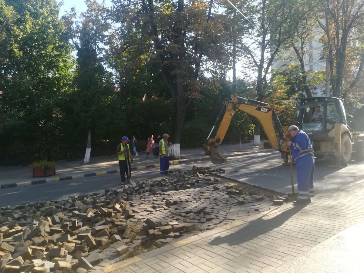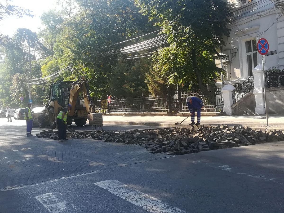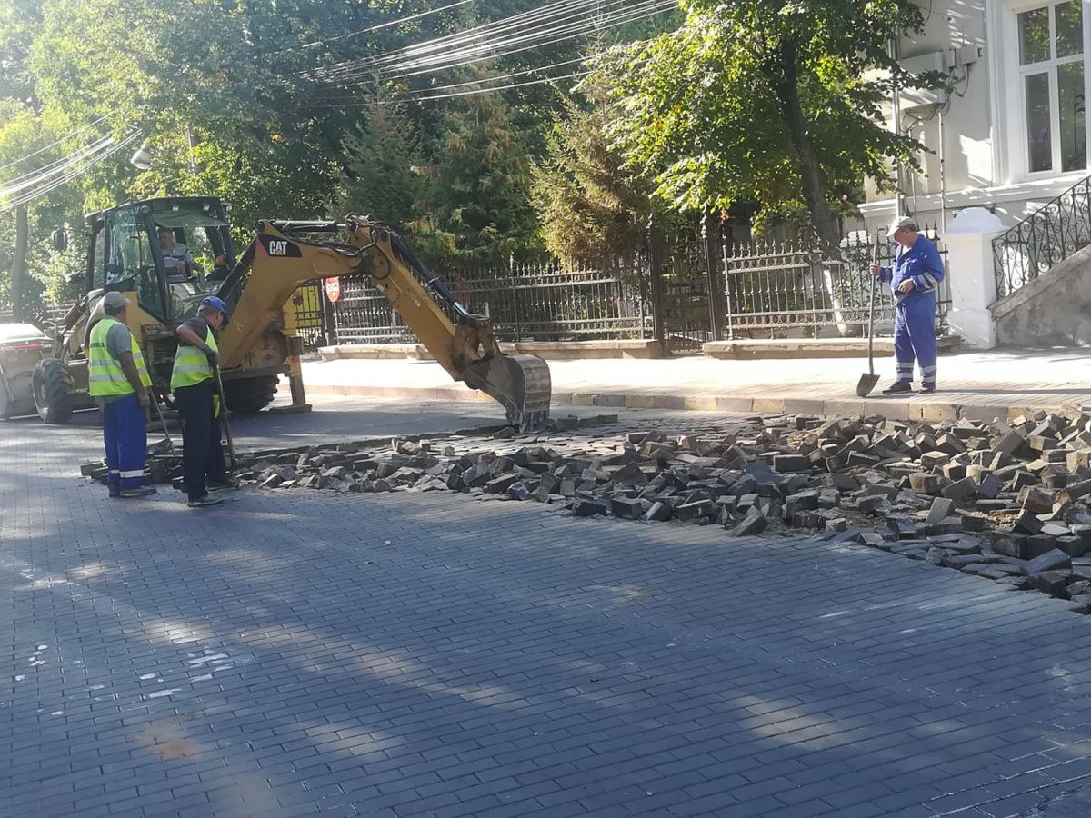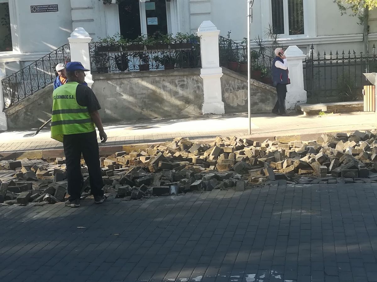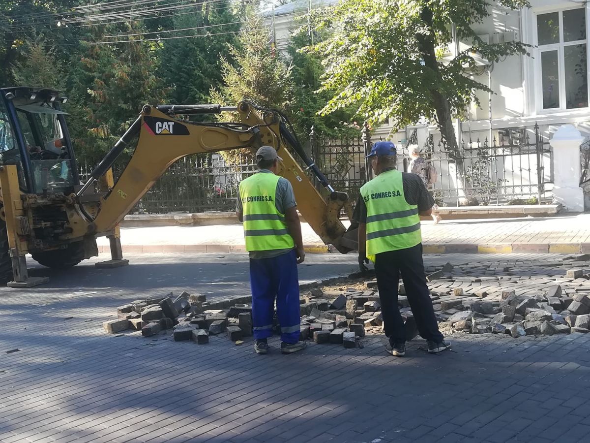 Muncitorii de la Conrec scot pavelele de pe Bulevardul Mihai Eminescu, din fața Liceului Teoretic ”Grigore Antipa”. În locul pavelelor, municipalitatea a decis că se va turna asfalt.