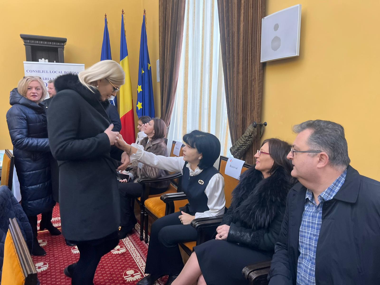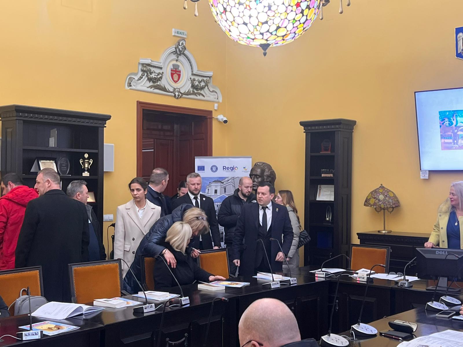 Revenind la ceremonia de astăzi, consilierii locali au început deja să își ocupe locurile la masa. În sală mai sunt prezenți parlamentarii Doina Federovici, Marius Budăi, Cătălin Silegeanu, Ariadna Cîrligeanu, „subprefectele” Paula Berențan și Cristina Breșug, dar și consilierul județean Ciprian Ignătescu de la AUR.