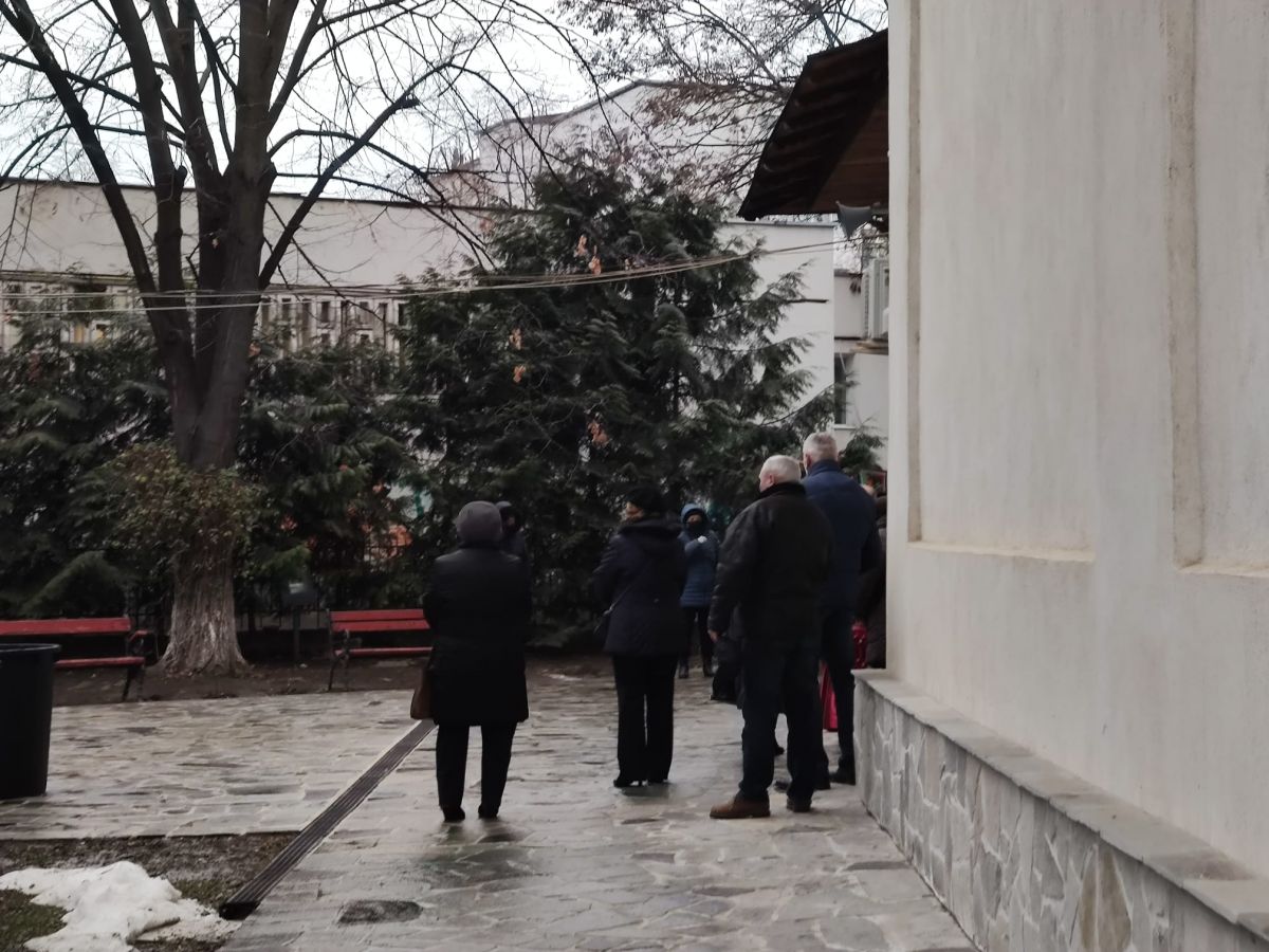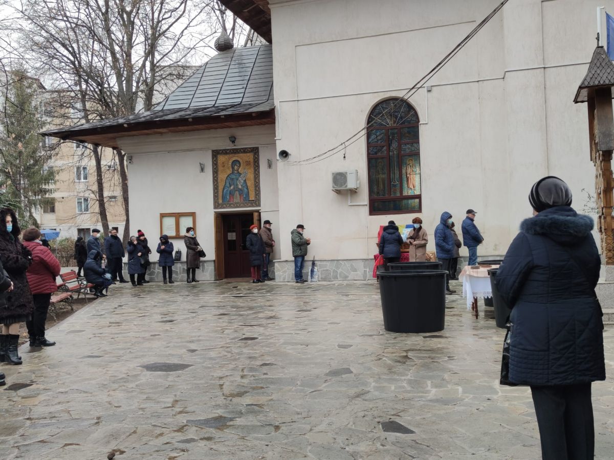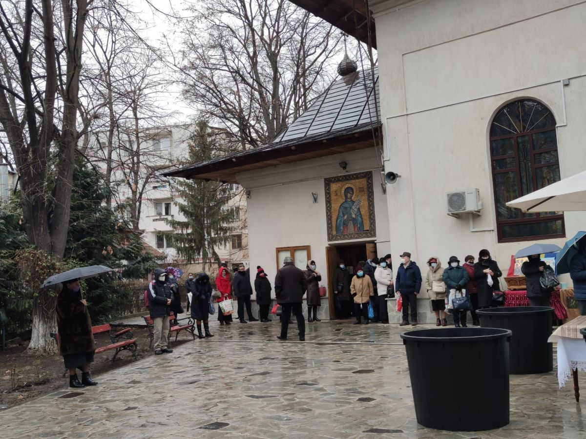 Oamenii așteaptă cu răbdare ca preoții să sfințească apa, respectând totodată și regulile de protecție socială.