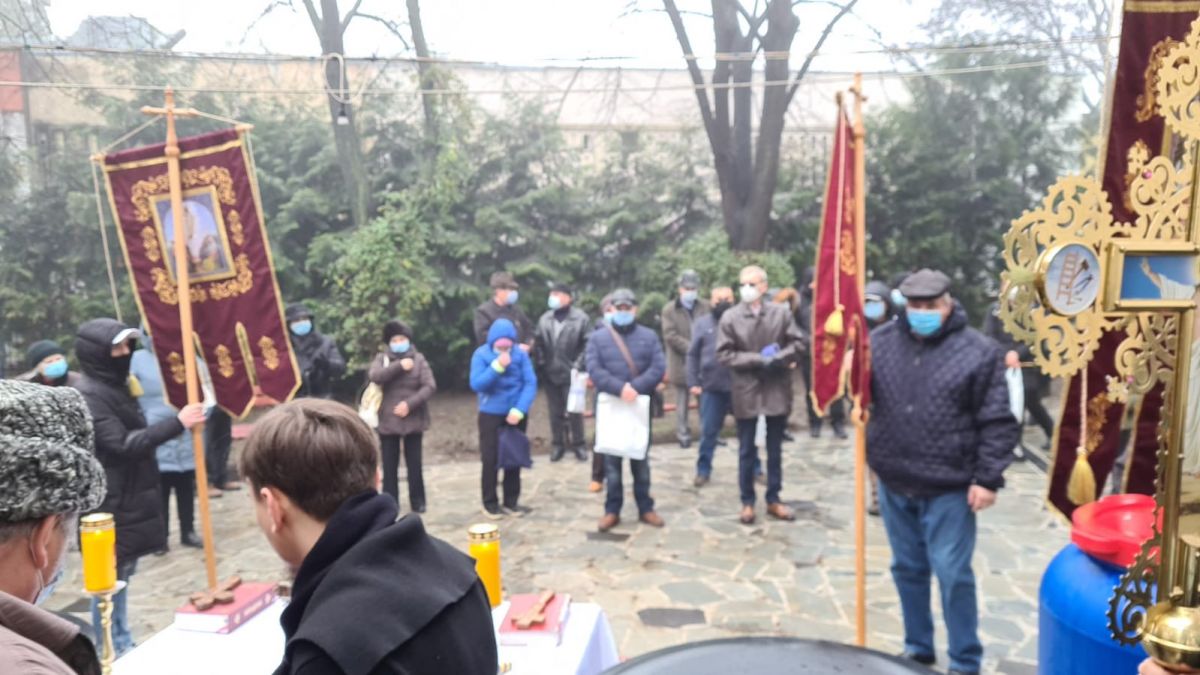 De câteva momente s-a terminat Sfânta Liturghie oficiată în biserică, iar preotul a ieșit afară pentru oficierea slujbei de sfințire a apei.