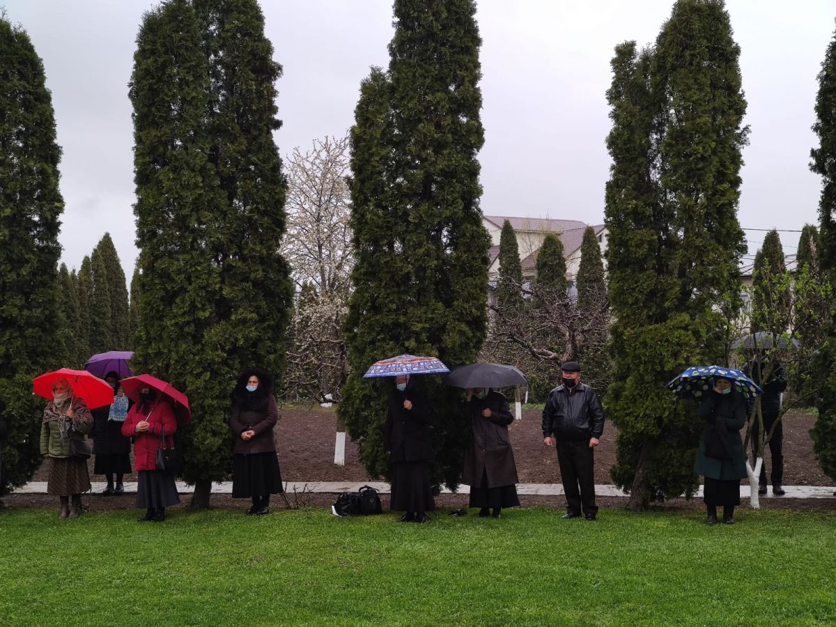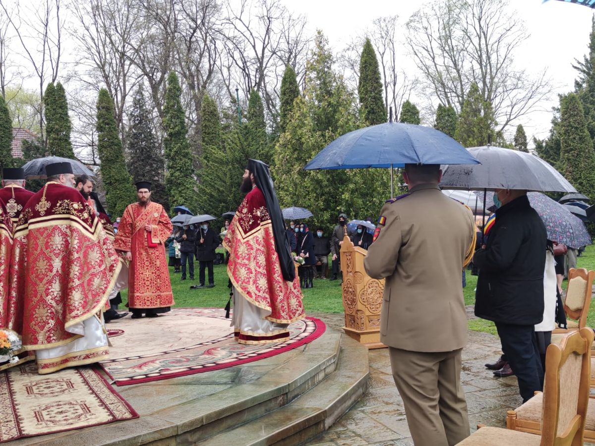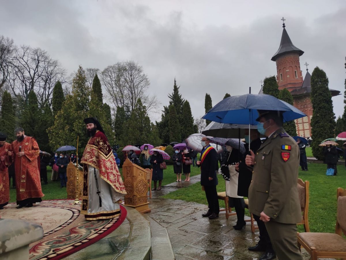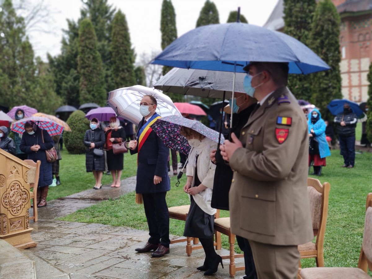 Credincioșii stau răsfirați prin curtea lăcașului de cult, adăpostiți sub umbrele atât ei, cât și oficialitățile orașului.