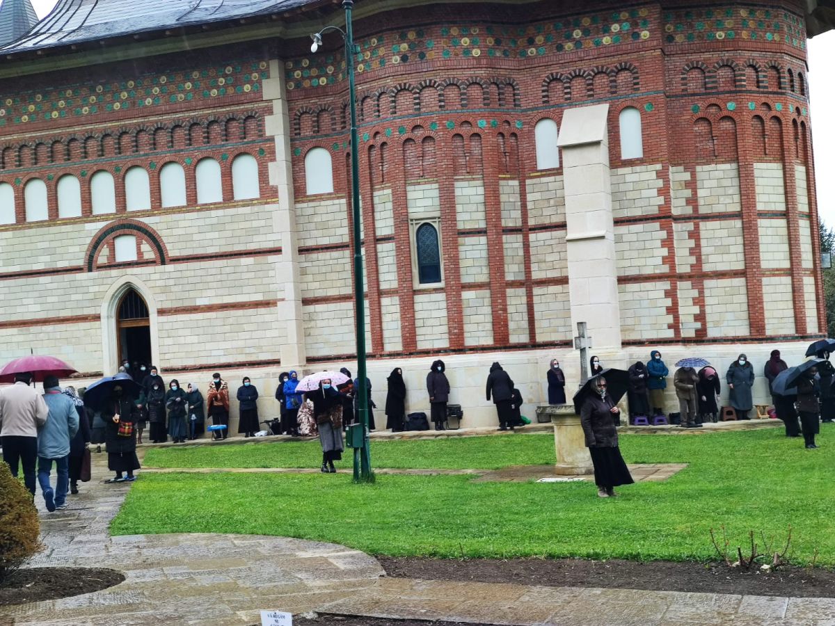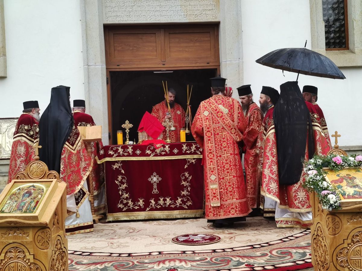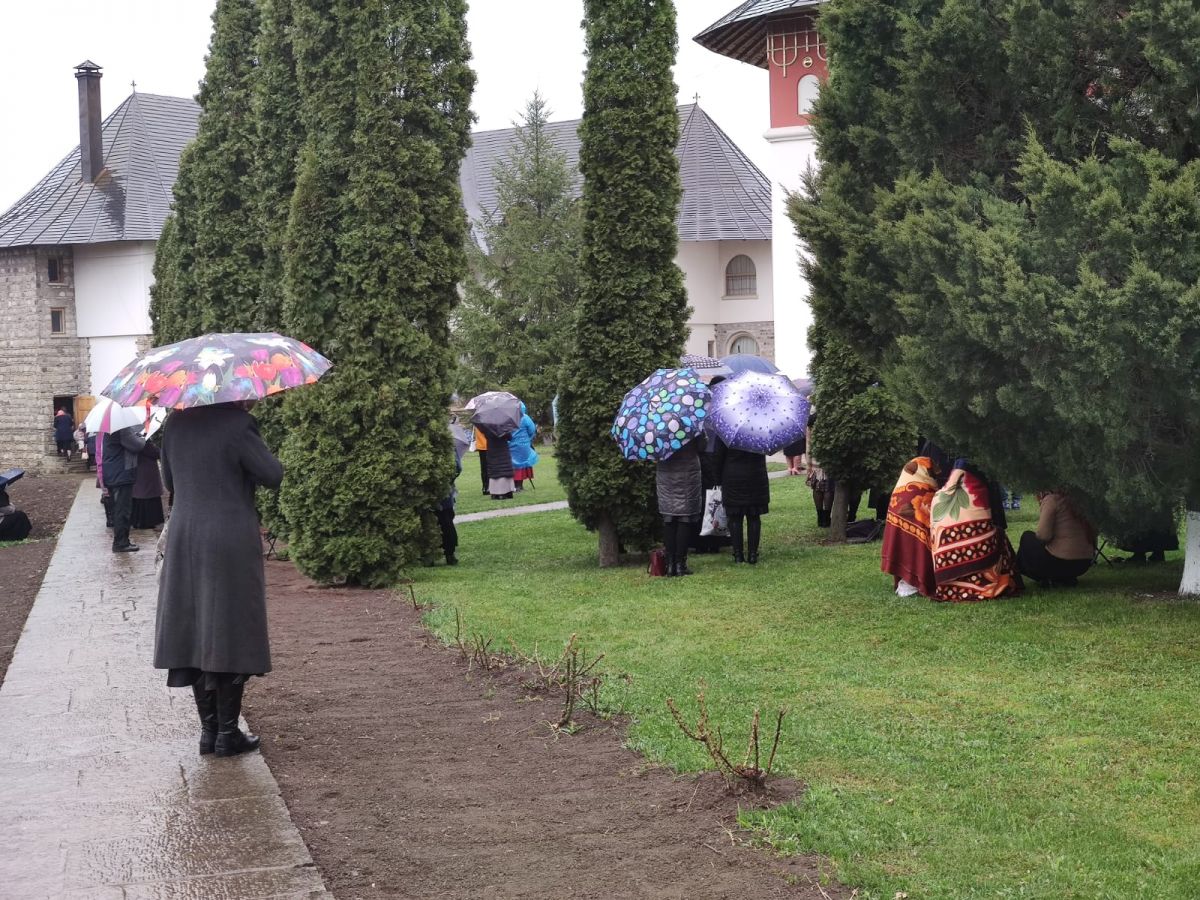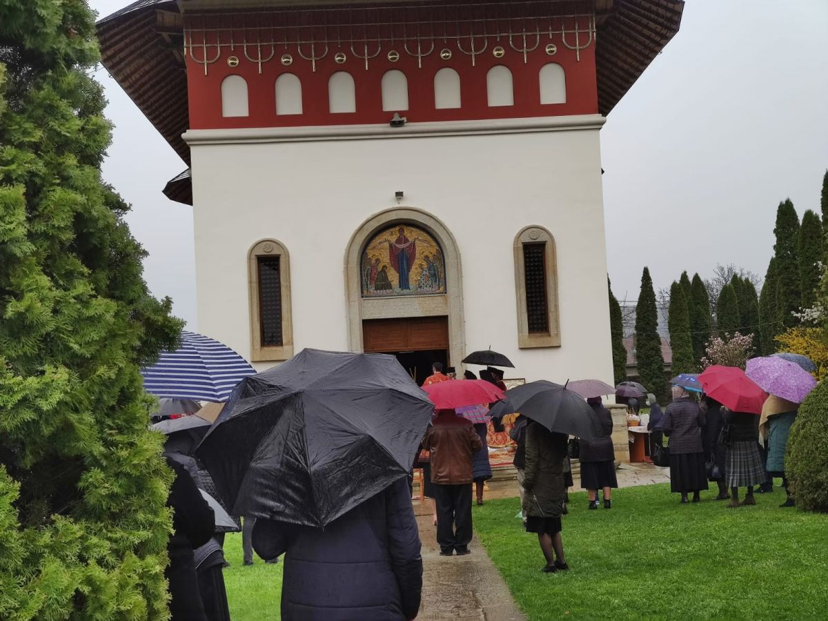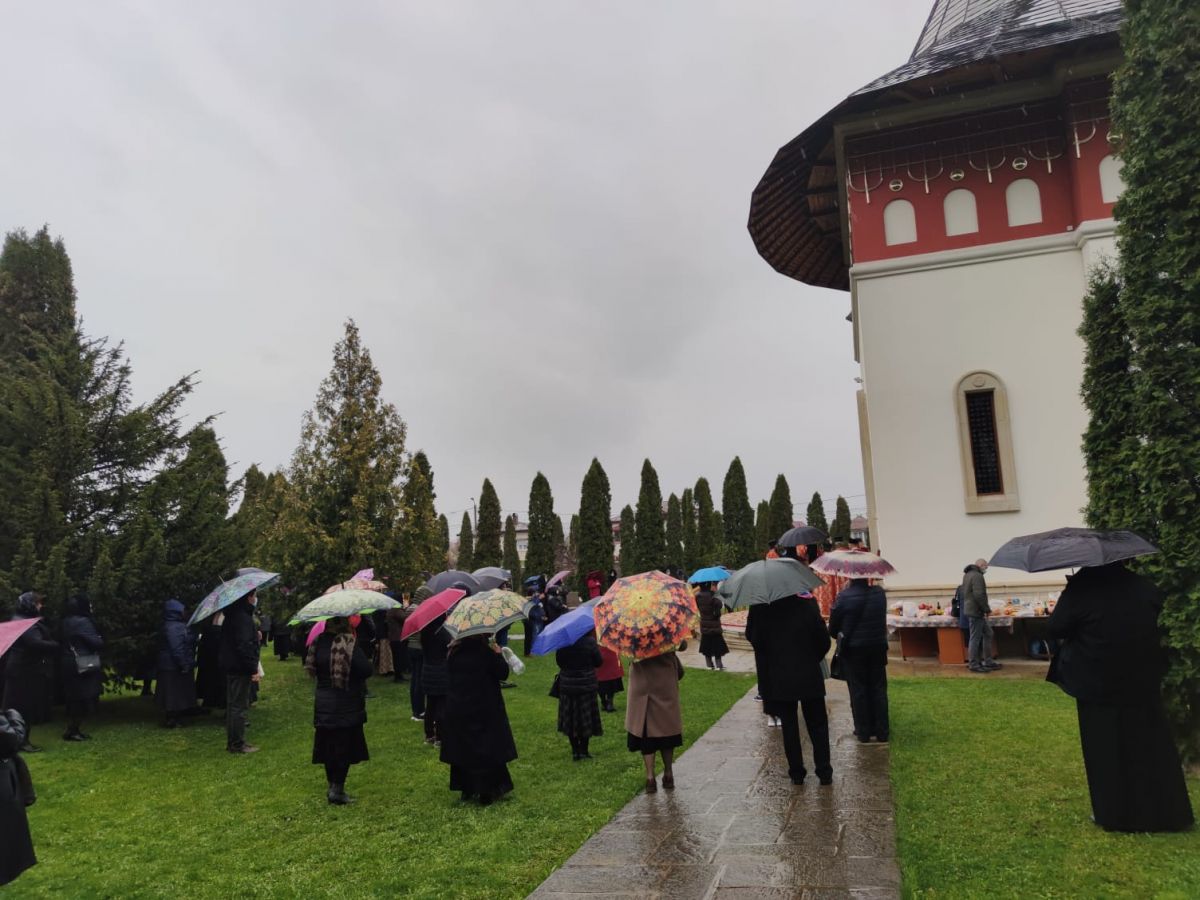 Slujba religioasă se desfășoară afară, credincioșii fiind nevoiți să înfrunte ploaia care a început să cadă în această dimineață.
