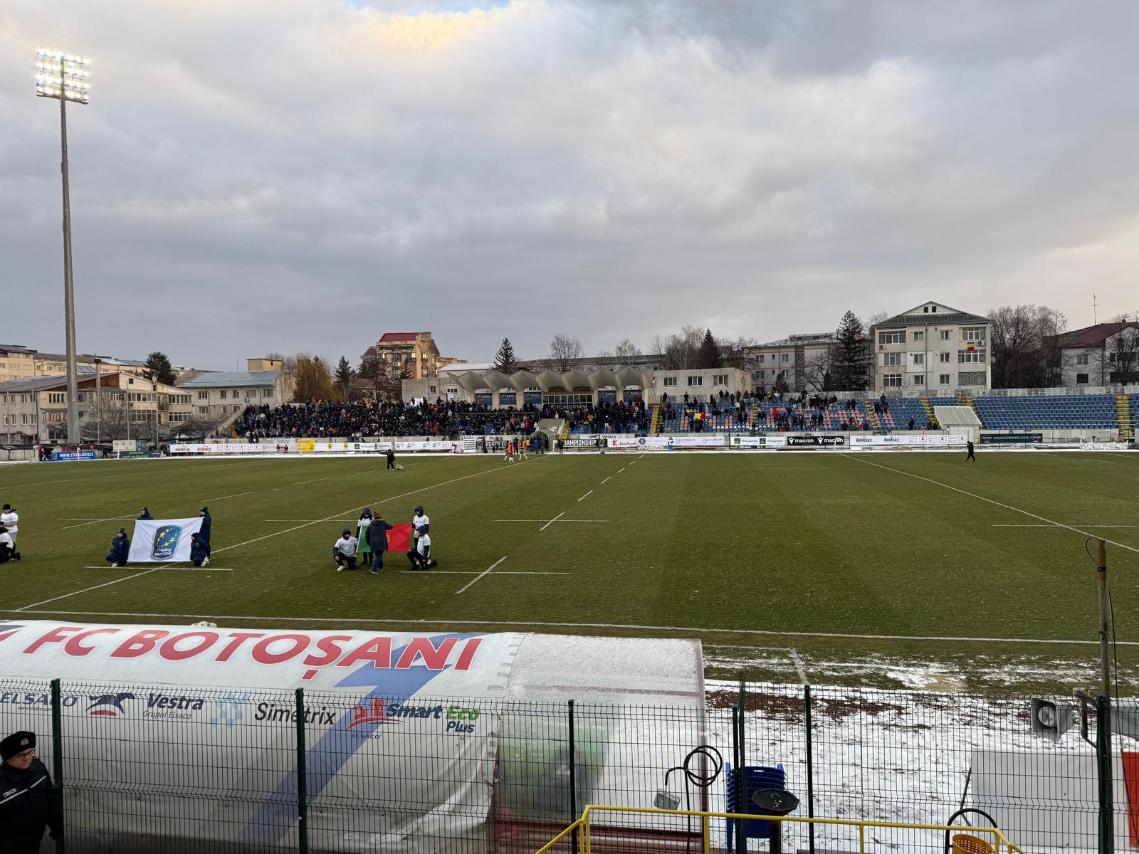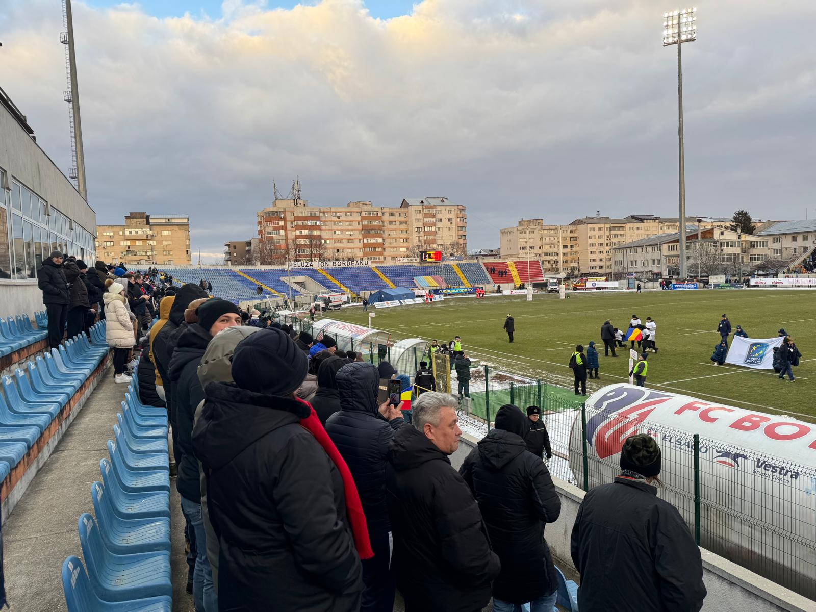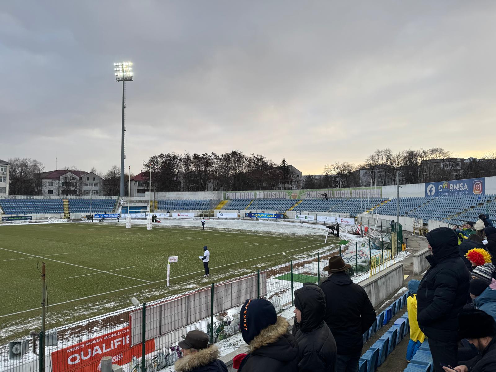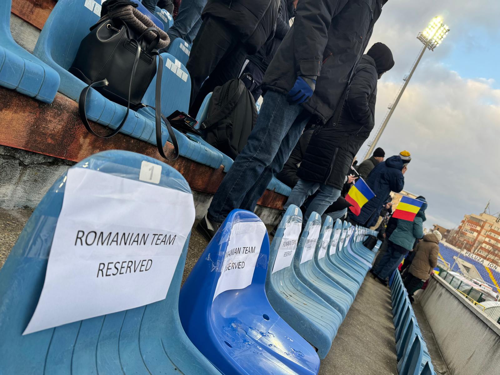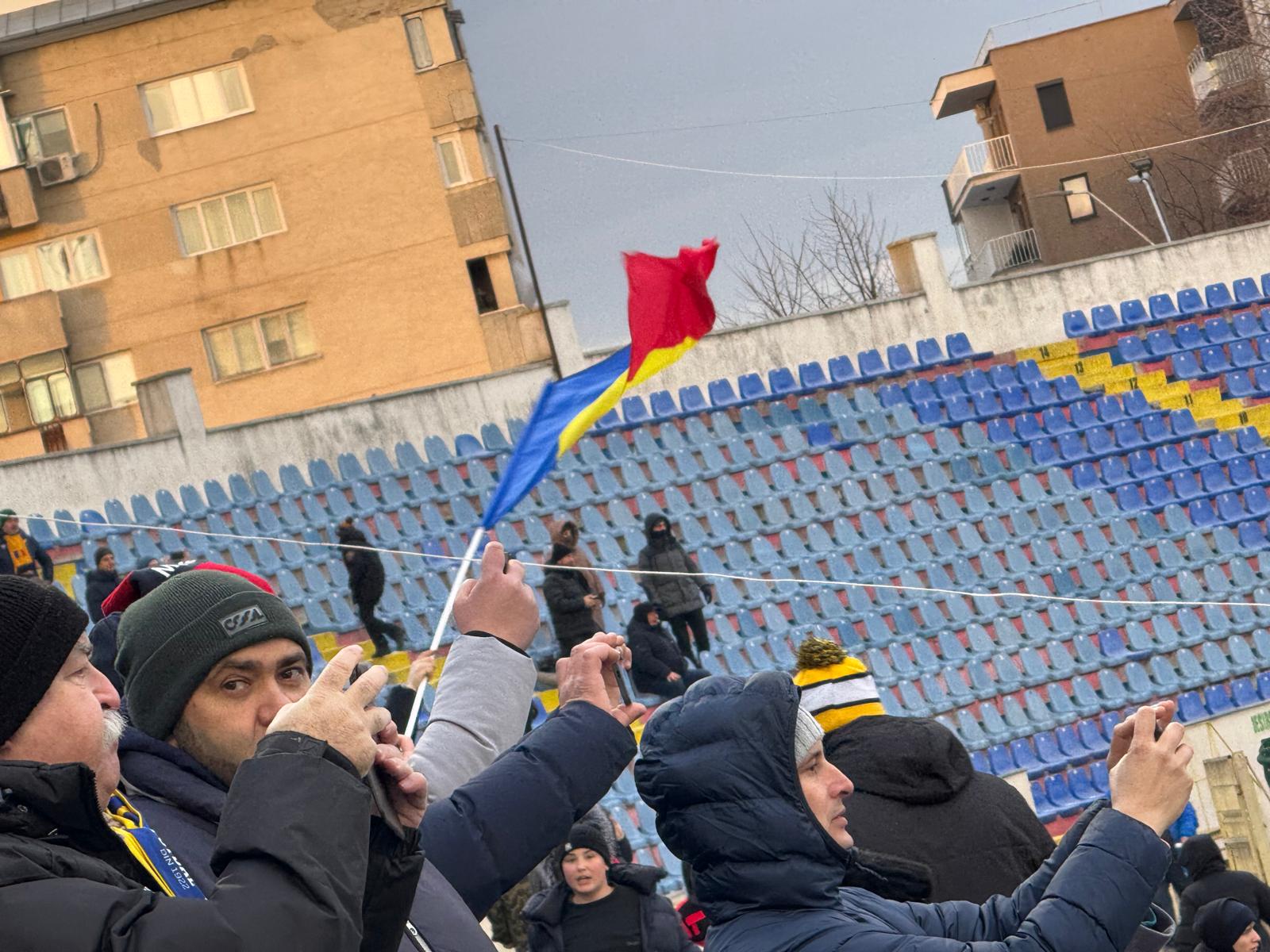 Pe Stadionul Municipal sunt adunați în jur de 1.500 de spectatori. Oamenii au venit cu steaguri și căciuli tricolere și îndură frigul puternic.
