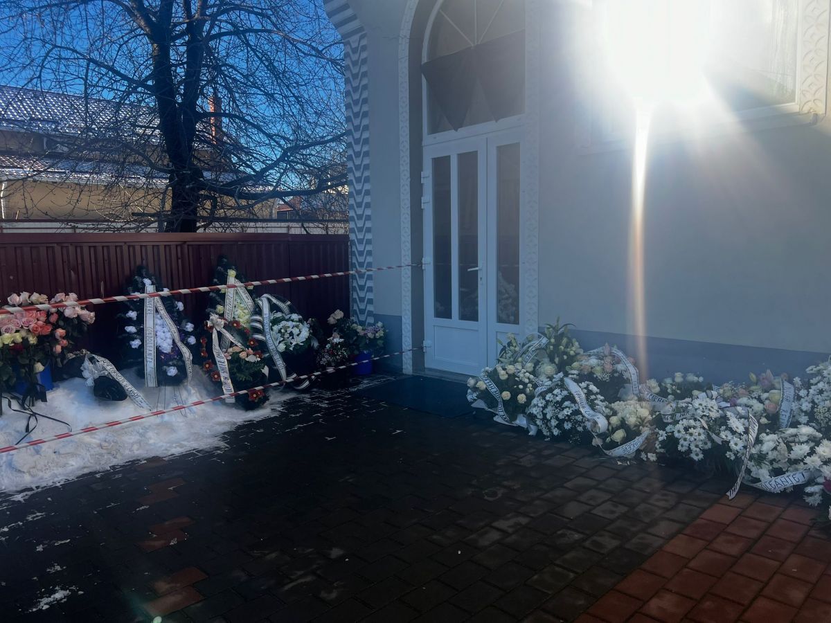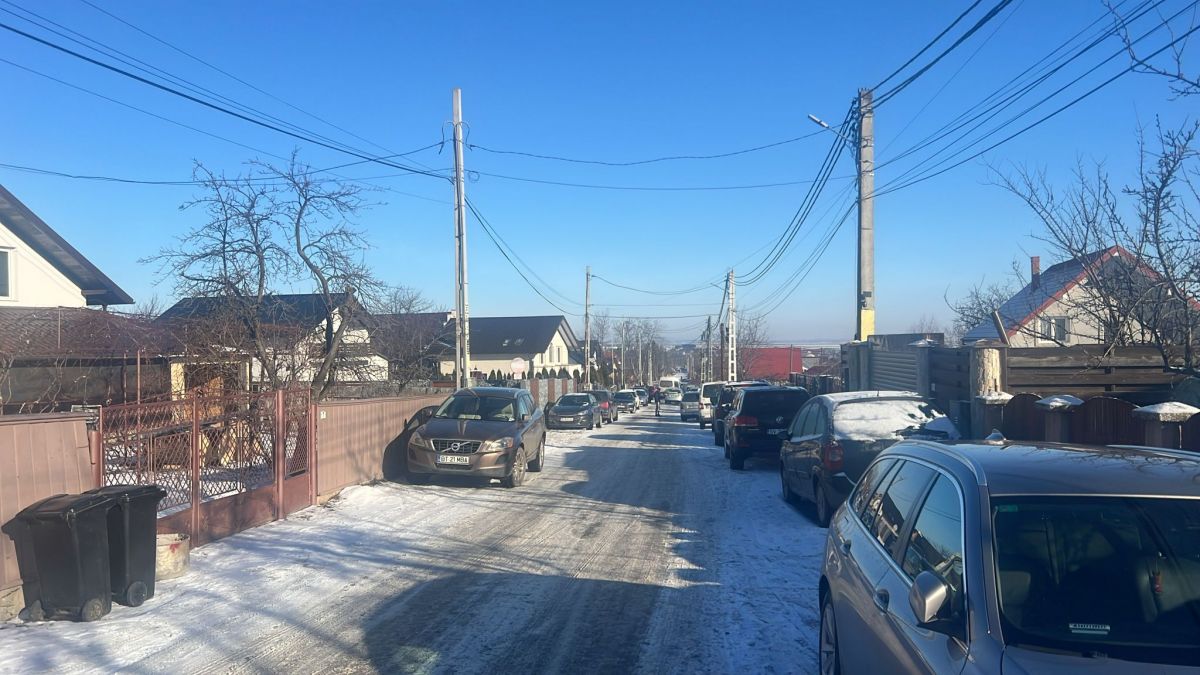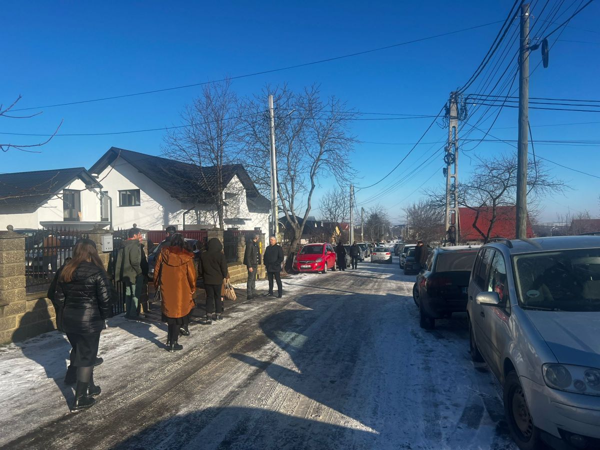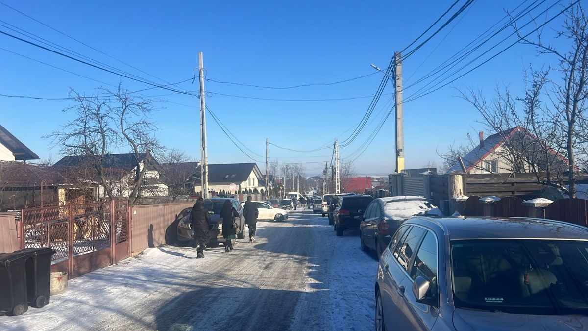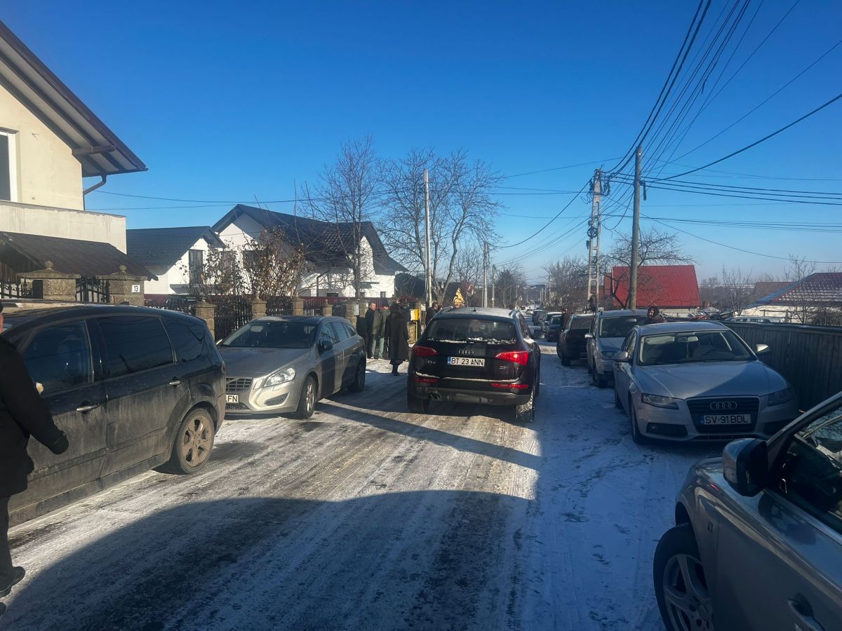 Slujba de înmormântare este programată să înceapă la ora 11:00. Strada s-a umplut de mașini, iar oamenii continuă să vină.