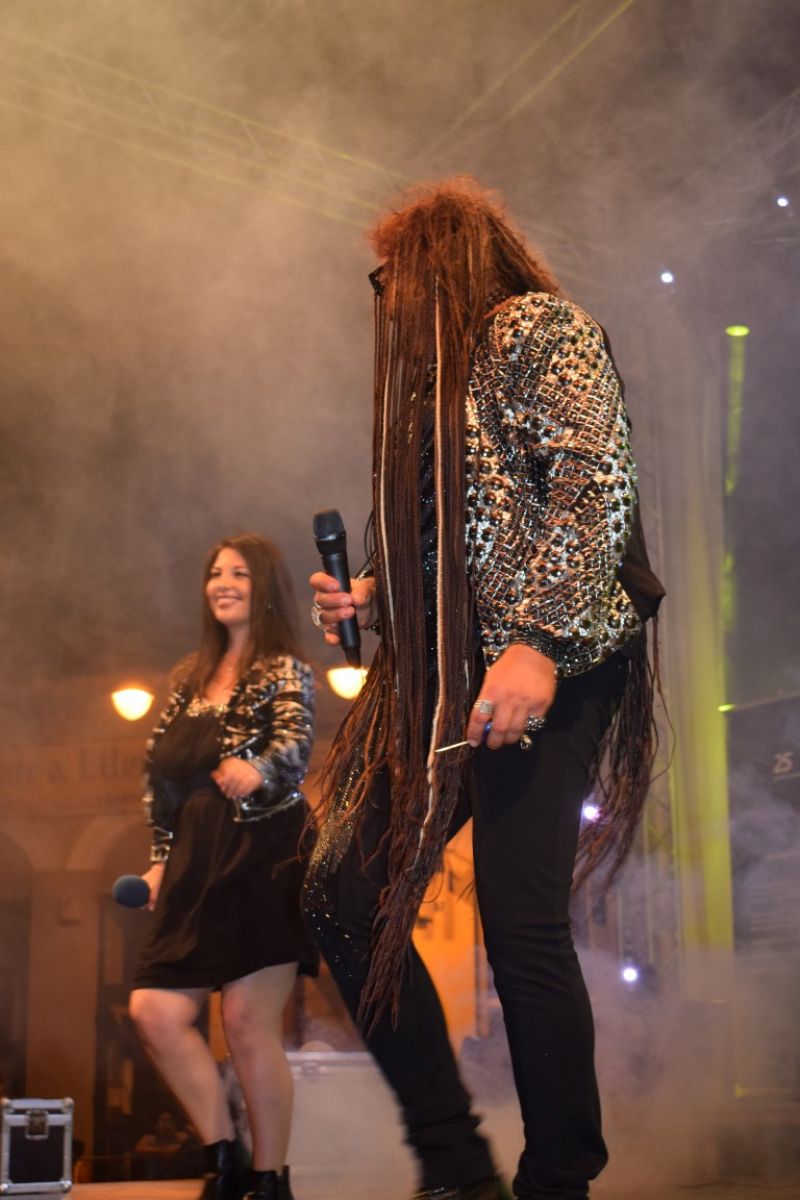 Repertoriul lor este format mai ales din piese în limba germană, iar comunicarea cu publicul, oarecum limitată, se face în câteva cuvinte în engleză. Membrul masculin poartă ochelari de soare, deși deja s-a înserat.