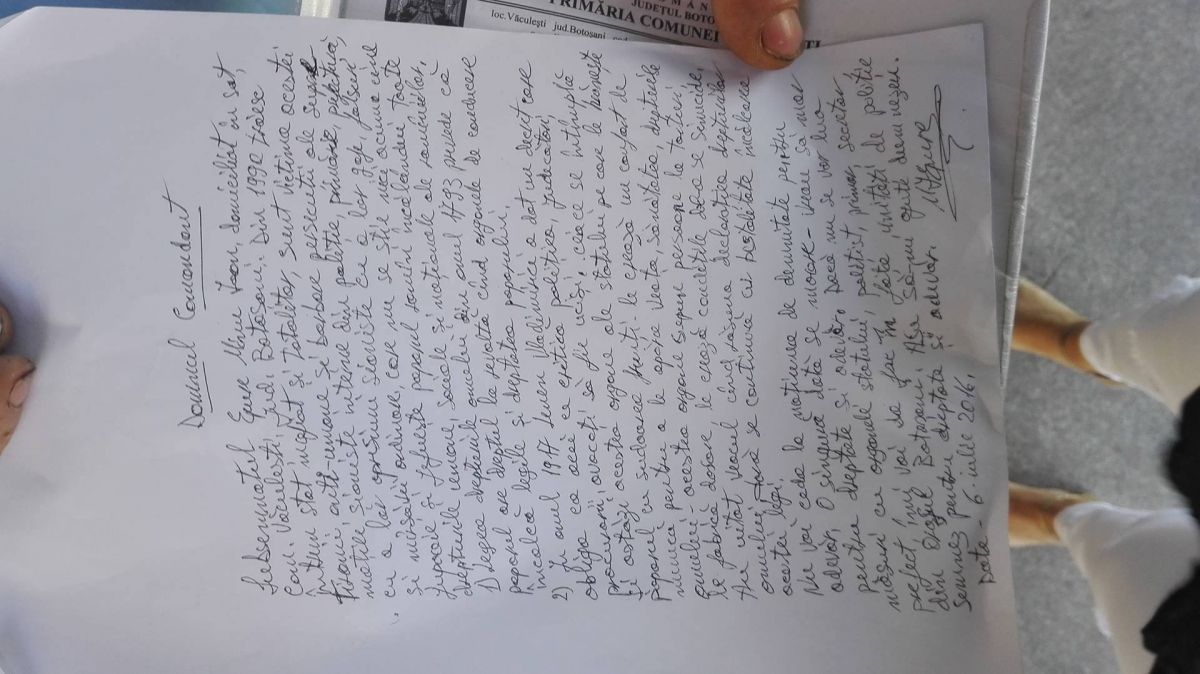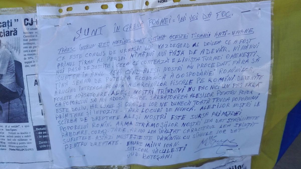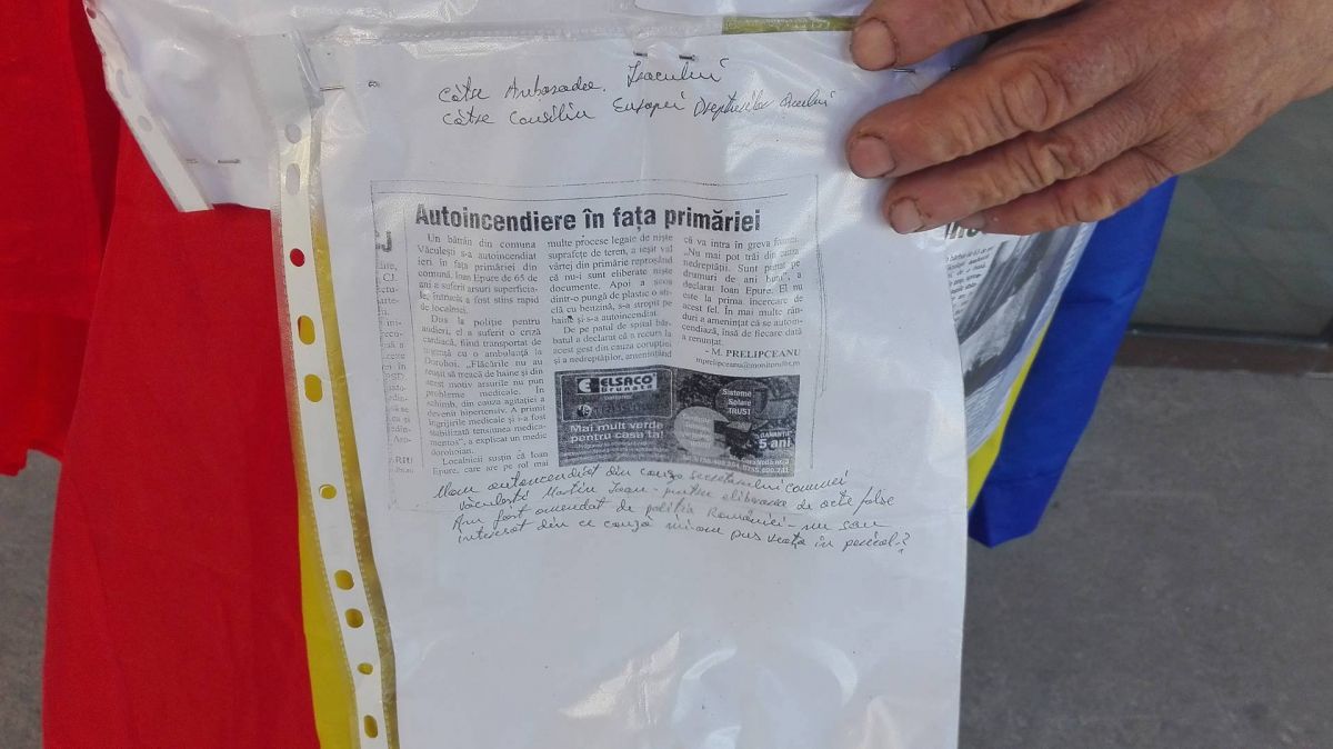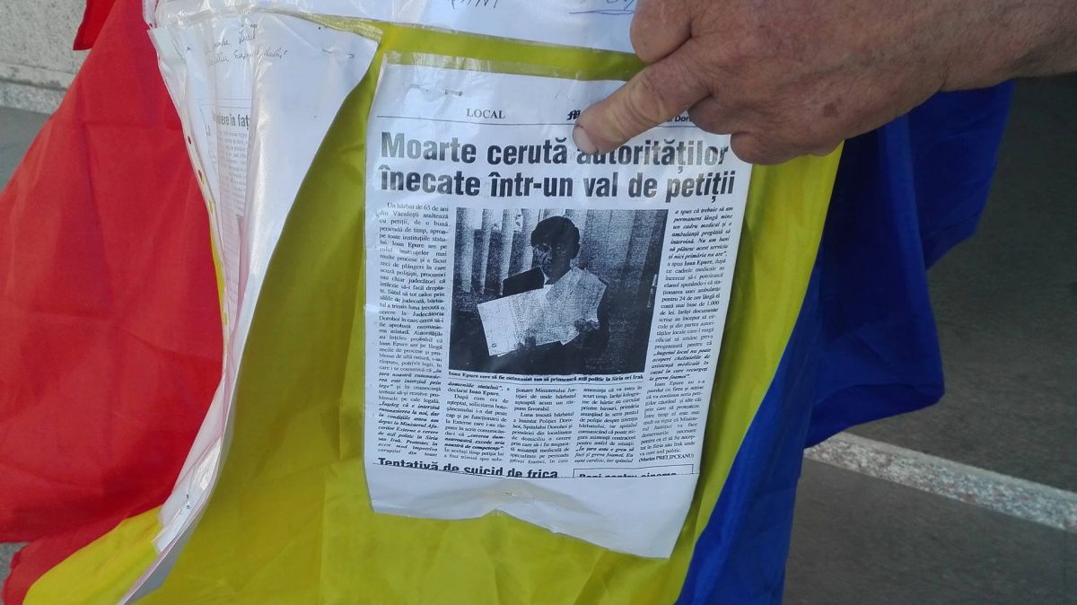 Ion Epure are 66 de ani și susține că are o problema cu secretarul și primarul din Văculești referitoare la o bucată de pământ. El a venit în această dimineață să ceară ajutorul Prefecturii dar și al Inspectoratului de Politie Județean, unde a depus o plângere. Nu este pentru prima dată când acest botoșănean apelează la metoda de autoincendiere.
