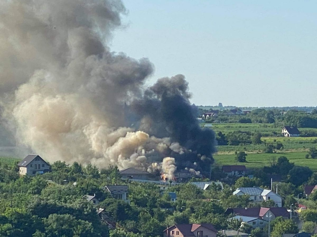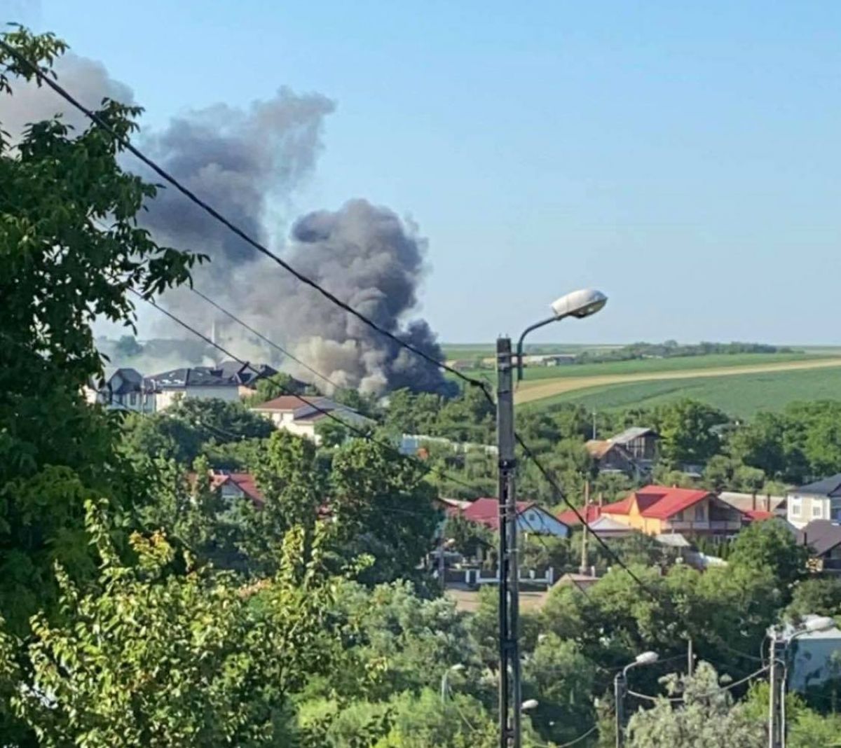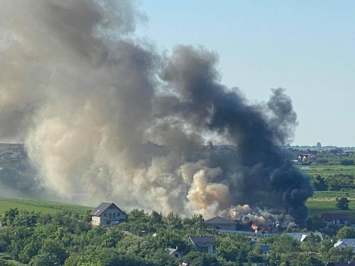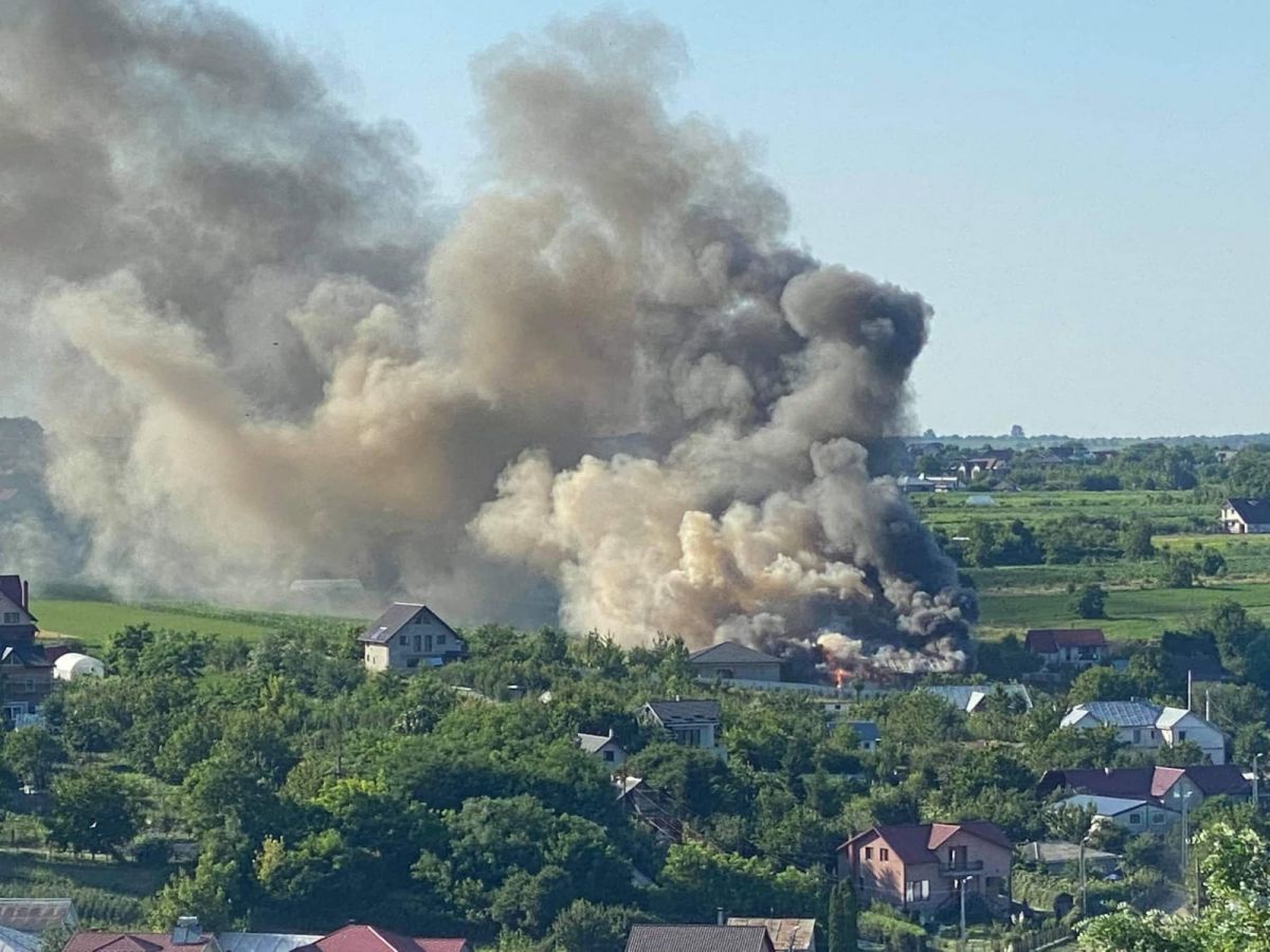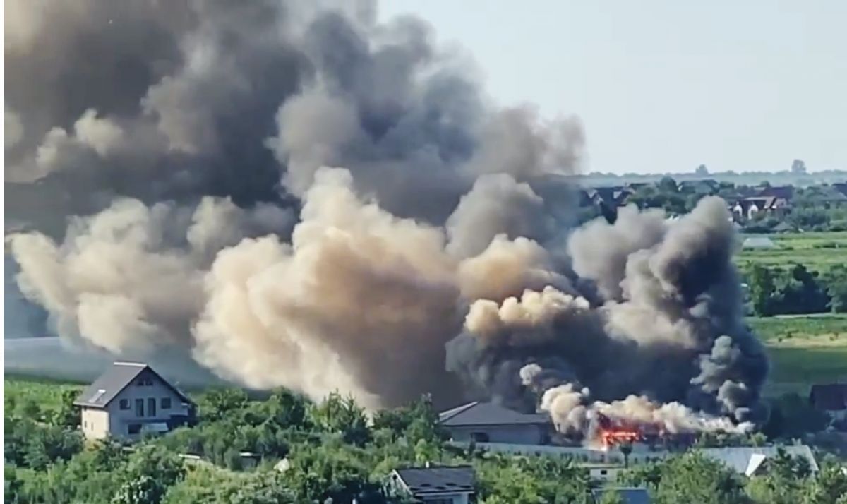 Garajul arde în flăcări, iar fumul gros se poate observa de la îndepărtare.