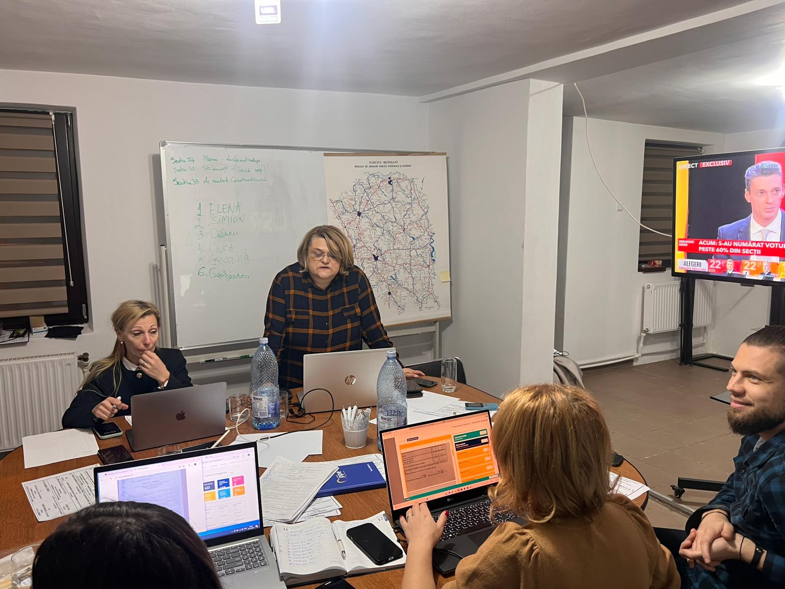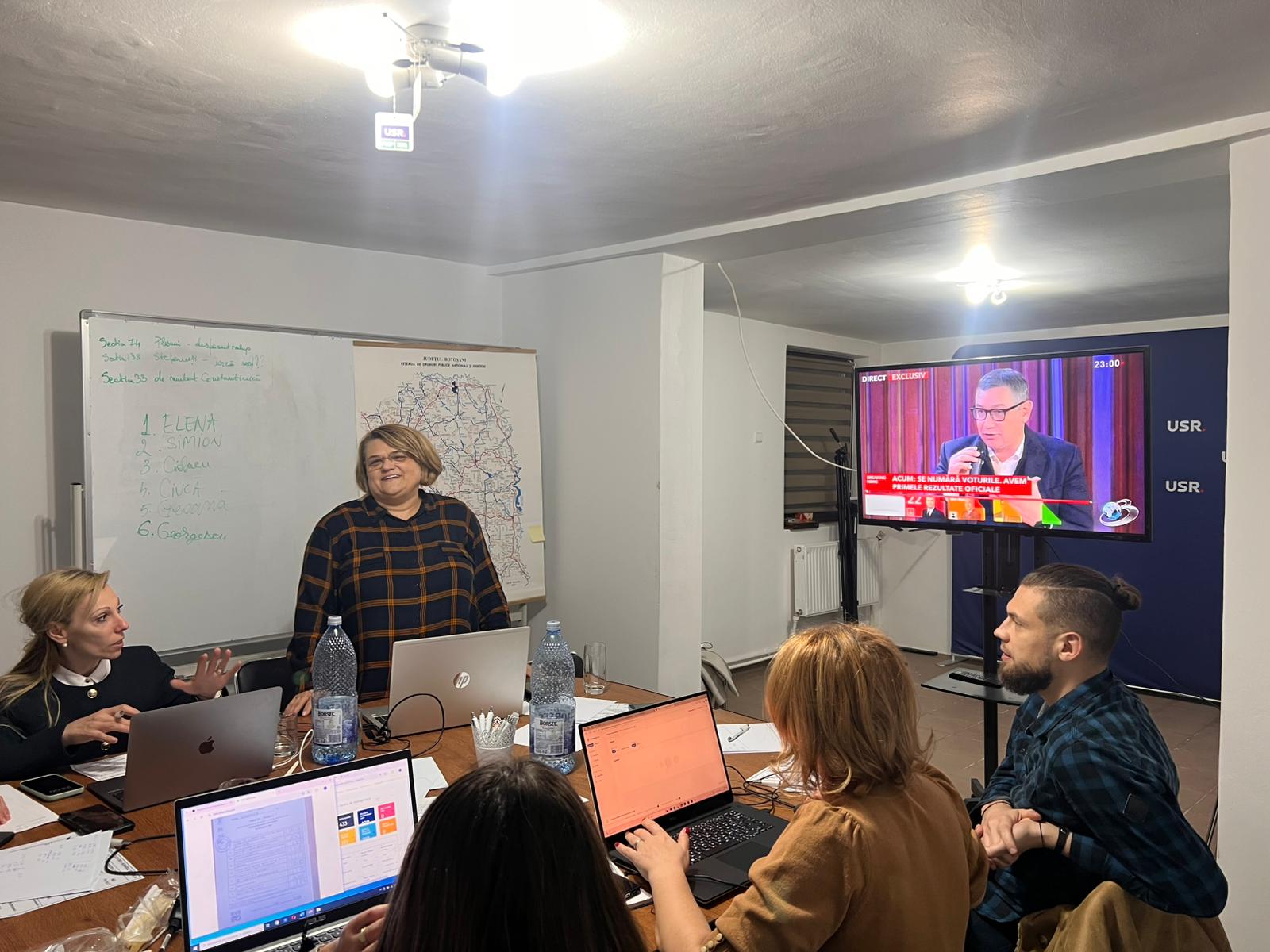 În frunte cu Cristina Lăcătușu si Mgada Oleniuc, echipa USR urmărește rezultatele furnizate la nivel național și face tot felul de calcule consultând rezultatele parțiale de pe site-urile de profil.