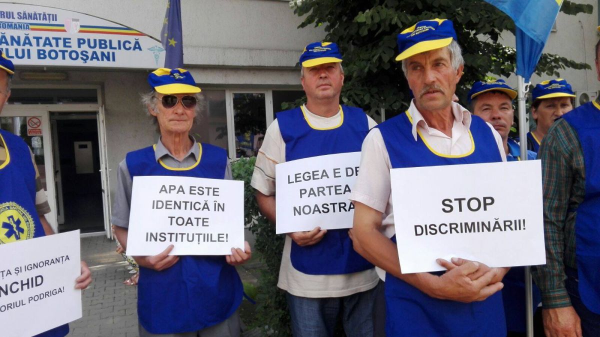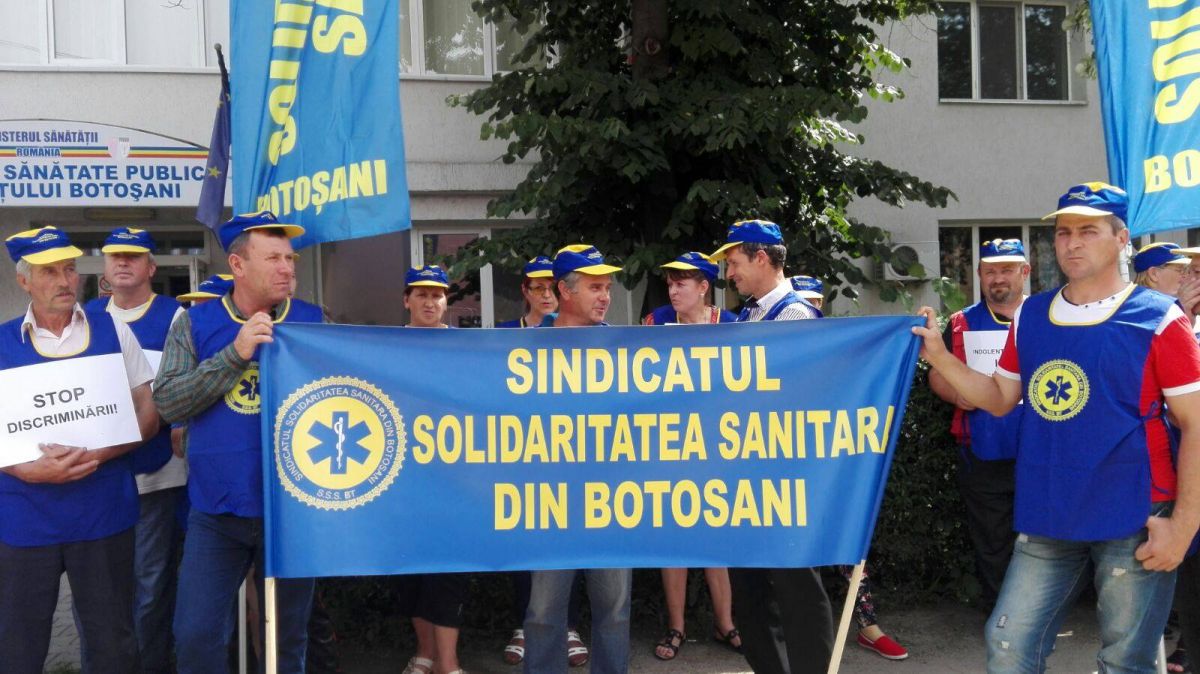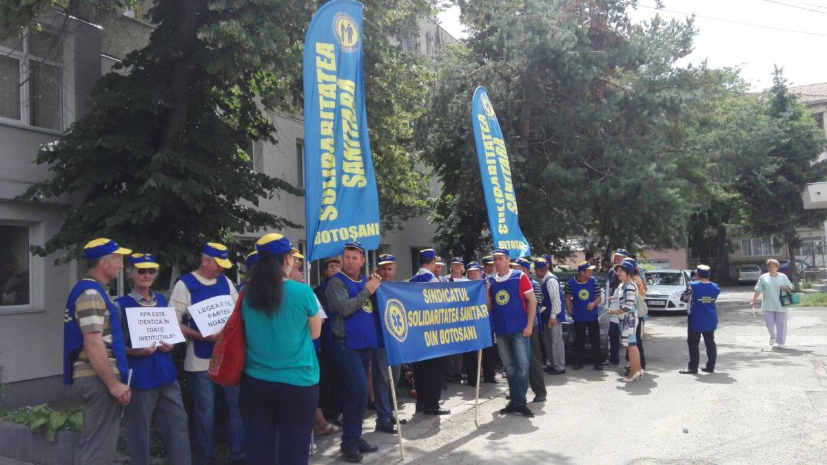 Oamenii au pancarte pe care se poate citi: ”Apa este identică în toate instituțiile”,”70 de pacienți ai nimănui!”, ”64 de angajați concediați”, ”Există interese ascunse?!”. Protestatarii, care sunt membri ai Sindicatului Solidaritatea Sanitară, poartă vestr si speci cu însemnele sindicatului, însă cel puțin deocamdată nu scandează. O delegație a salariaților în frunte cu Daniel Bulboacă președintele Cartel Alfa Botoșani, a intrat la discuții cu directoarea DSP, Silvana Tudorache.