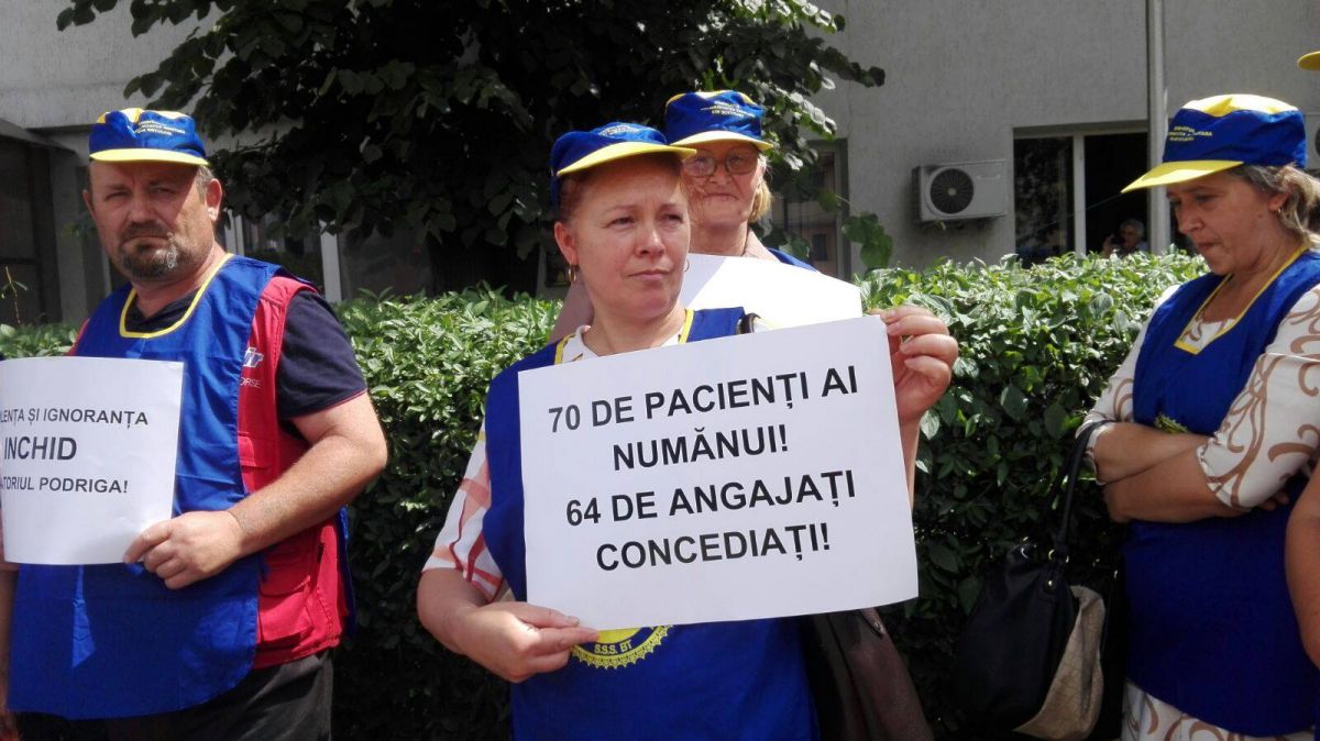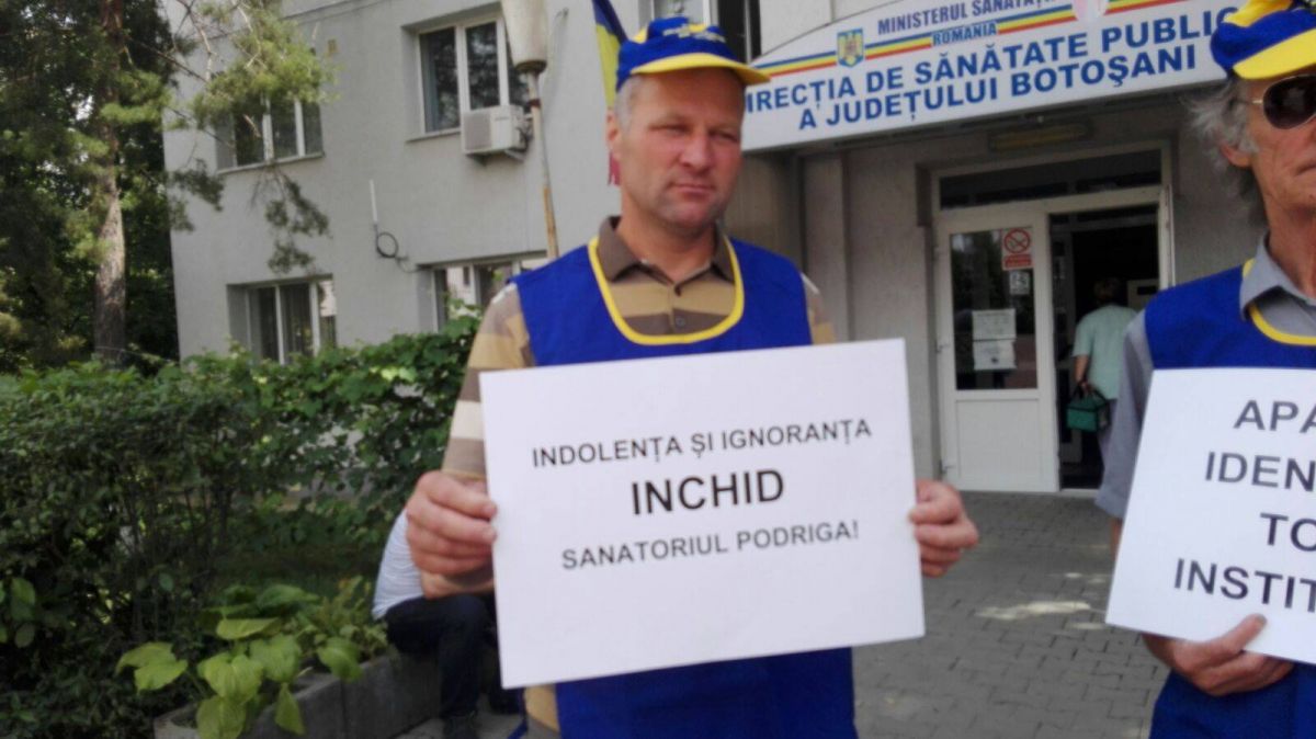 În jur de 40 de angajați ai Sanatoriului Podriga se află la această oră în fața Direcției de Sănătate Publică Botoșani (DSP). Ei protestează față de refuzul DSP-ului de a reautoriza sanitar unitatea la care lucrează.