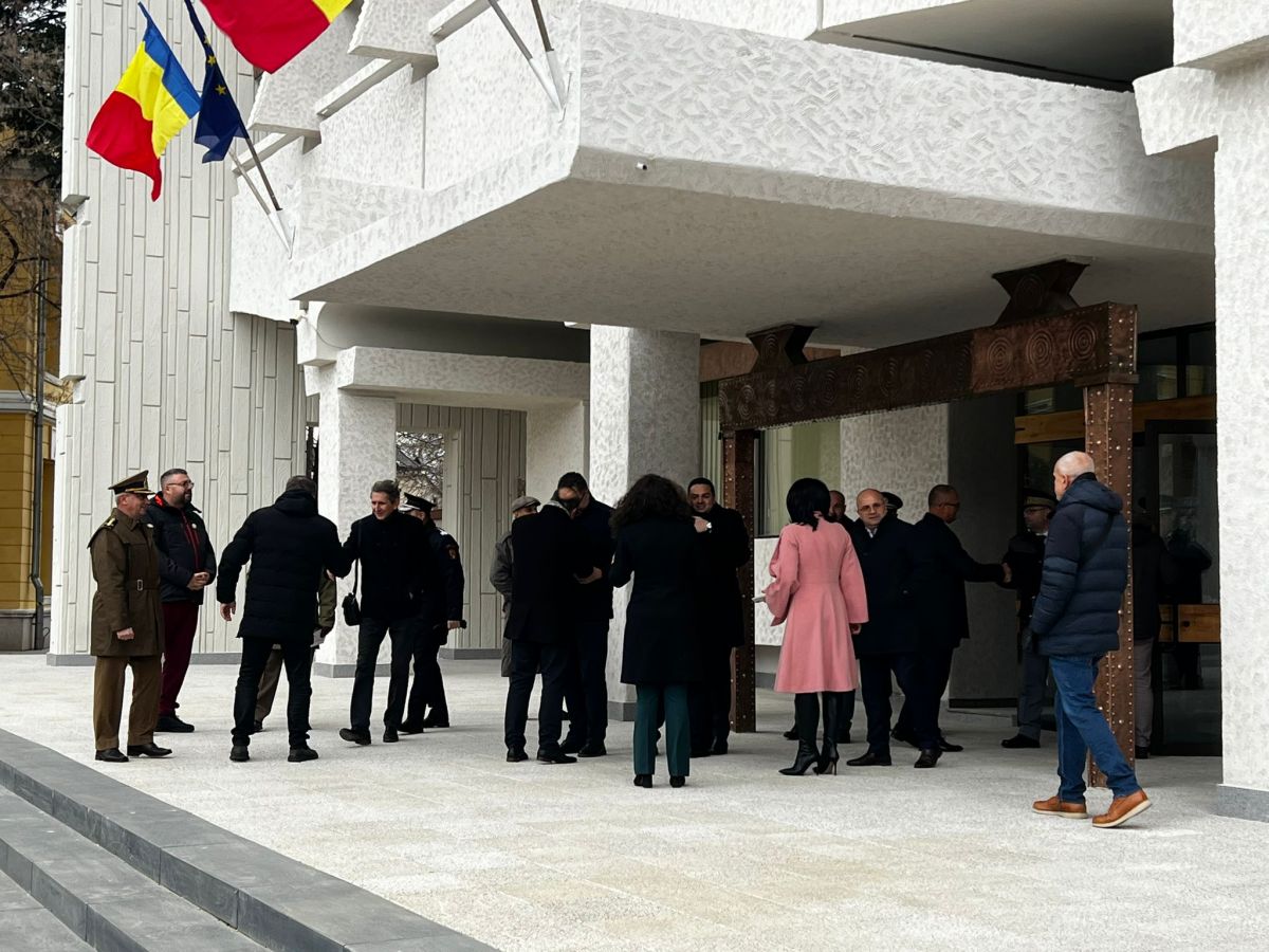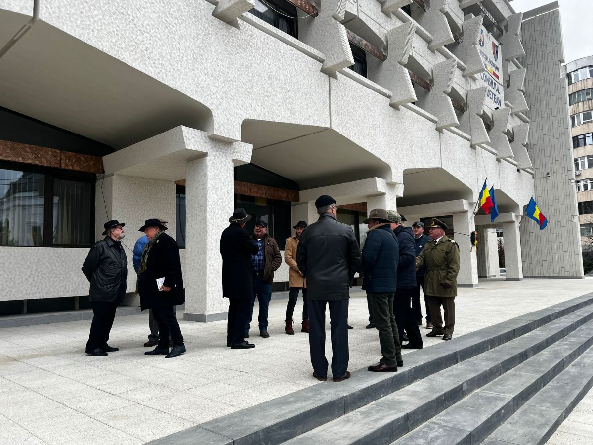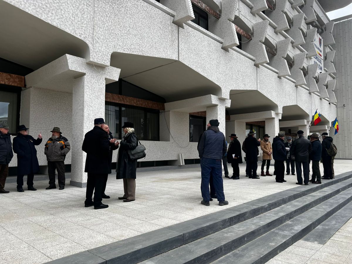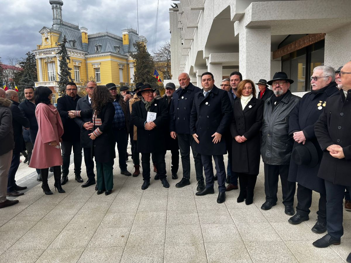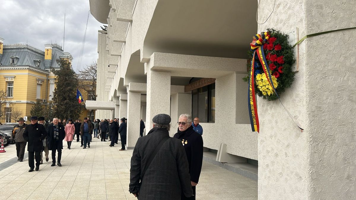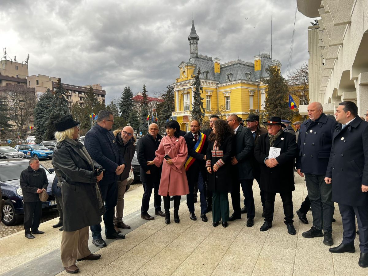 Participanții la eveniment s-au adunat mai întâi la placheta comemorativă de pe fațada reabilitată a Palatului Administrativ.
