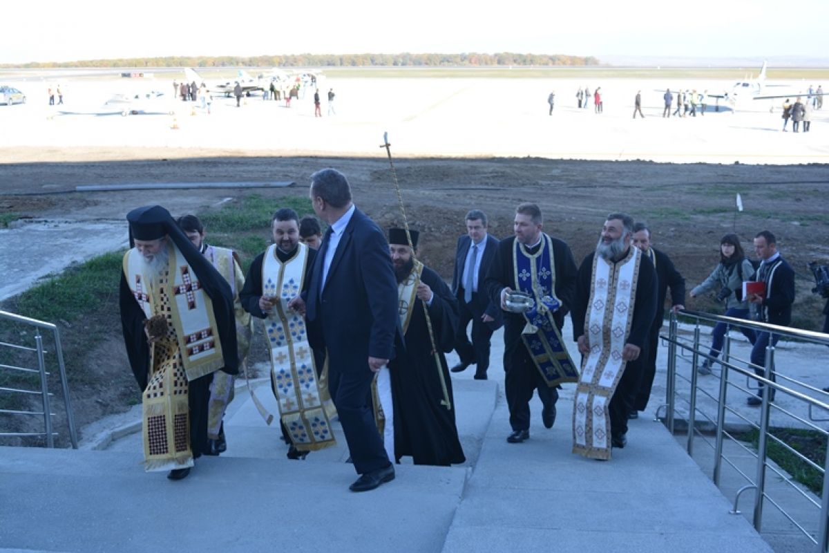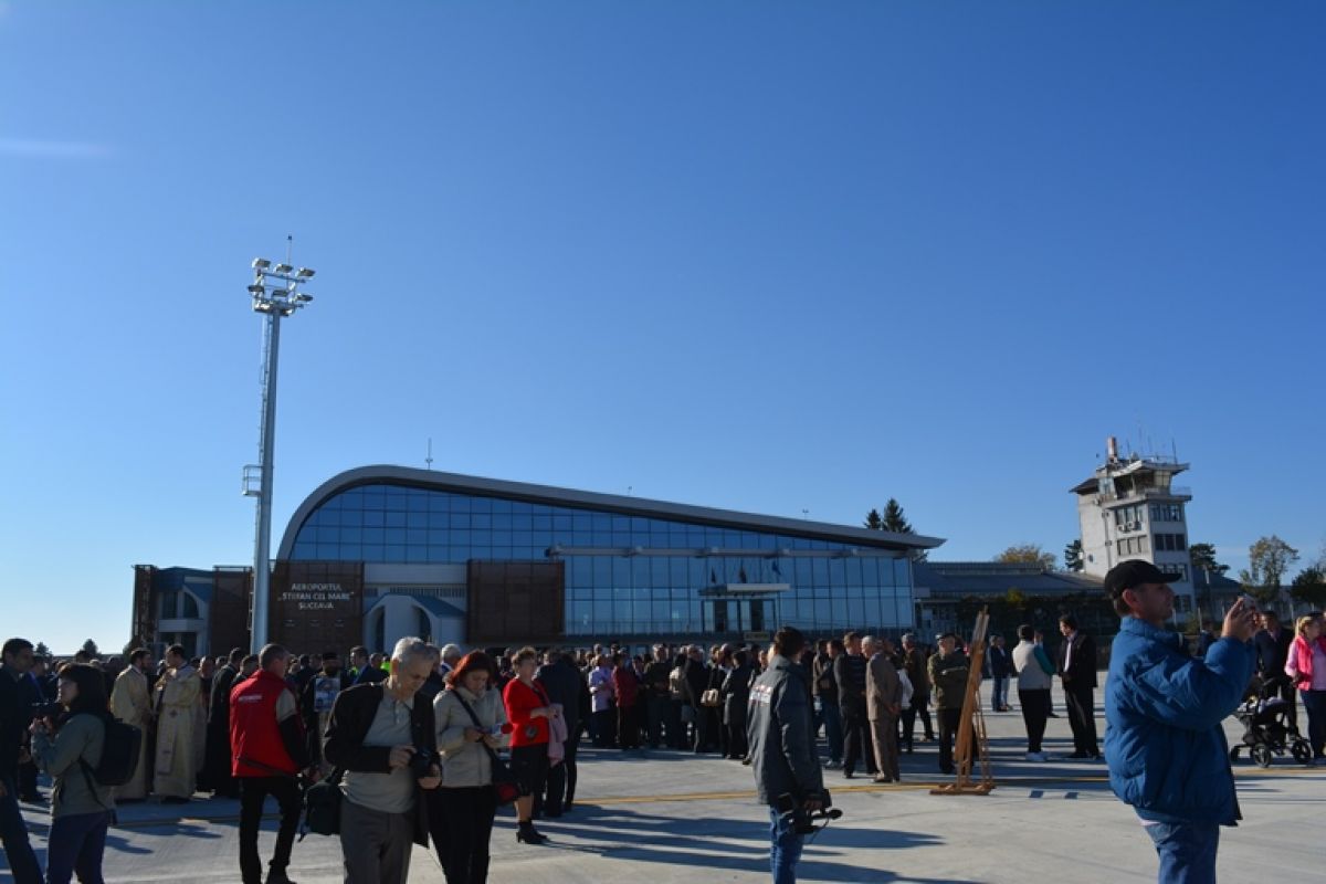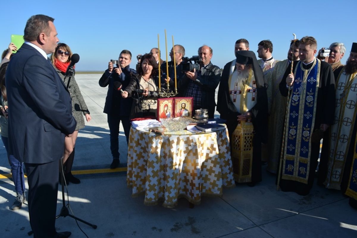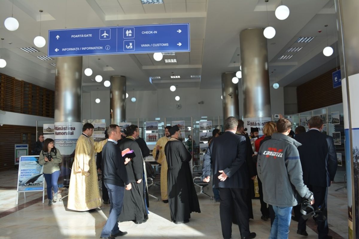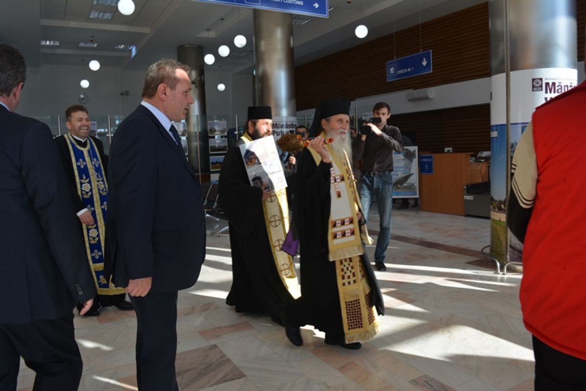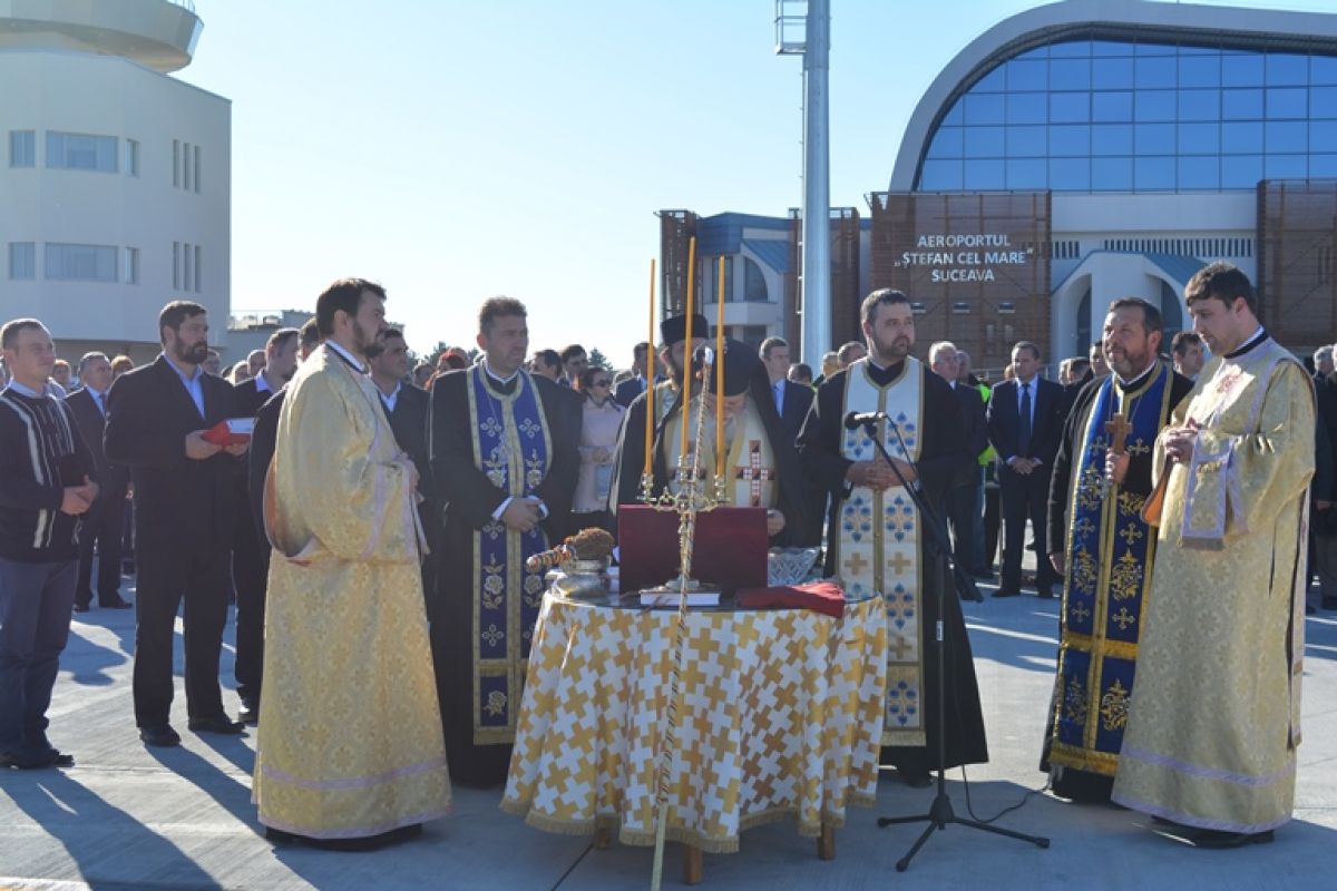 A fost oficiat chiar pe platoul dintre terminal și pistă de către un sobor de preoți condus de IPS Pimen, arhiepiscop al Sucevei și Rădăuților.