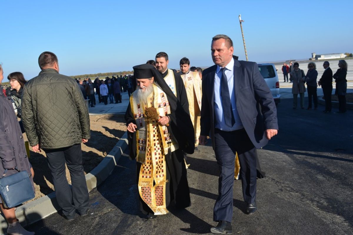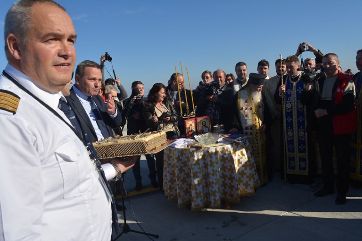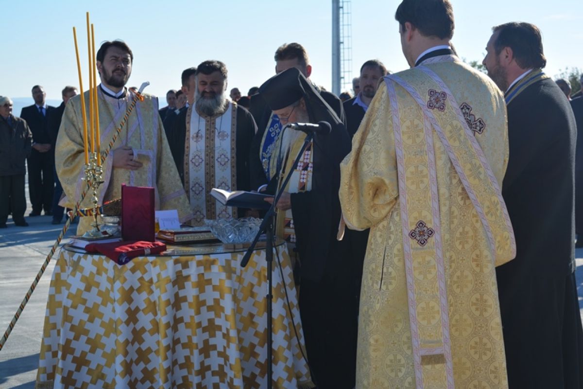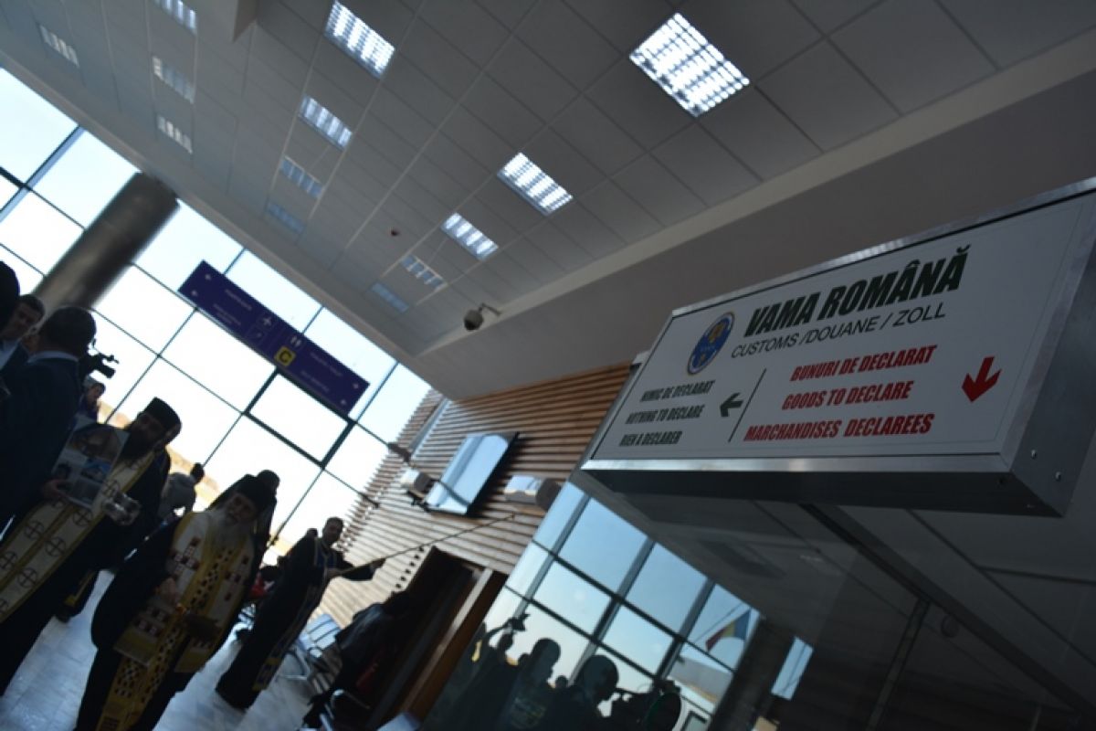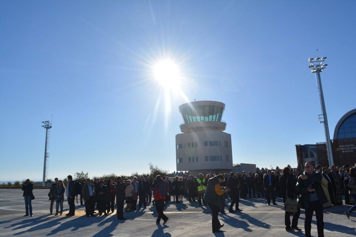 A fost oficiat chiar pe platoul dintre terminal și pistă de către un sobor de preoți condus de IPS Pimen, arhiepiscop al Sucevei și Rădăuților.