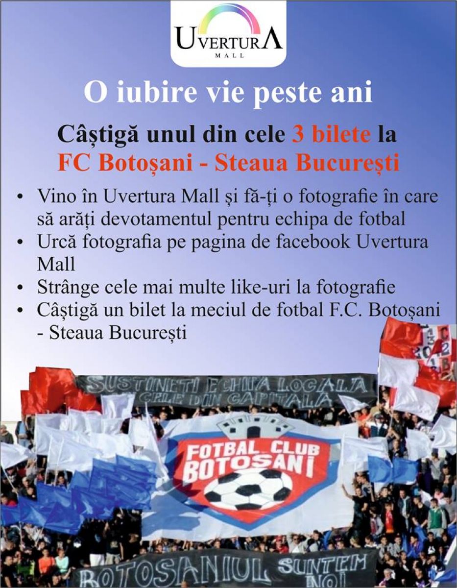 Încă de la inaugurare, Uvertura Mall a promovat și susținut valorile botoșănene. Și pentru că FC Botoșani este o mândrie locală și are nenumărați suporteri, a lansat pentru aceștia un concurs și o invitație de a-și manifesta susținerea si dragostea față de echipa lor, în urma căruia primii trei suporteri desemnați în urma like-urilor primite la fotografiile încărcate pe pagina oficială de facebook Uvertura Mall, vor câștiga câte un bilet la meciul dintre FC Botoșani și Steaua București.