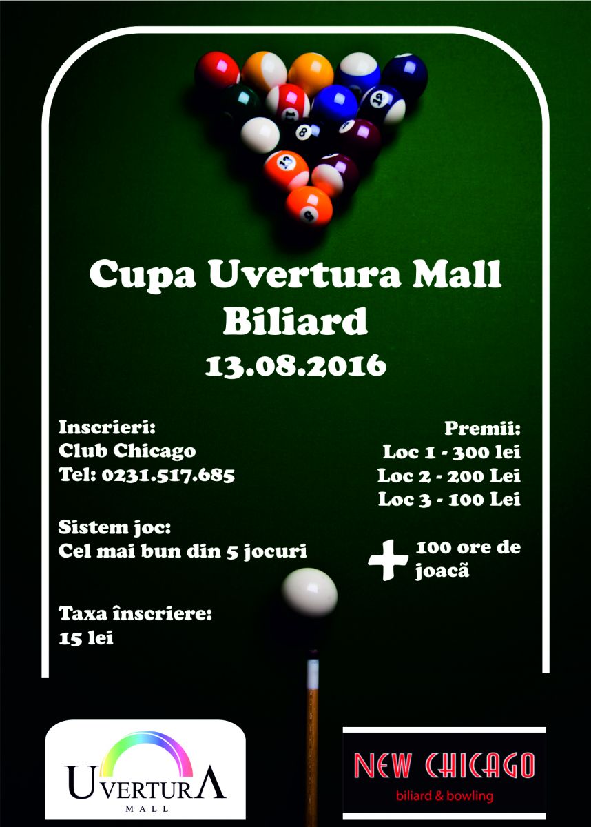 Seria evenimentelor continuă în această perioadă de vară și vacanță, iar cum vacanța presupune relaxare, distracție și ore petrecute împreună cu prietenii, Uvertura Mall și New Chicago, singurul club de bowling și biliard din oraș, îi îndeamnă pe toți cei care iubesc să joace biliard și să-și dezvolte tehnicile de joc și în același timp să se distreze și să socializeze, să se înscrie la concursul ce va avea loc pe data de 13 august, în urma căruia vor avea de câștigat voie bună, distracție, dar și premii consistente.