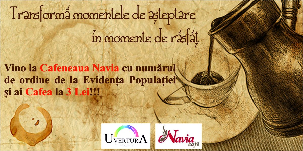 Începând cu 1 august, pentru toți cei care vin în Uvertura Mall, la Serviciul de Evidență a Populației pentru a-și schimba buletinul sau a-și face pașaportul de vacanță, Cafeneaua Navia le face așteptarea mai dulce și mai savuroasă, oferindu-le cea mai cerută băutură la primele ore ale dimineții, la un preț promoțional într-un cadru elegant și confortabil. Astfel, oricine își poate transforma momentele de așteptare în momente de răsfăț și să înceapă ziua în cel mai frumos mod cu putiință la cafeneaua Navia.