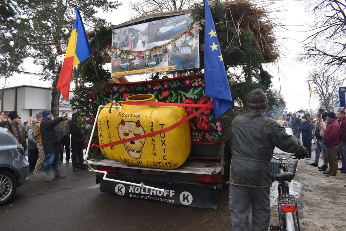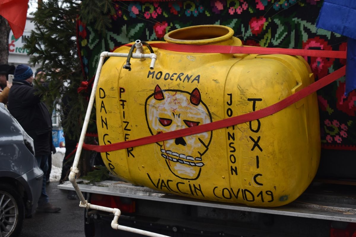 Într-una dintre mașini se putea vedea un ”doctor” cam obosit cu halat marcat DSP (Direcția de Sănătate Publică), iar în loc de număr un tractor avea mesaje precum ”Moderna, Pfizer, Johnson – TOXIC, DANGER”.