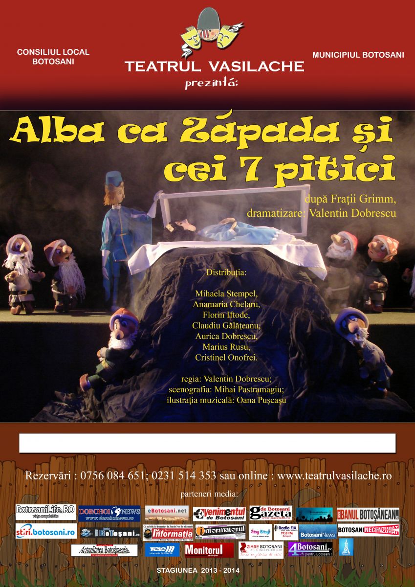 Spectacolul „Albă ca Zăpada şi cei 7 pitici", după Fraţii Grimm este un spectacol realizat de Valentin Dobrescu. Regia: Valentin Dobrescu; scenografia: Mihai Pastramagiu; ilustraţia muzicală: Oana Puşcaşu.