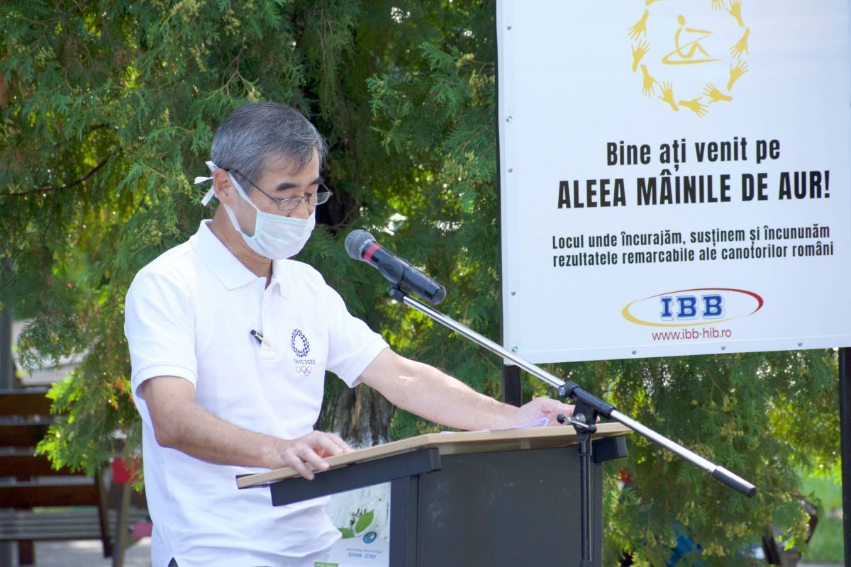 H. E. Mr. Hitoshi Noda, Ambasadorul Japoniei în România, a oferit un discurs, având alături mascotele Jocurilor Olimpice de la Toyo, spunând: