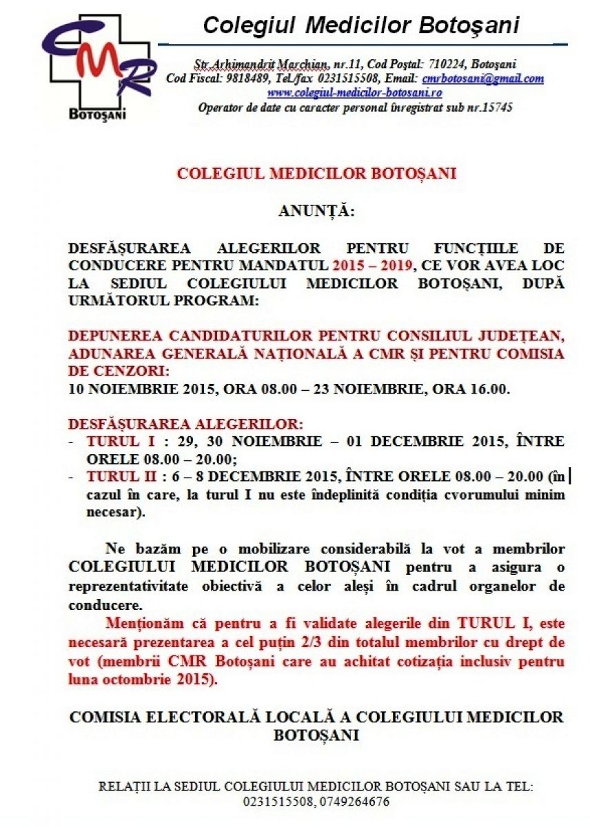 Colegiul Medicilor Botoșani anunță desfășurarea alegerilor pentru funcțiile de conducere pentru mandatul 2015 – 2019, ce vor avea loc la sediul Colegiului Medicilor Botoșani.