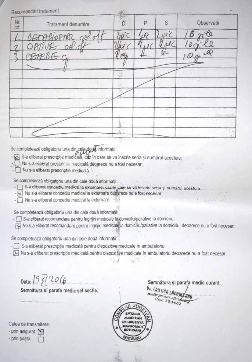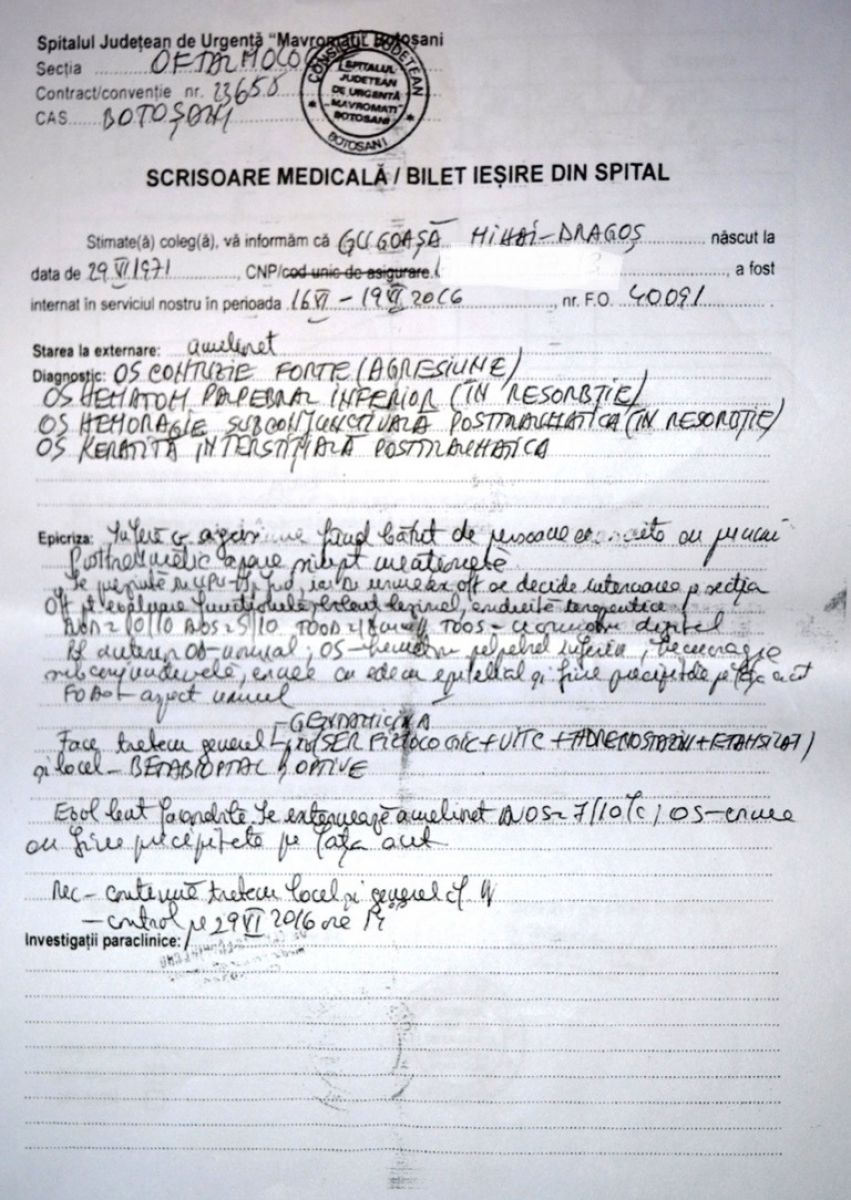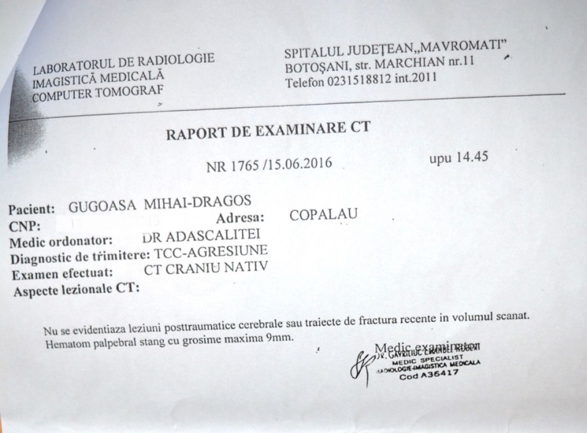 Întrucât după corecția încasată îl durea capul, șeful SVSU de la Primăria Copălău s-a prezentat la Spitalul Județean, iar medicii de aici, când au văzut în ce stare se află, au hotărât să îl interneze. Diagnosticul este unul destul de lung: contuzie forte (agresiune), hematom palpebral inferior, hemoragie subconjunctivală postraumatică, keratitită interstițială postraumatică. Dragoș Gugoașă a stat trei zile internat la ”Mavromati” și a fost rechemat la control după zece zile.
