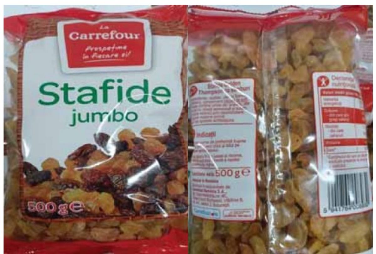 Carrefour România SA îi anunță pe clienți că a inițiat retragerea de la vânzare și rechemarea de la consumatori pentru mai multe loturi de stafide, cu datele de identificare de mai jos. Motivul: a fost depășită valoarea admisă de reziduuri pesticide (Chlorpirifos).