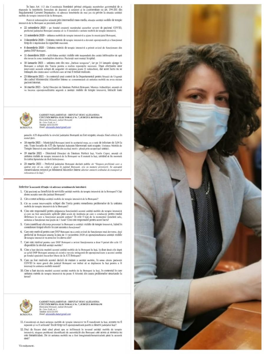 Deputatul PSD Alexandra Huțu a solicitat miniștrilor Sănătății, Afacerilor Interne și Departamentului pentru Situații de Urgență să prezinte botoșănenilor de ce la aproape 4 luni de la instalare, Unitatea Mobilă de Terapie Intensivă de la Spitalul Mavromati va fi mutată la Iași, după ce a funcționat mai puțin de o lună din cauza unor găuri din acoperișul unității, prin care apa de ploaie se infiltrează exact în zona unor conexiuni electrice.