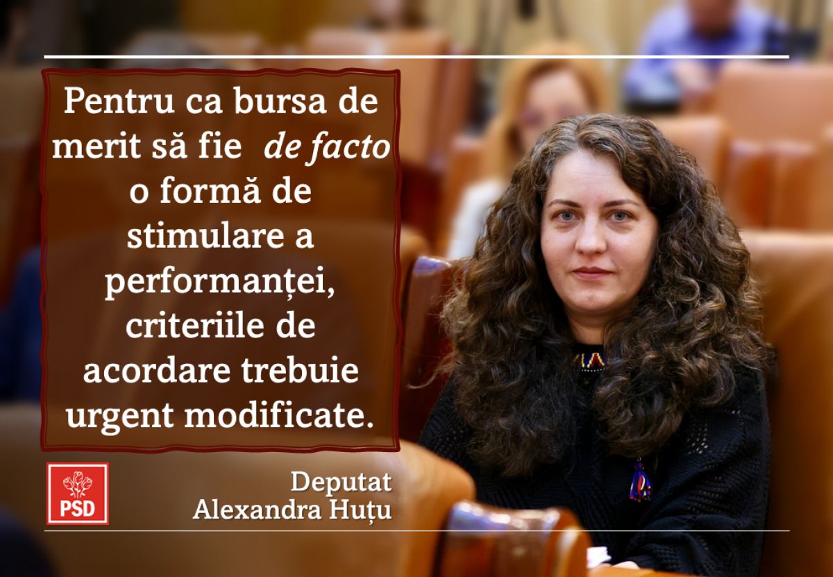 Parlamentarul social-democrat Alexandra Huțu a atras atenția asupra necesității imediate de a se modifica criteriile de acordare a burselor de merit, care în prezent prevăd că acestea se alocă pentru minimum 30% din elevii din fiecare clasă de gimnaziu și liceu dintr-o unitate de învățământ preuniversitar, fără să se țină cont de mediile elevilor.