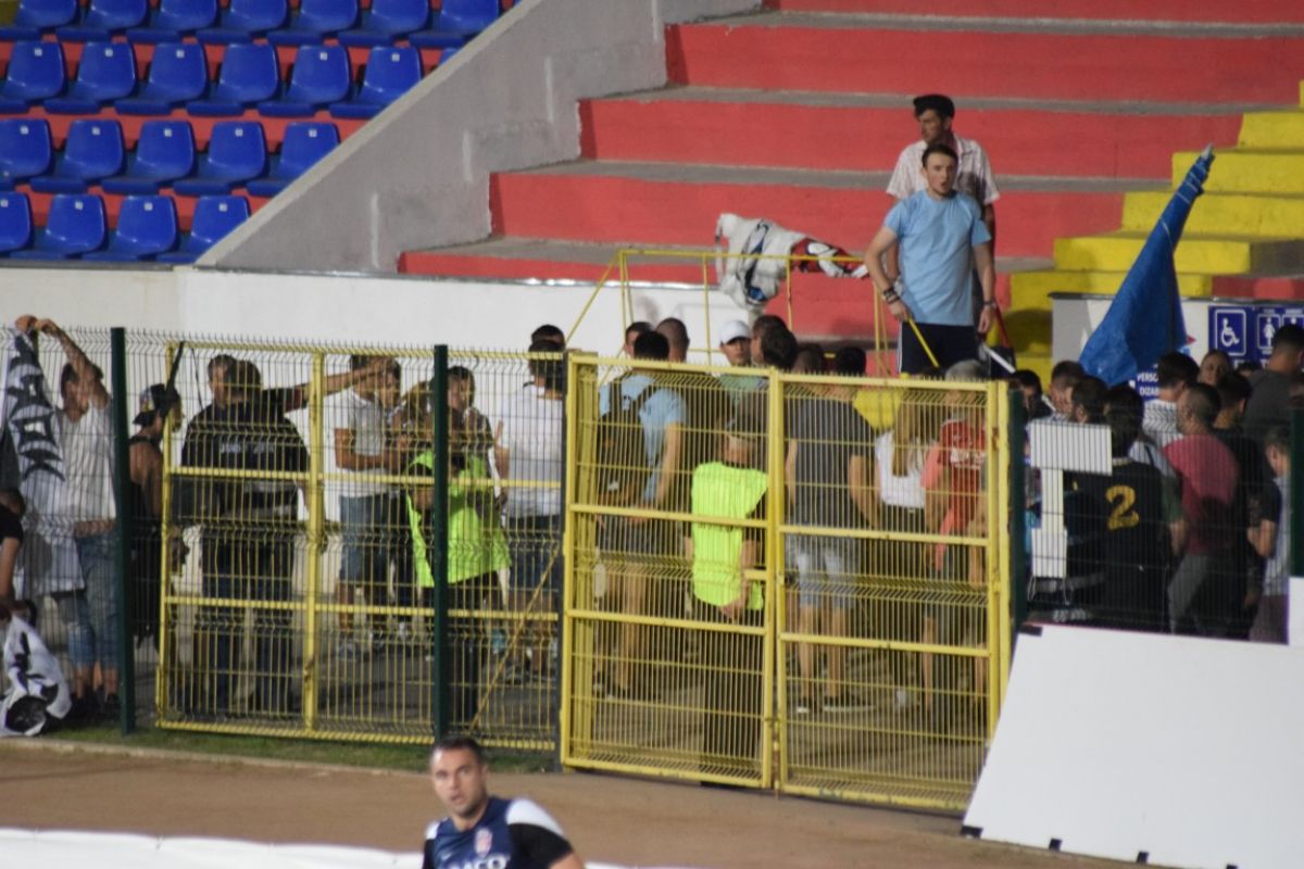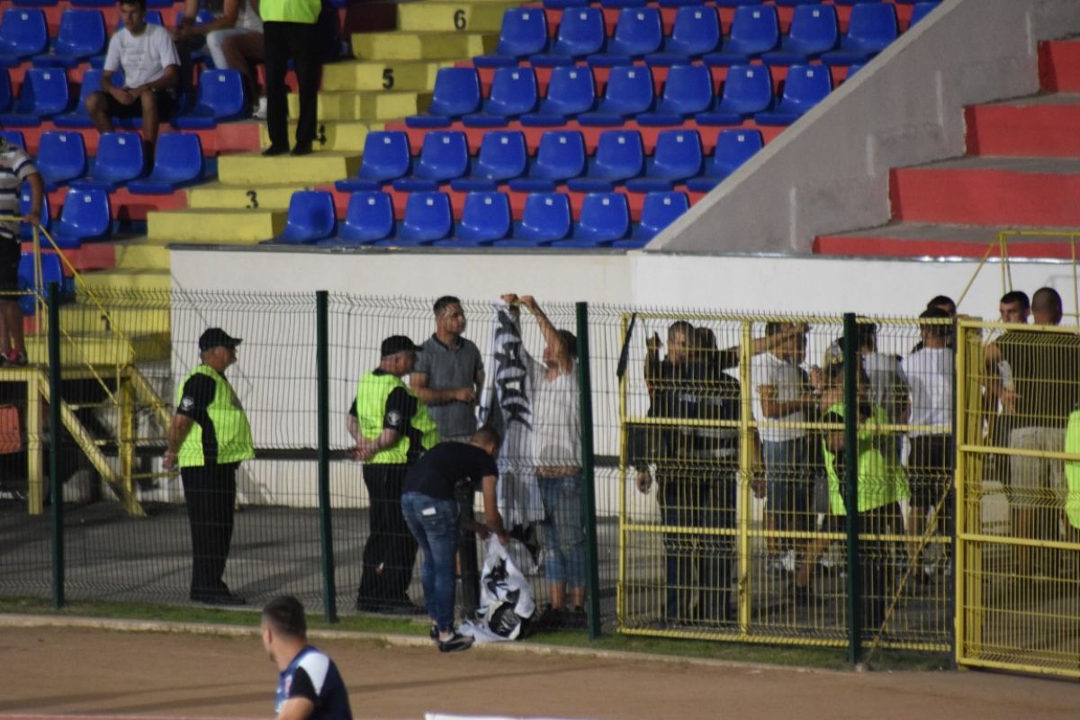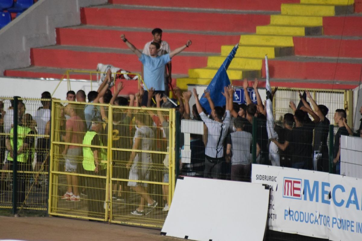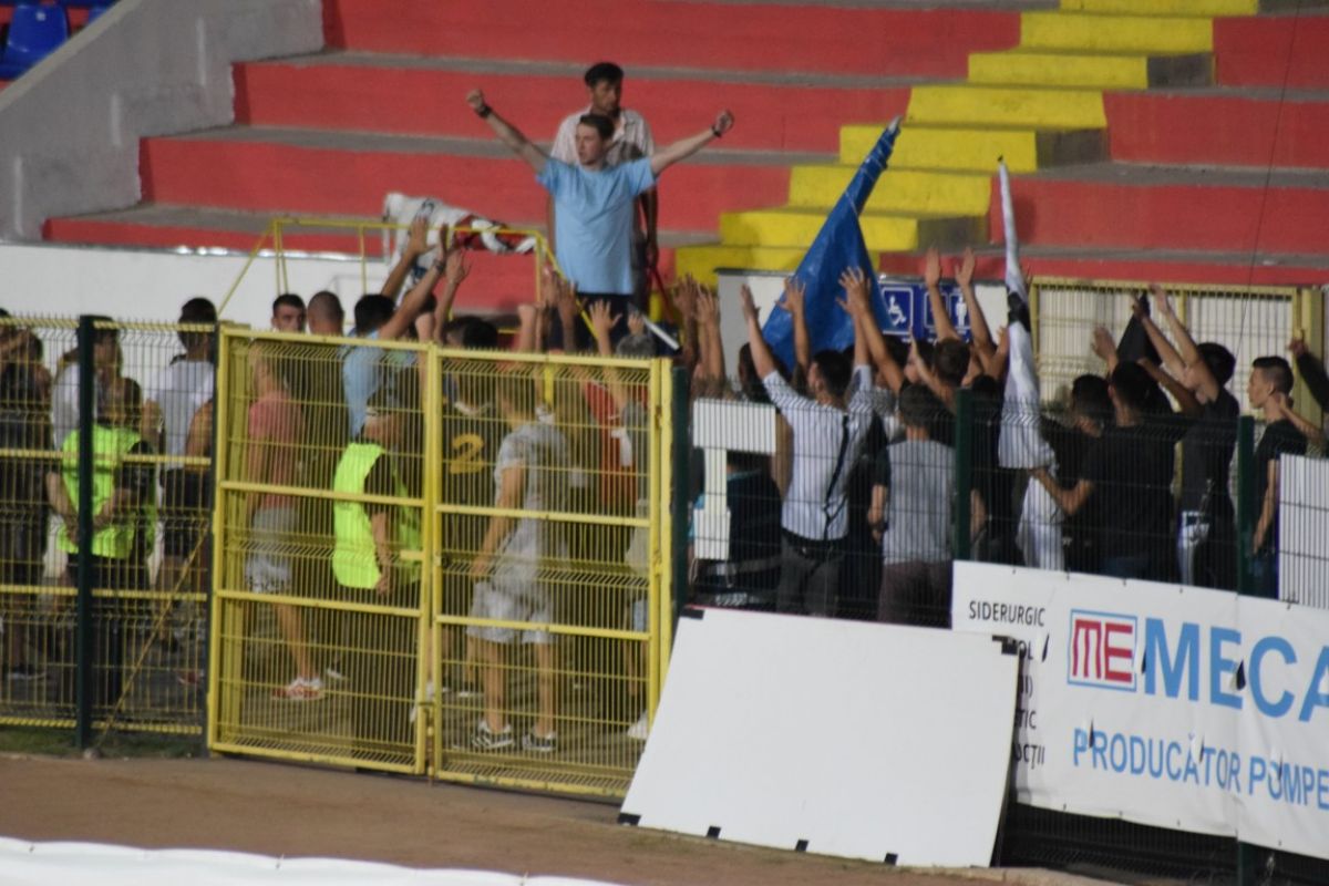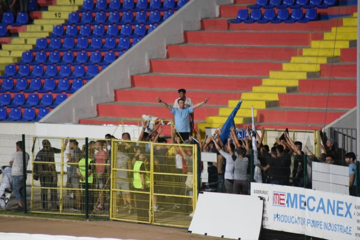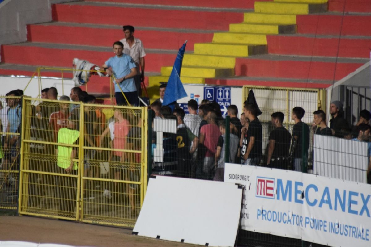 Pentru câteva minute au mai scandat de pe culoarul dintre gard şi tribune, după care şi-au luat tot arsenalul inclusiv bannerele amplasate în faţa peluzei şi au părăsit Stadionul Municipal.