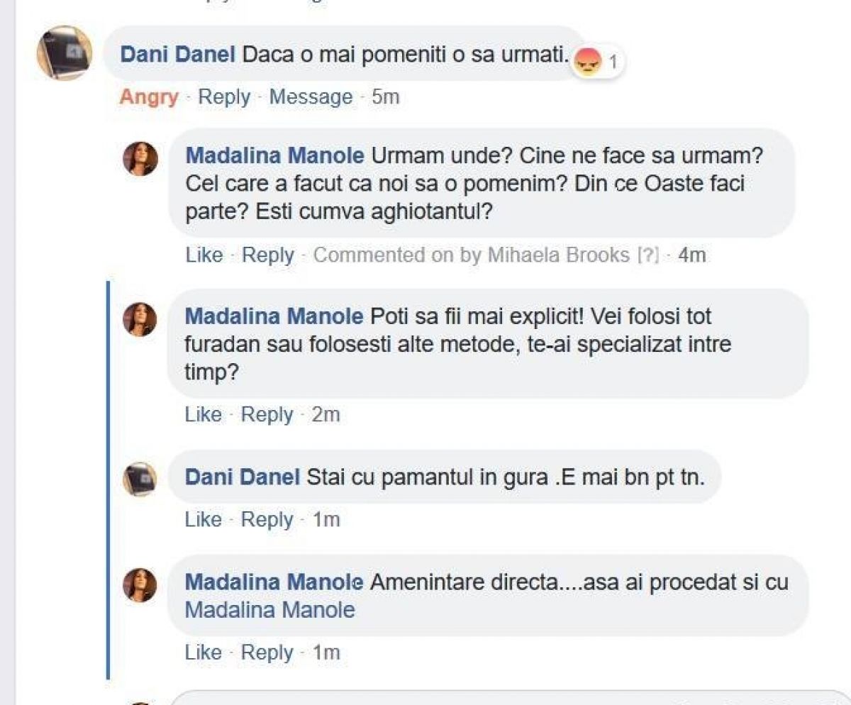 In acest context, o persoana necunoscuta care ascunde sub pseudonimul „Dani Daniel" si posteaza de pe un cont fals, i-a anuntat pe administratori ca „daca o mai pomeniti, o sa urmati". Chestionat in legatura cu aceasta afirmatie, necunoscutul a revenit: "Stai cu pamantul in gura. E mai bine pentru tine", a scris acesta. Ulterior, acesta facut si un soi de gluma macabra: "In cavou nu ai semnal?".