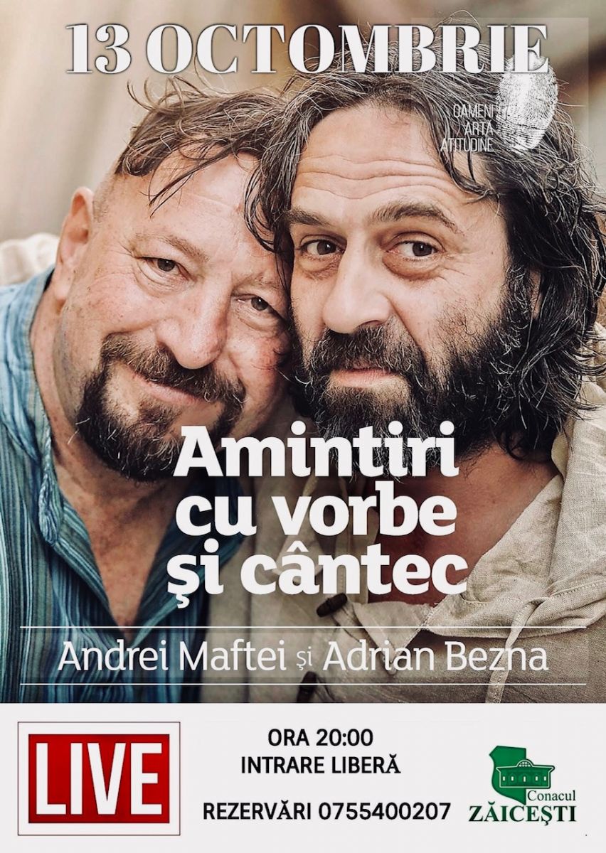 Vineri 13 octombrie, orele 20:00, Adrian Bezna şi Andrei Maftei işi dau întâlnire la Conacul Zăiceşti, pentru a oferi botoşănenilor un recital folk de excepţie.