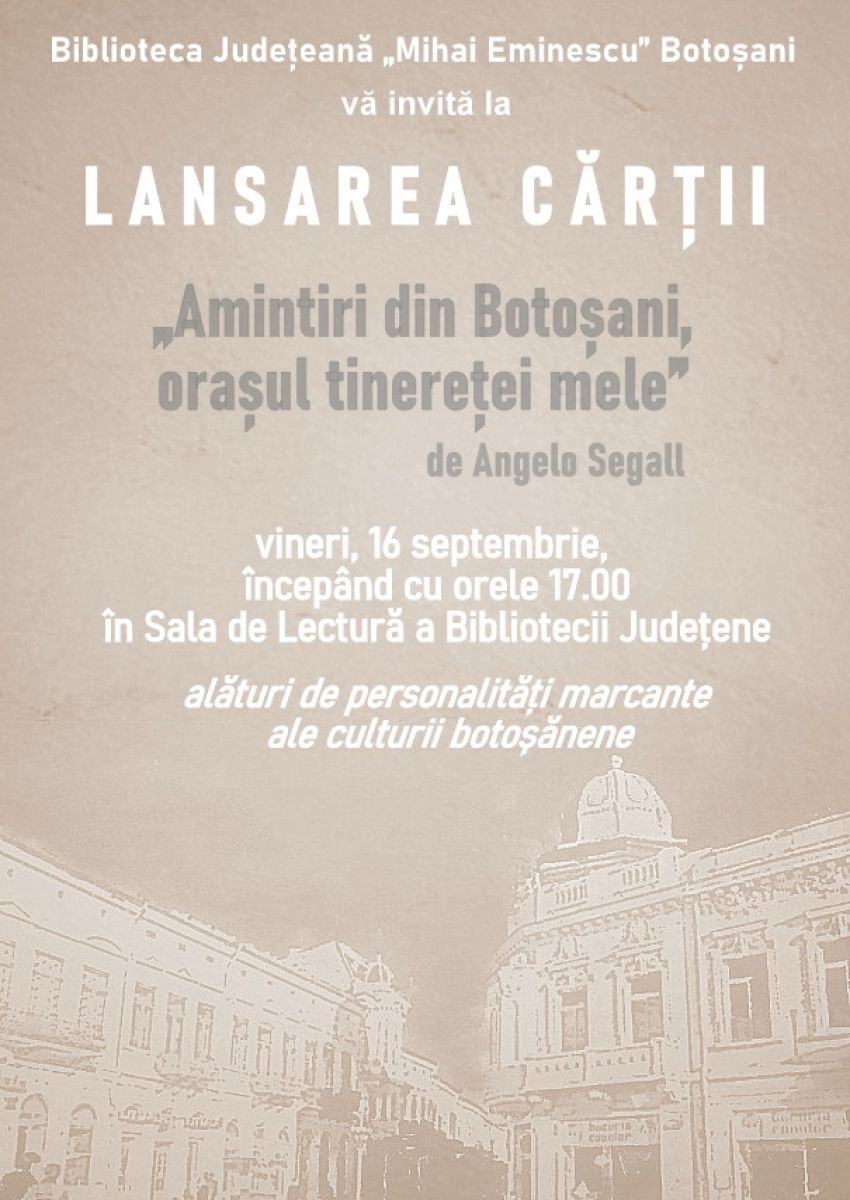 Vineri, 16 septembrie, începând cu ora 17.00, în Sala de Lectură a Bibliotecii Județeane "Mihai Eminescu" Botoșani are loc lansarea unei cărți omagiale la adresa orașului de odinioară - "Amintiri din Botoșani, orașul tinereții mele".