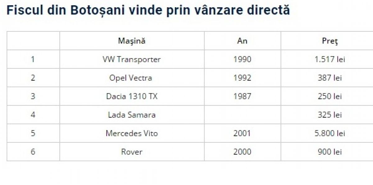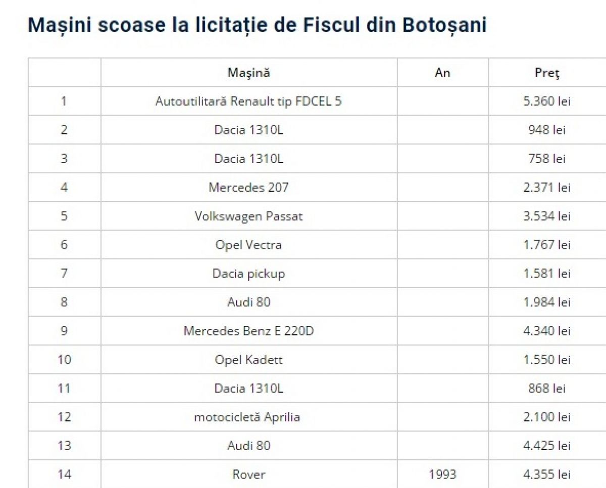 Fiscul scoate din nou la vânzare câteva zeci de mașini, oferta fiind variată, de la Dacia 1310 și Moskvich la Audi, BMW și Mercedes. Licitaţia va fi organizată la Botoşani.