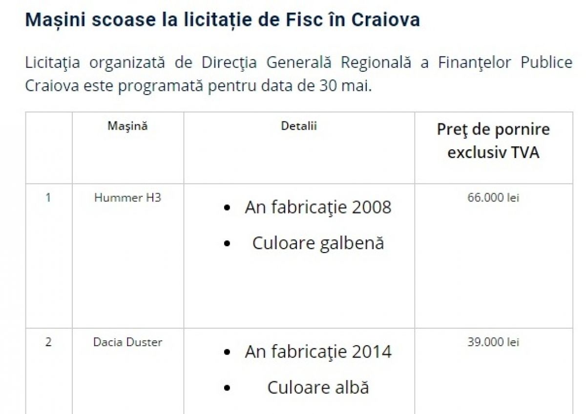 Prețurile variază de la 250 de lei la 7.550 lei. Vedete sunt însă o motocicletă Aprilia și un Hummer H3, acesta din urmă având un preț de pornire în cadrul licitației de 66.000 de lei, fără TVA. Cele mai multe dintre aceste mașini, 25, sunt scoase la vânzare de Administrația Județeană a Finanțelor Publice Botoșani, prin licitație sau vânzare directă. De asemenea, Direcția Generală Regională a Finanțelor Publice Craiova vinde prin licitație două mașini, Hummer H3 și Dacia Duster.