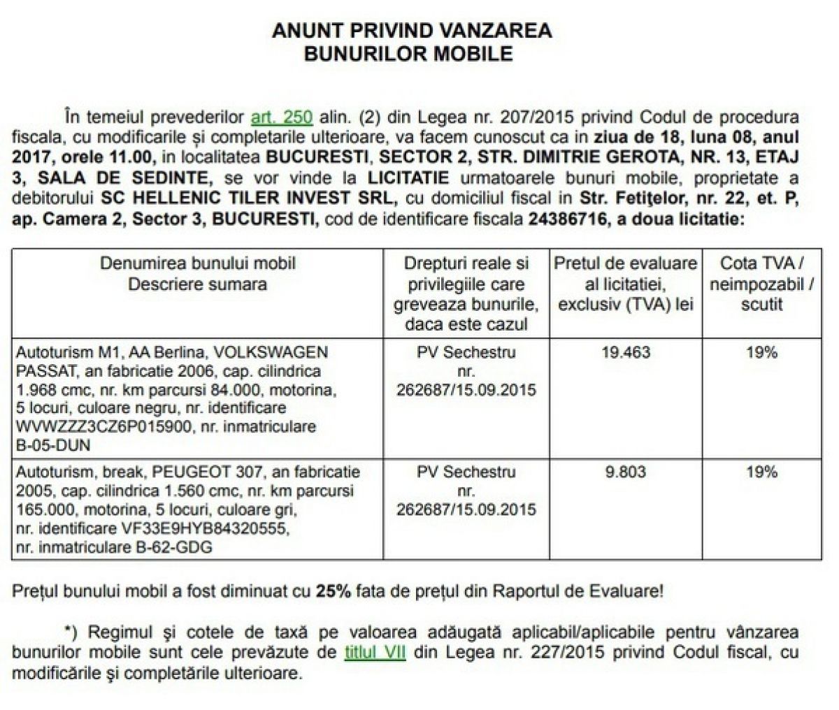 La sediile Agentiei Nationale de Administrare Fiscala (ANAF) au loc in aceasta perioada numeroase licitatii, prin intermediul carora institutia vrea sa vanda diferite bunuri apartinand debitorilor persoane fizice sau juridice. De altfel, printre bunurile sechestrate de Fisc se gasesc mai multe proprietati imobiliare si autoturisme care nu si-au gasit cumparator in urma unei prime licitatii, astfel ca este nevoie de organizarea altora.