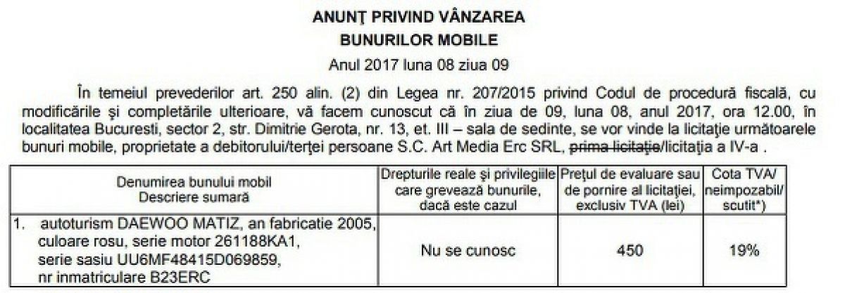 Totodata, cei interesati sa achizitioneze bunul scos la licitatie se vor prezenta la data stabilita si locul fixat pentru vanzare si cu o dovada emisa de creditorii fiscali cum ca nu au obligatii fiscale restante, precum si o imputernicire (procura speciala) pentru persoana care il reprezinta pe ofertant, daca este cazul.