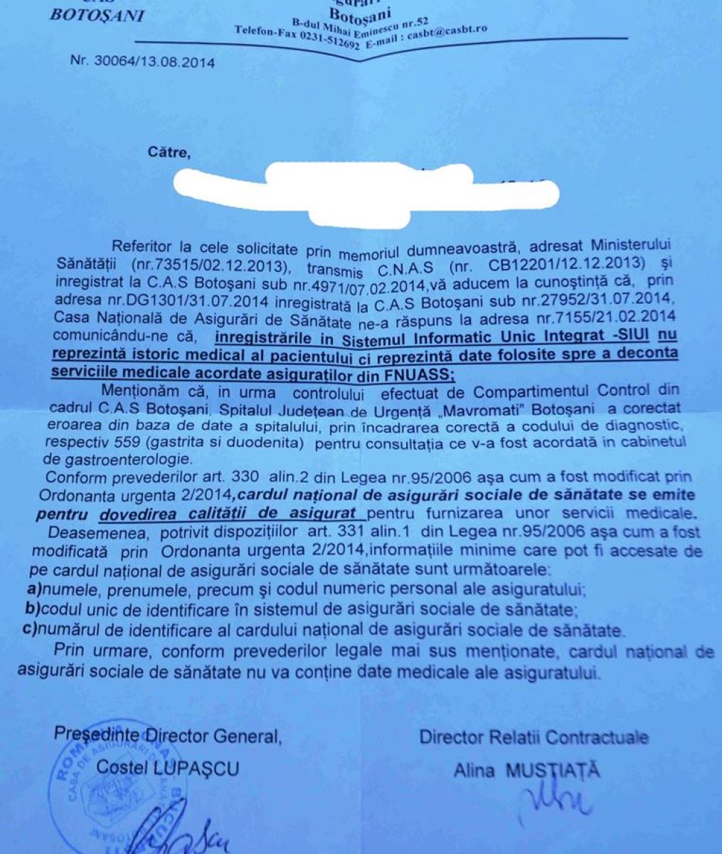 „Din cadrul spitalului acest diagnostic a fost modificat, însă în Sistemul Informatic Unic Integrat (SIUI) Naţional, acest lucru nu se mai poate şterge fiindcă e ca şi cum ai face un CD, după ce îl termini nu îl mai poţi modifica”, explica Costel Lupaşcu, pe atunci preşedintele CAS.