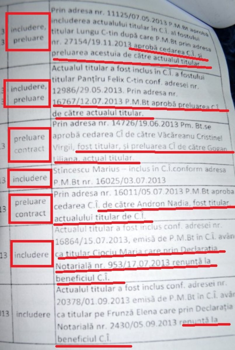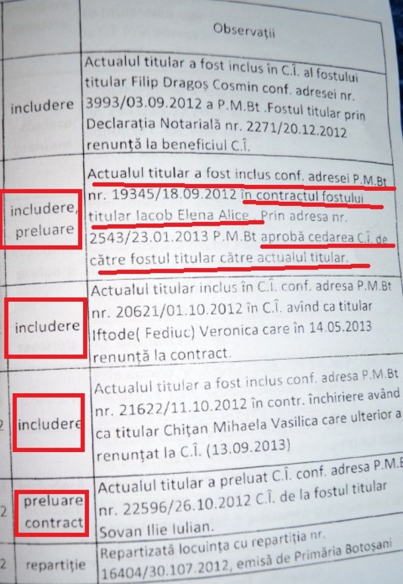Exact așa cum am prezentat și într-o anchetă anterioară, sub pretextul că solicitantul dorea să-și perfecteze actele de identitate, se aproba o includere în spațiul locativ. Iar mai departe, titularul de contract renunța la înțelegerea contractuală cu SC Locativa SA, iar aceasta era preluată de celălalt chiriaș, adică cel primit în locuință prin includere. Astfel, deși potrivit listei de așteptare cu vreo 2.000 de oameni, respectivul nu avea dreptul să intre în acel moment într-o locuință ANL, reușea totuși acest lucru.