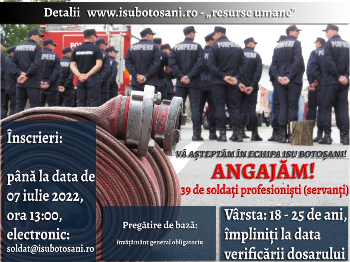Vârsta cuprinsă între 18 și 25 de ani și o pregătire fizică foarte bună - acestea sunt două dintre condițiile pe care trebuie să le îndeplinească tinerii care vor să devină soldați profesioniști (servanți) în cadrul Inspectoratului pentru Situații de Urgență „Nicolae Iorga” al județului Botoșani.